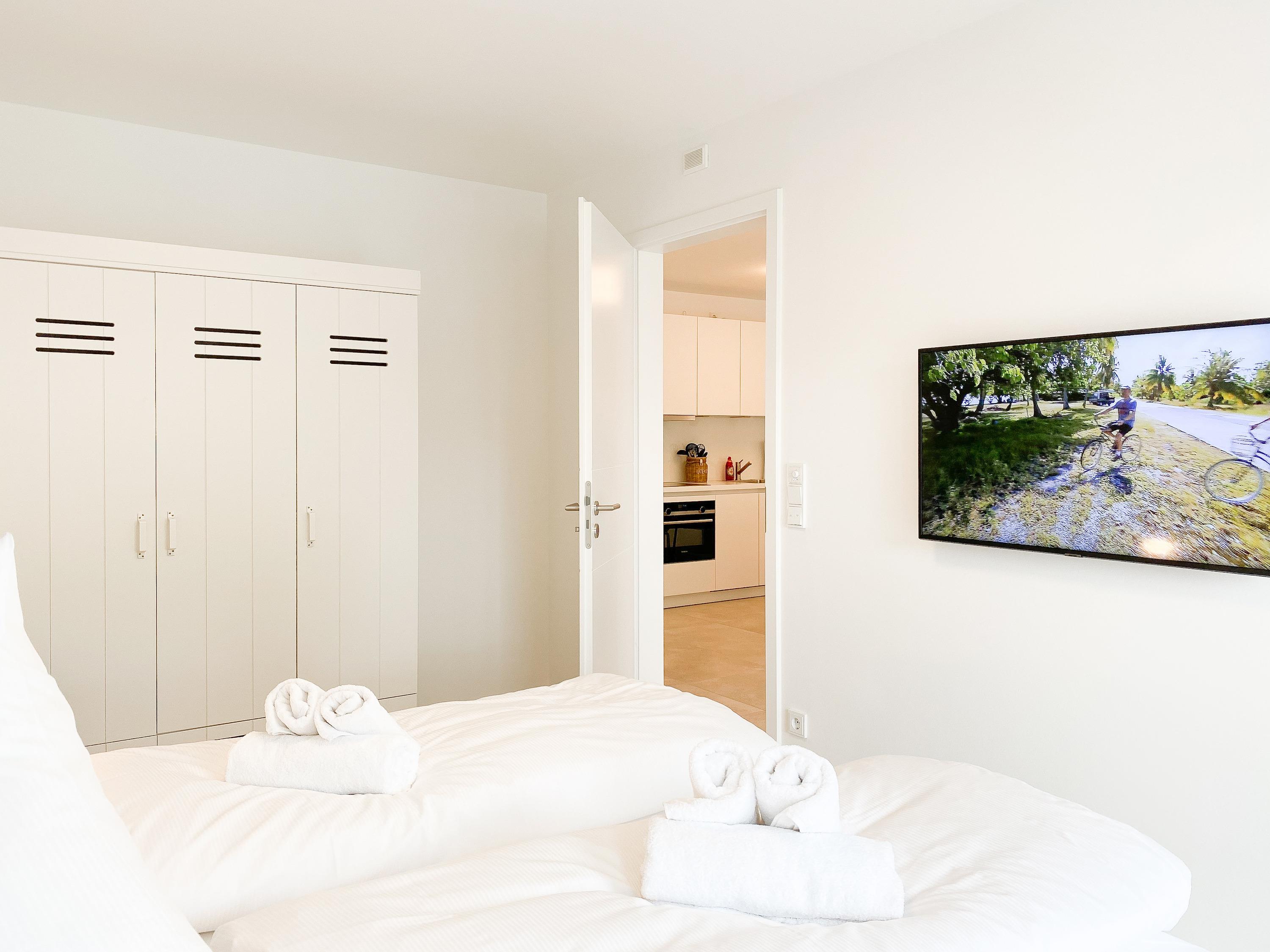 Die Ferienwohnung Wohnen am Strand 5 befindet sich im ersten Obergeschoss und bietet mit einem Schlafzimmer, ausgestattet mit einem Boxspringbett (180x200 )[nbsp][nbsp]und TV sowie einem bequemen Schlafsofa im Wohnbereich (140x185), [nbsp]jeglichen Komfort für 3 bis 4 [nbsp]Personen, um einen entspannten Urlaub zu verleben. Der hochwertig eingerichtete Wohn- Essbereich bietet einen herrlichen Ausblick bis auf die Ostsee. Entspannen Sie auf Ihrem Balkon, der sich über die gesamte Breite der Wohnung erstreckt, Teilmeerblick, Brandungsrauschen und frische Ostseeluft inklusive.[nbsp] Es stehen insgesamt 2 TV, Radio und WLAN zur Verfügung. Die Wohnung ist mit Fußbodenheizung ausgestattet und alle Fenster sind mit elektrischen Außenjalousien versehen, die gleichermaßen für Verdunkelung oder Tageslicht mit Privatsphäre sorgen. Zur Wohnung gehört ein fester Tiefgaragenstellplatz (Einfahrtshöhe 1,90 m). Das Haus verfügt über einen Fahrstuhl und einen Fahrradkeller. Waschmaschine und Trockner stehen kostenlos zur gemeinschaftlichen Nutzung[nbsp] zur Verfügung.
