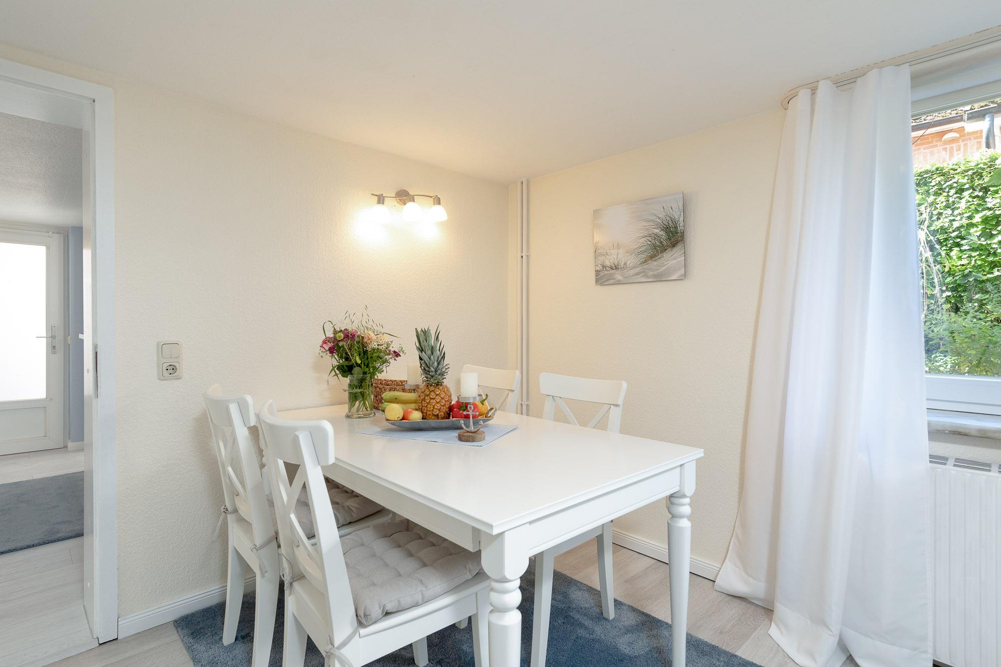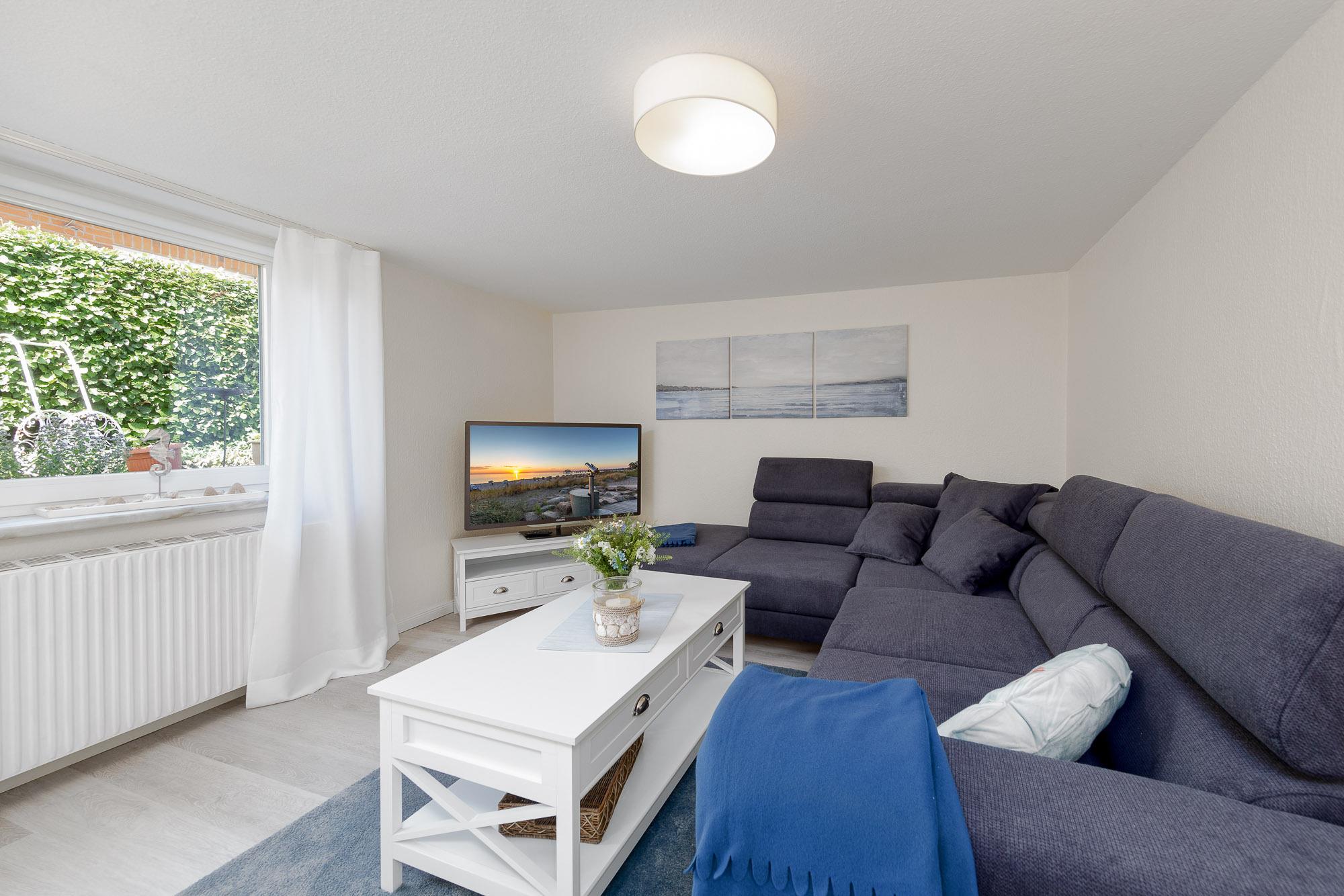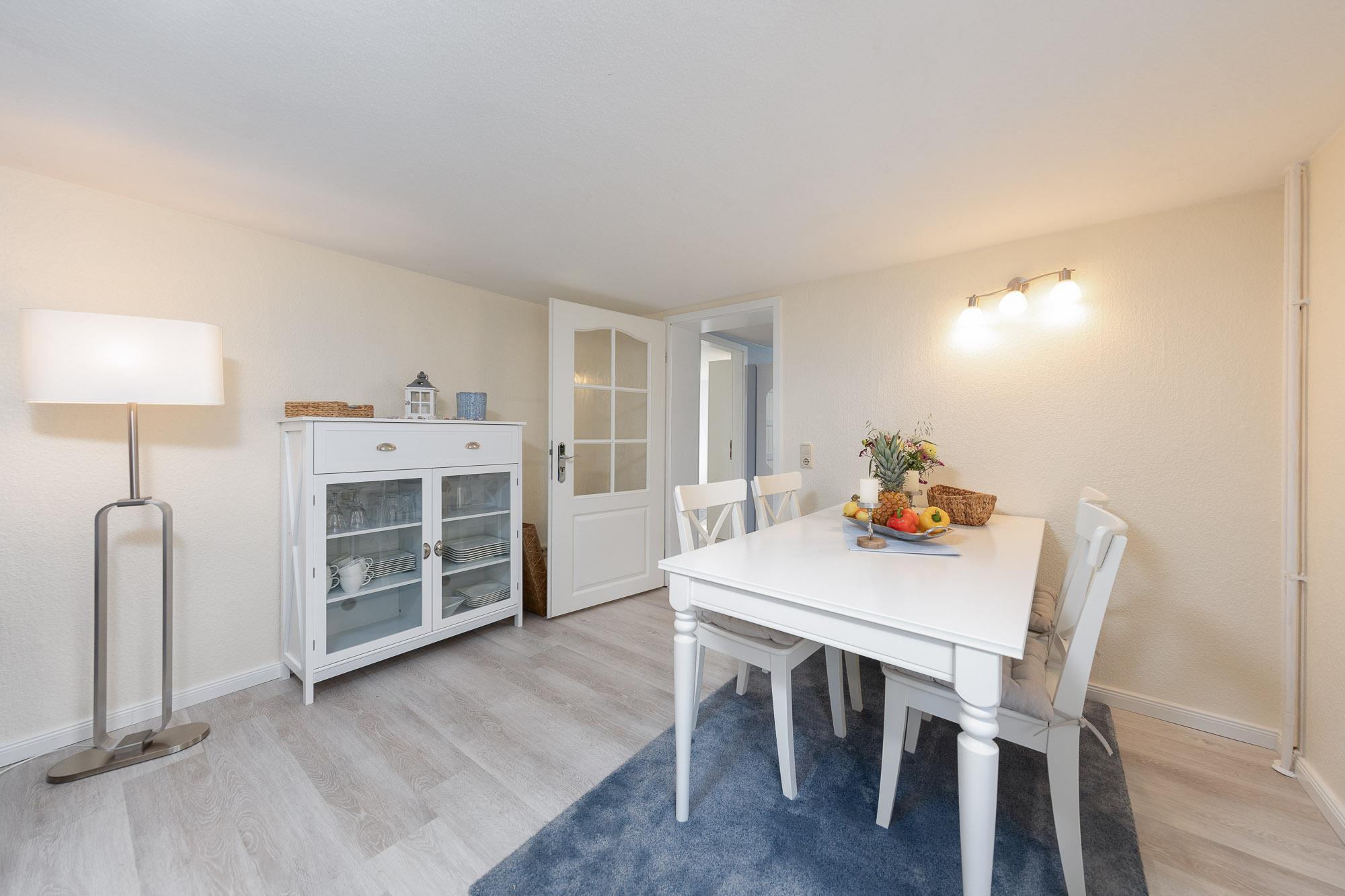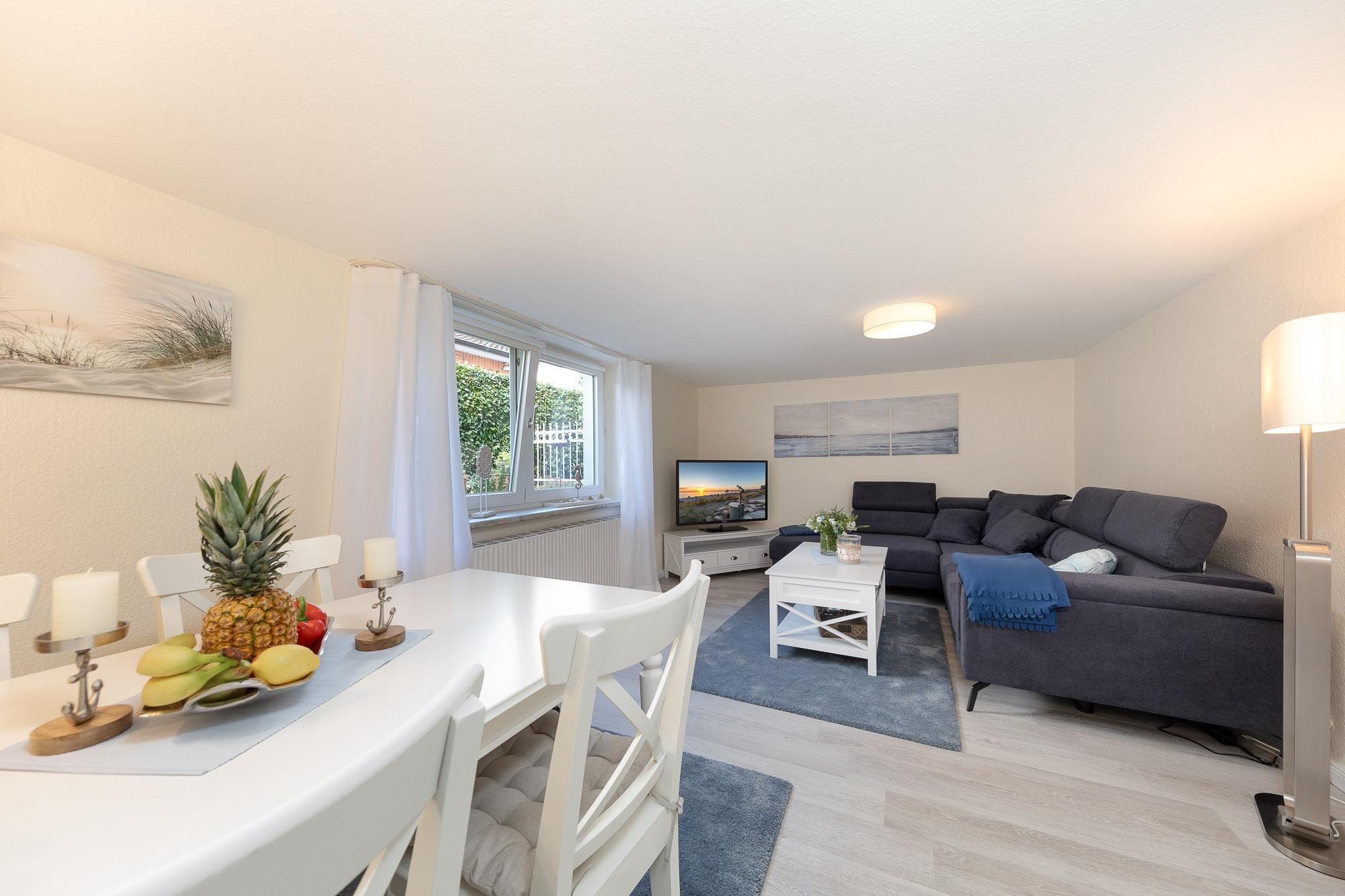 Bereits bei betreten der Diele startet die Erholung für Sie. Das Wohnzimmer bietet Ihnen eine komfortable Couchgarnitur, einen Flatscreen TV, ein Radio mit CD-Player sowie einen offenen Übergang in den angeschlossenen Essbereich.