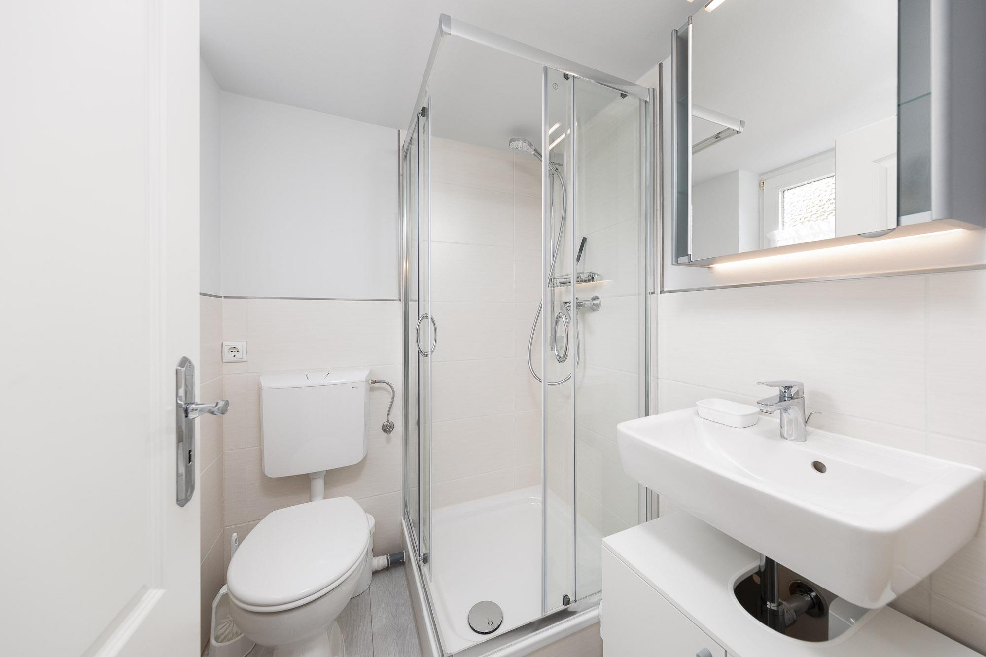 Das moderne Badezimmer dieses Feriendomizils bietet Ihnen ein WC sowie eine Dusche.