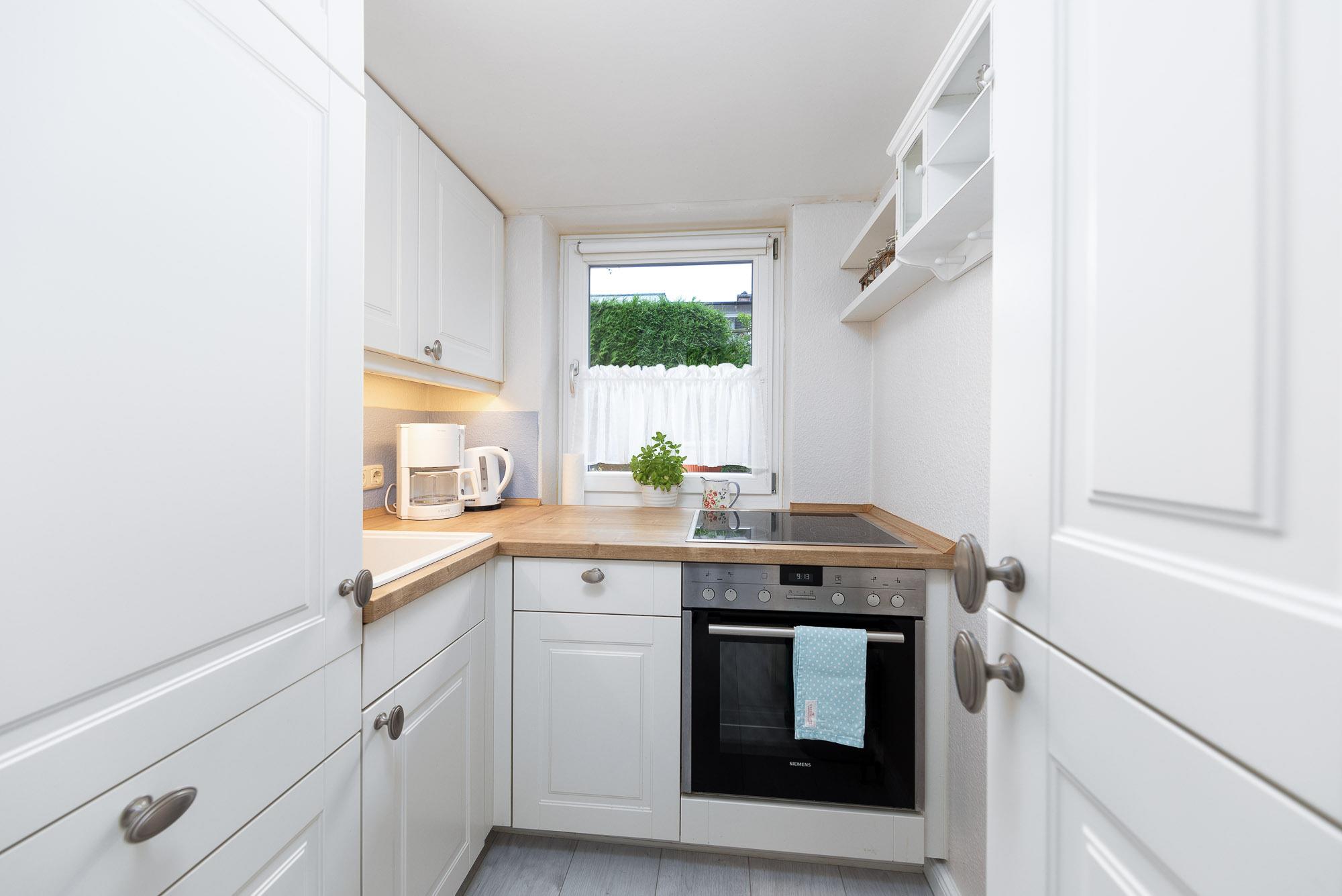 Die separate Küche ist unter anderem mit Ceranfeld, Backofen, Kühlschrank sowie Geschirrspüler ausgestattet. Darüber hinaus finden Sie eine Filter Kaffeemaschine, einen Wasserkocher sowie einen Toaster vor.