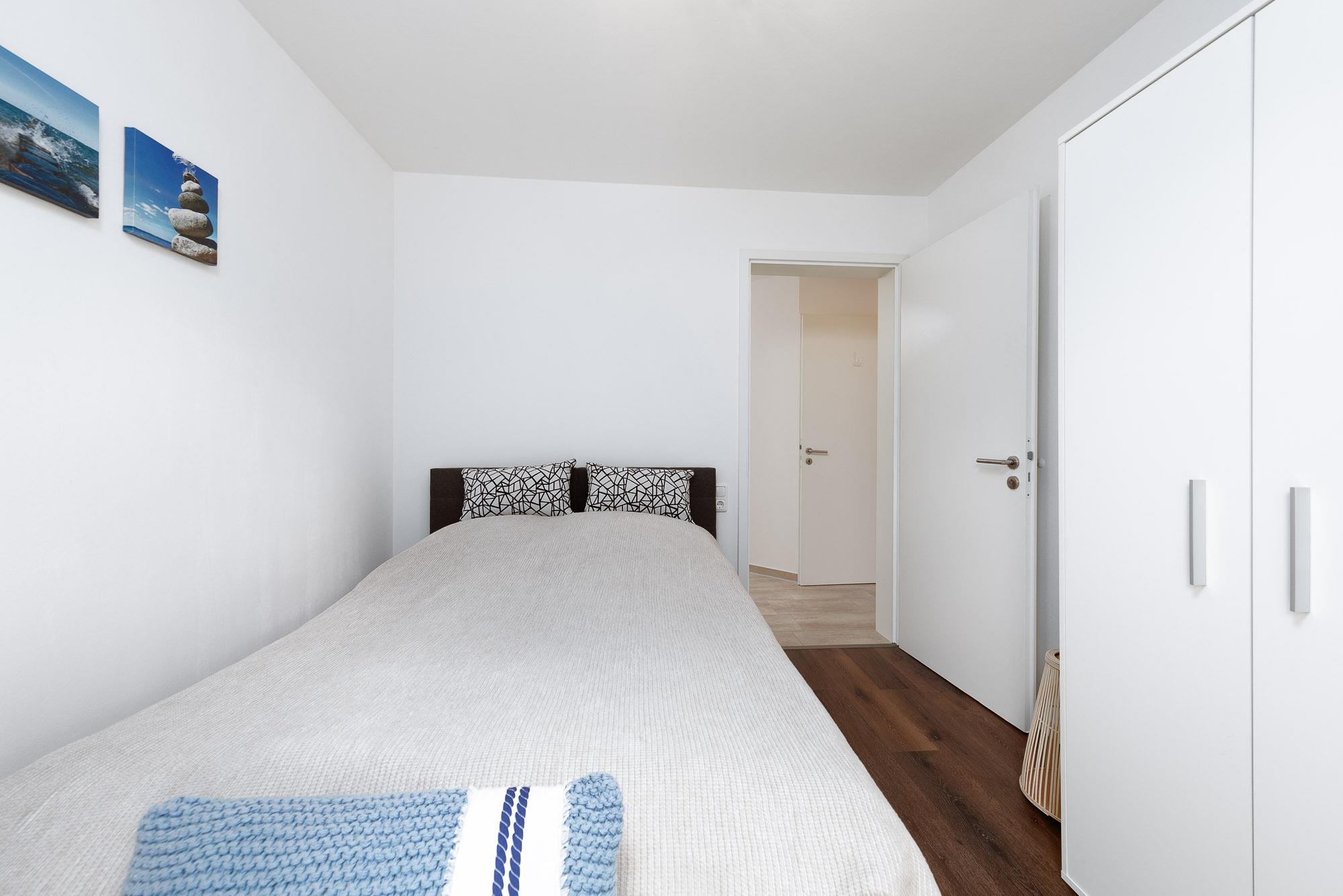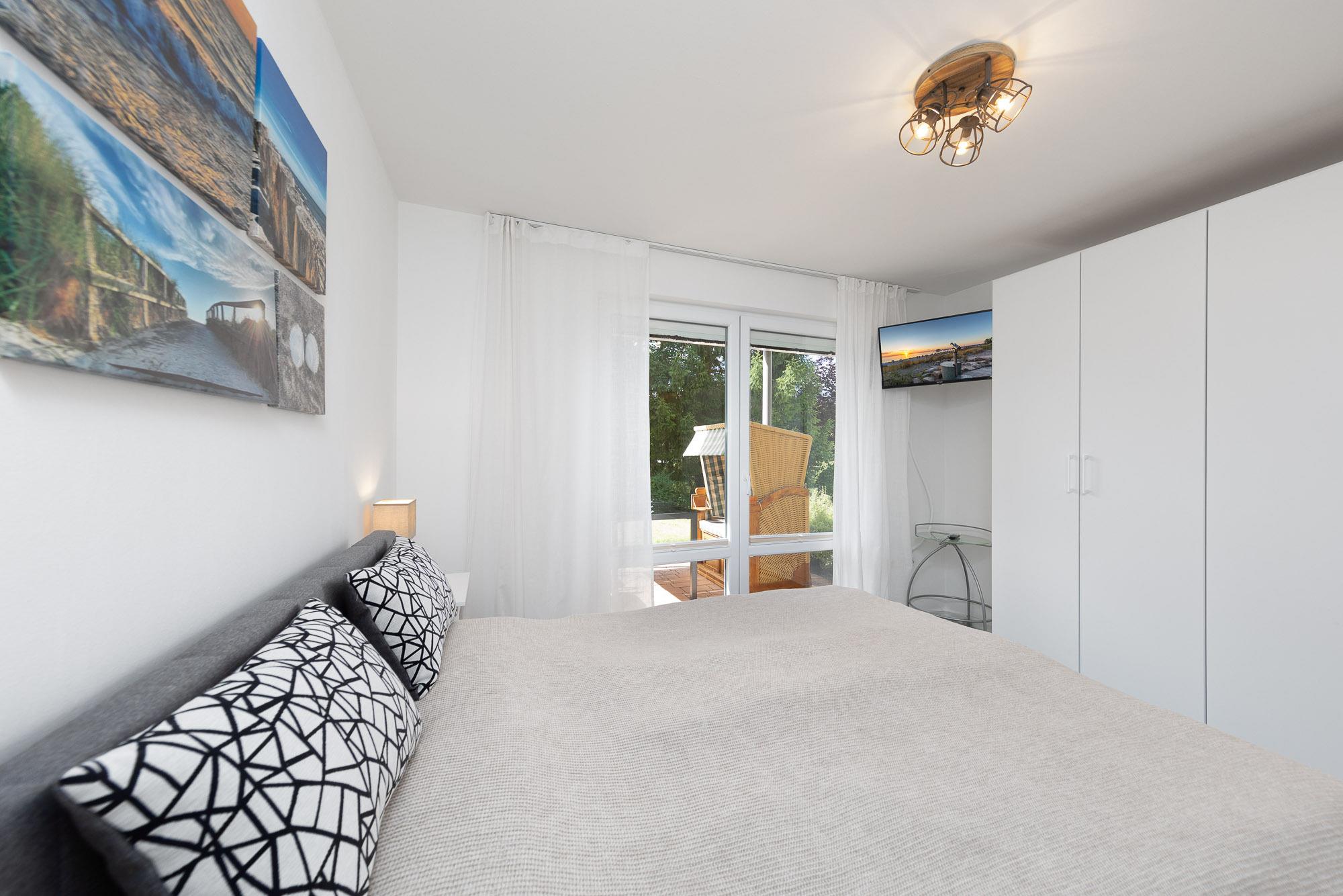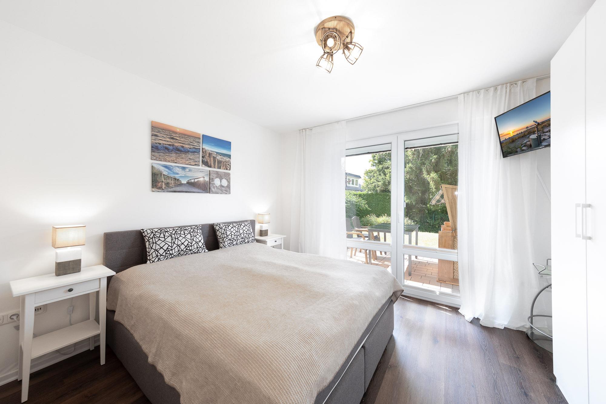 Die Timmendorfer Strand Ferienwohnung bietet Ihnen insgesamt zwei Schlafzimmer. Das Schlafzimmer I ist mit einem Doppelbett (1,60 x 2,00m) sowie einem zusätzlichen TV ausgestattet. Das Schlafzimmer II bietet Ihnen ein schmaleres Doppelbett für Zwei (1,40 x 2,00m).
