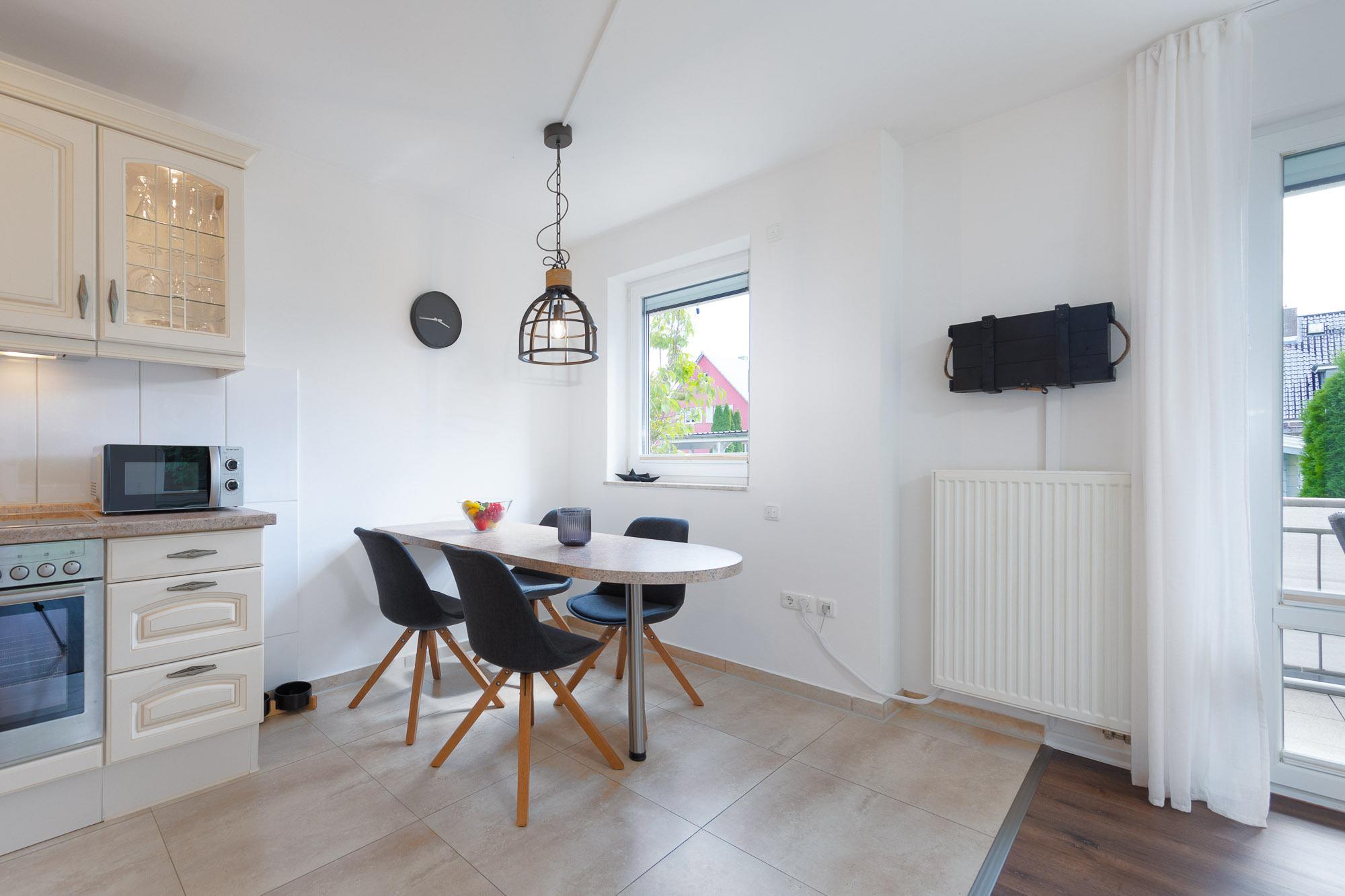 Die Küche ist offen zum Wohnraum und bietet Ihnen eine umfassende Ausstattung. Es erwarten Sie unter anderem Backofen, Cerankochfeld, Mikrowelle und Geschirrspüler - von hier aus gelangen Sie direkt in den angeschlossenen Essbereich.