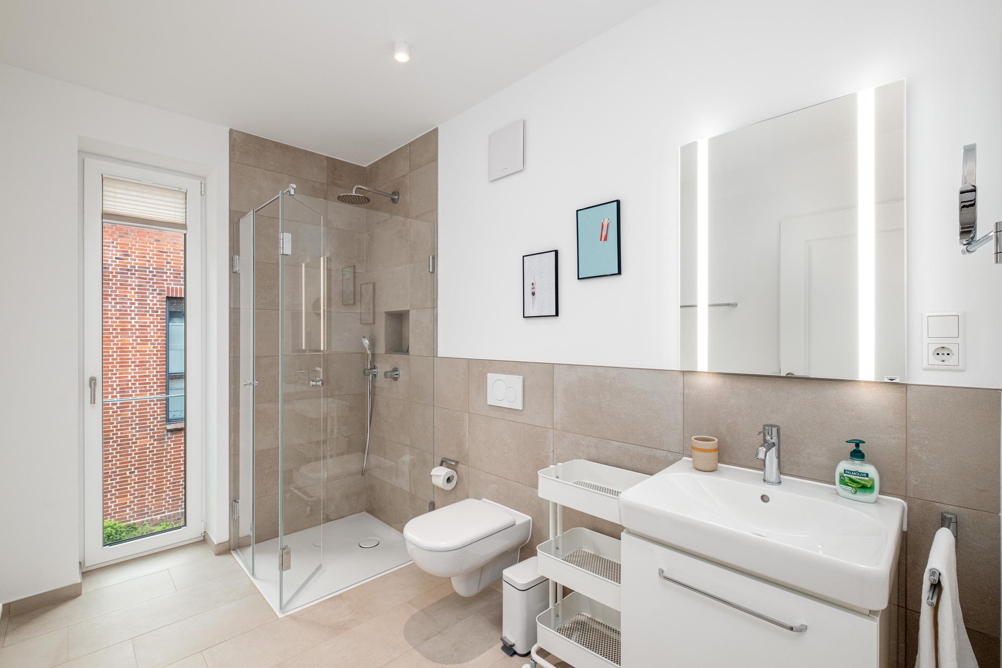 Die Timmendorfer Strand Ferienwohnung bietet Ihnen ein Badezimmer mit WC, Dusche und Handtuchwärmer.