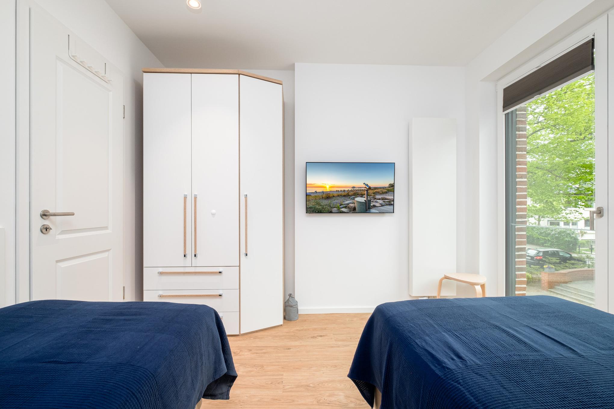 Das Schlafzimmer I bietet Ihnen mit einem hochwertigen Boxspringbett (180x200cm) sowie einem zusätzlichen 2. TV mit Smartfunktion eine Ruheoase für erholsame Stunden. Im Schlafzimmer II erwarten Sie zwei komfortable Einzelbetten (je 90x200cm) sowie ein 3. TV mit Smartfunktion. In beiden Schlafräumen haben Sie die Möglichkeit Ihr Gepäck in entsprechenden Kleiderschränken zu verstauen.