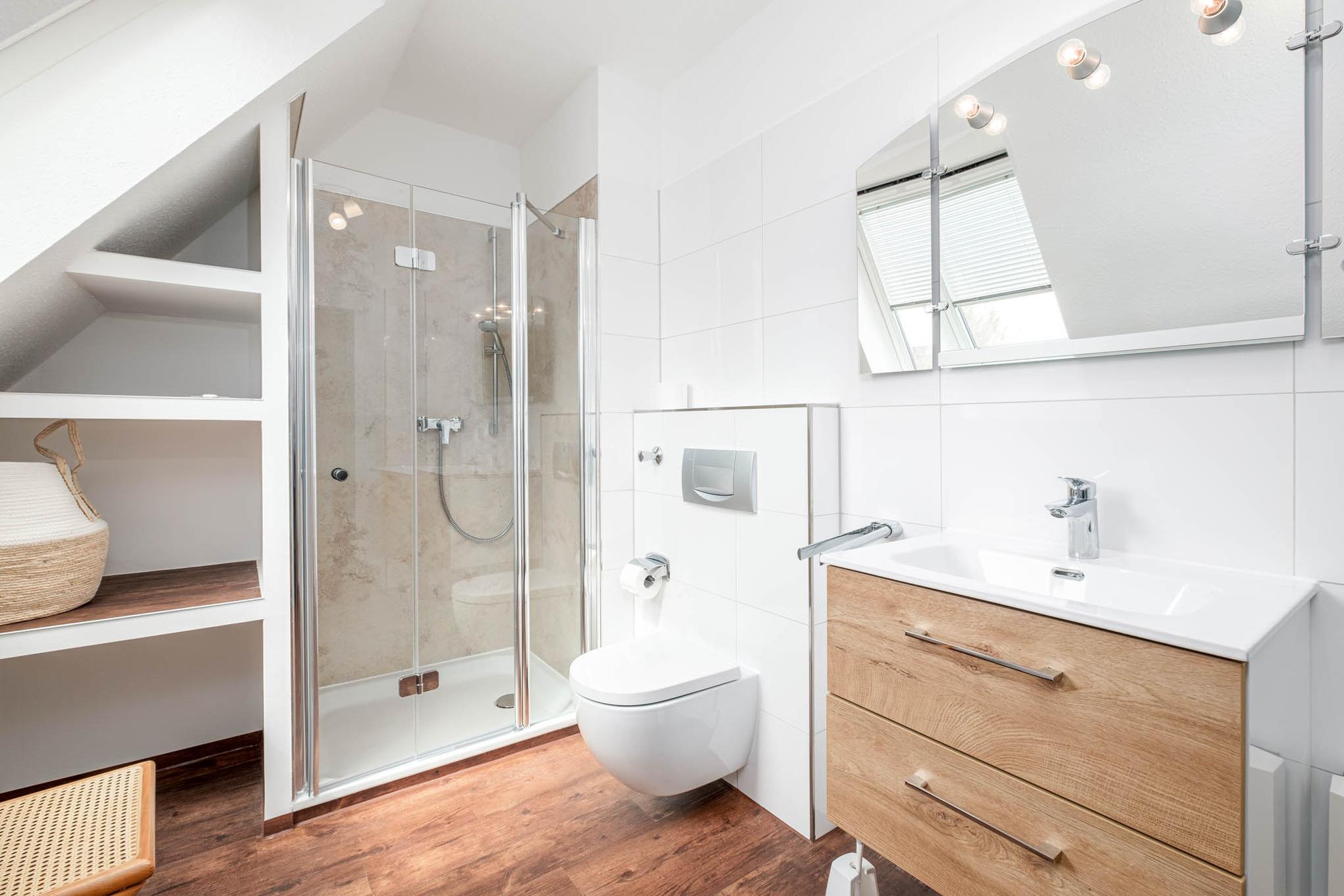 Darüber hinaus erwartet Sie in diesem Appartement ein Badezimmer mit Dusche und WC.