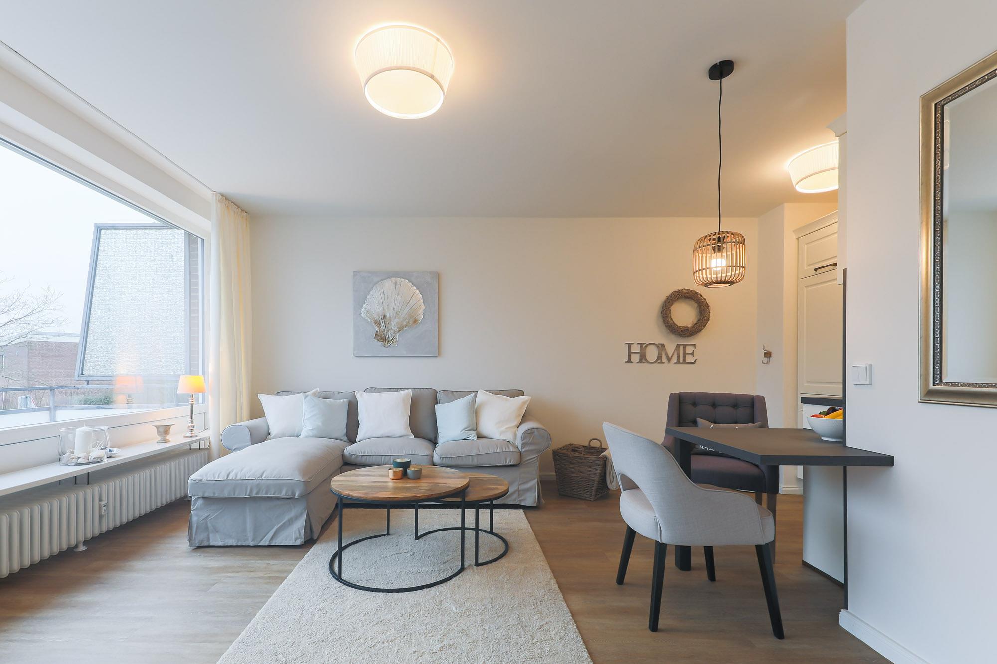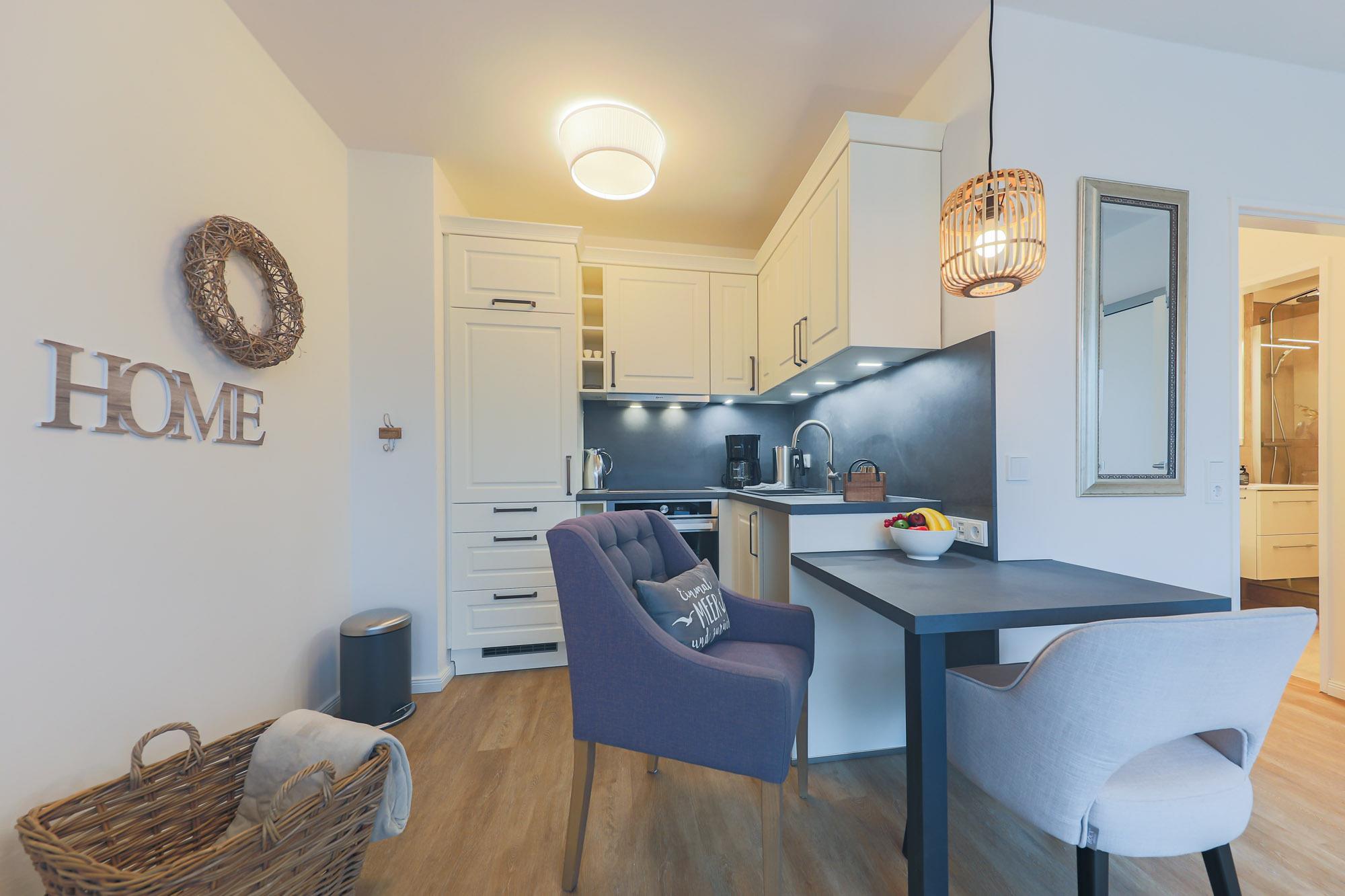 Die 2-Zimmer-Ferienwohnung befindet sich im 1. Obergeschoss, verfügt über ca. 40qm Wohnfläche und ist für max. 2 Personen ausgestattet. Das Wohnzimmer ist komfortabel eingerichtet mit Couchgarnitur, Flachbild-TV, Radio und einem kleinen Esstisch für zwei Personen. Eine offene, hochwertige Einbauküche mit Induktionskochfeld, Backofen, Geschirrspüler, Toaster, Kaffeemaschine und Wasserkocher ist in den Wohnraum integriert.