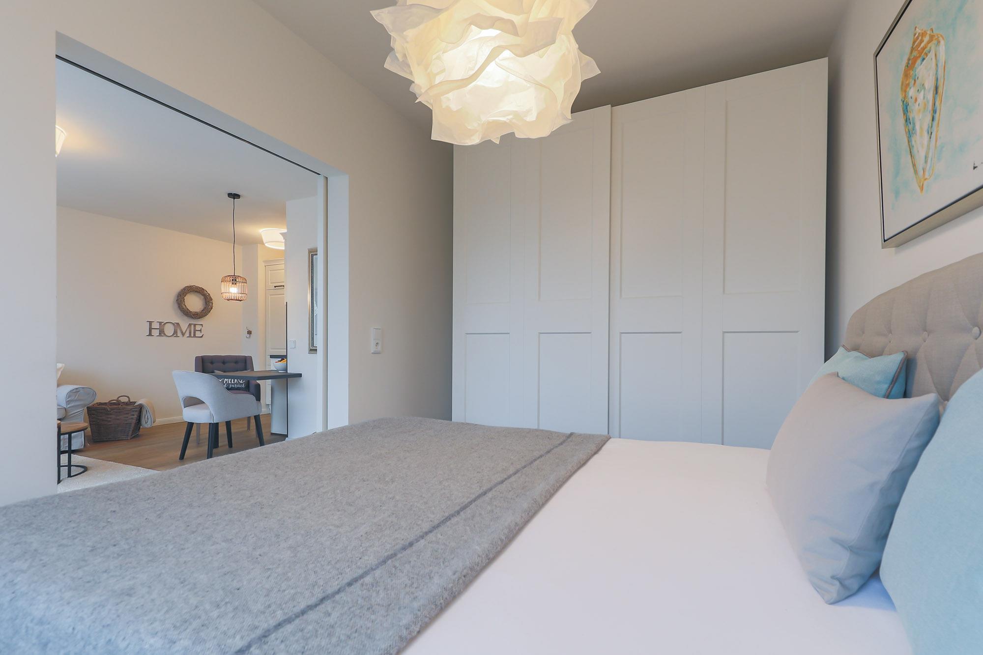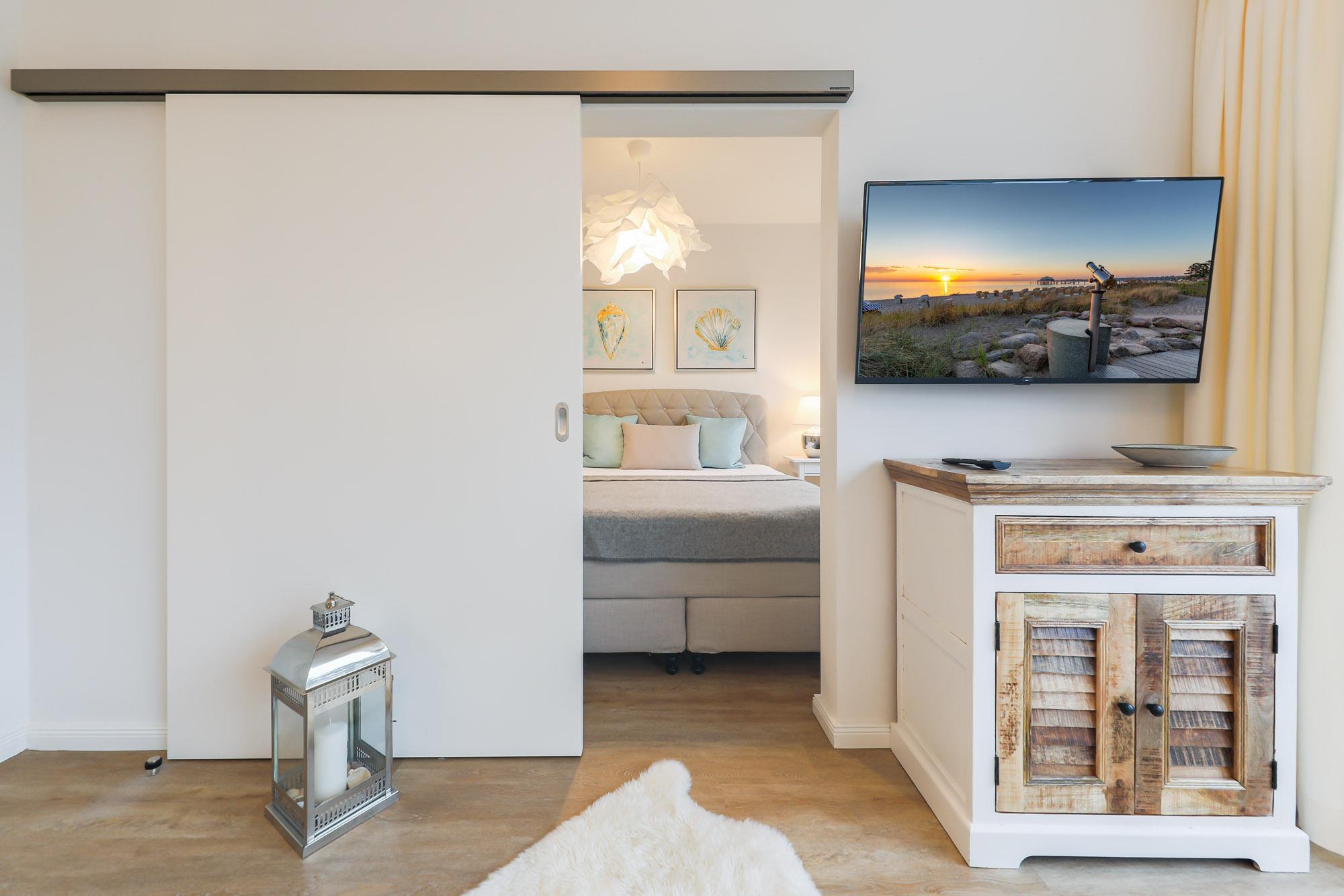 In diesem Urlaubsdomizil steht ein separates Schlafzimmer mit komfortablem Boxspringbett (160x200cm) zur Verfügung. Das Schlafzimmer ist vom Wohnzimmer durch eine Schiebetür getrennt. Für das Boxspringbett wird ein Spannbettlaken im Maß 160x200cm benötigt. Um Ihnen einen erholsamen Schlaf zu garantieren lässt sich das Schlafzimmer durch Außenjalousien abdunkeln.