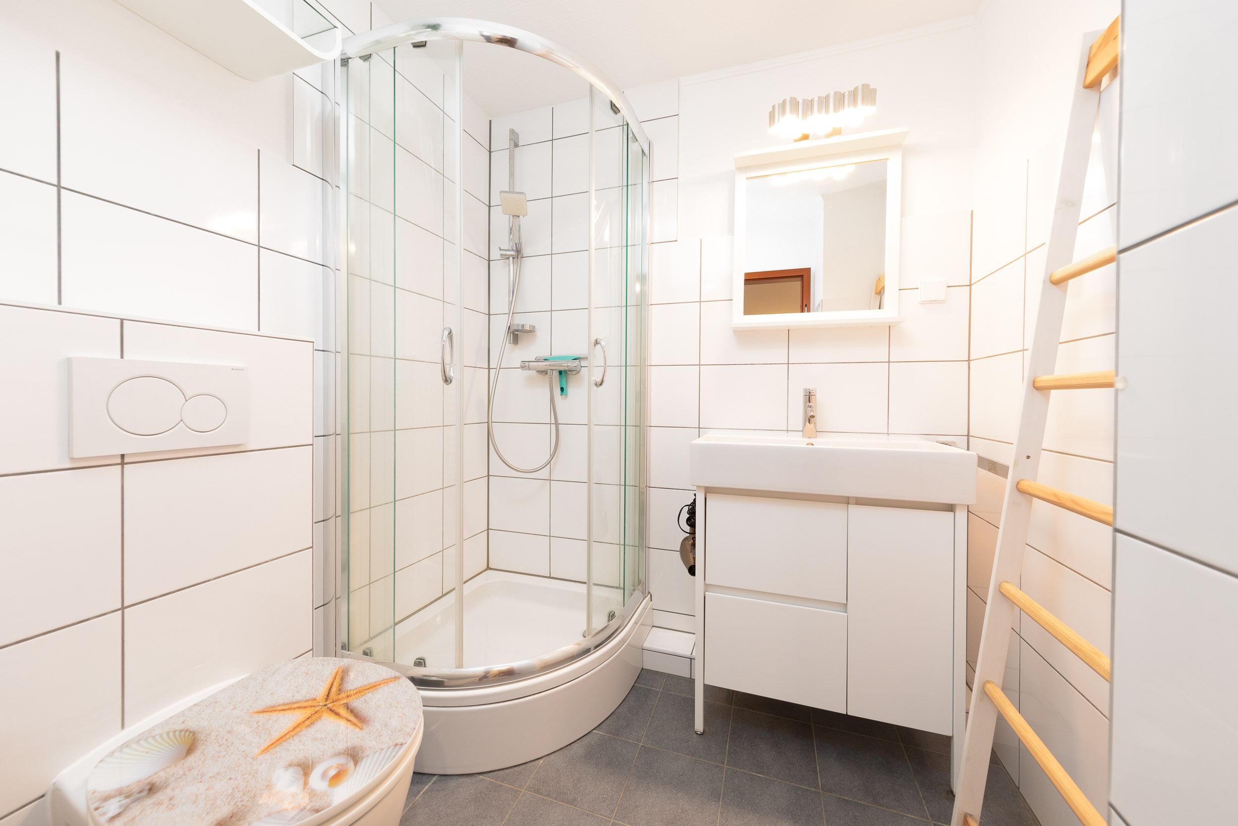 Darüber hinaus erwartet Sie in diesem Appartement ein helles, maritim gestaltetes Badezimmer mit Dusche sowie ein WC.