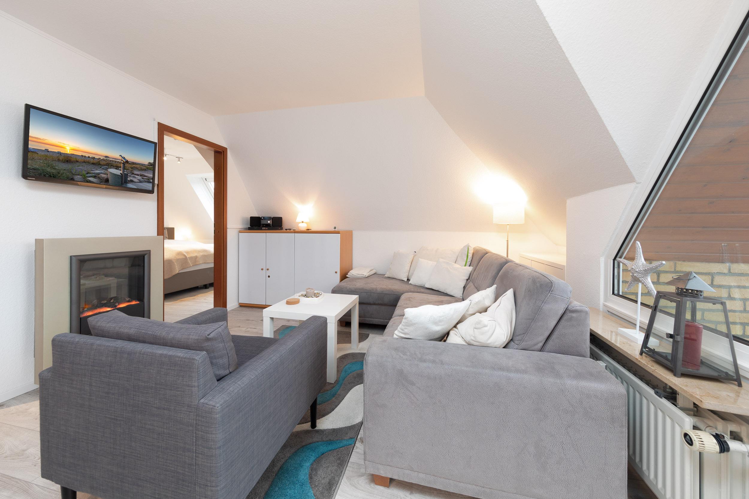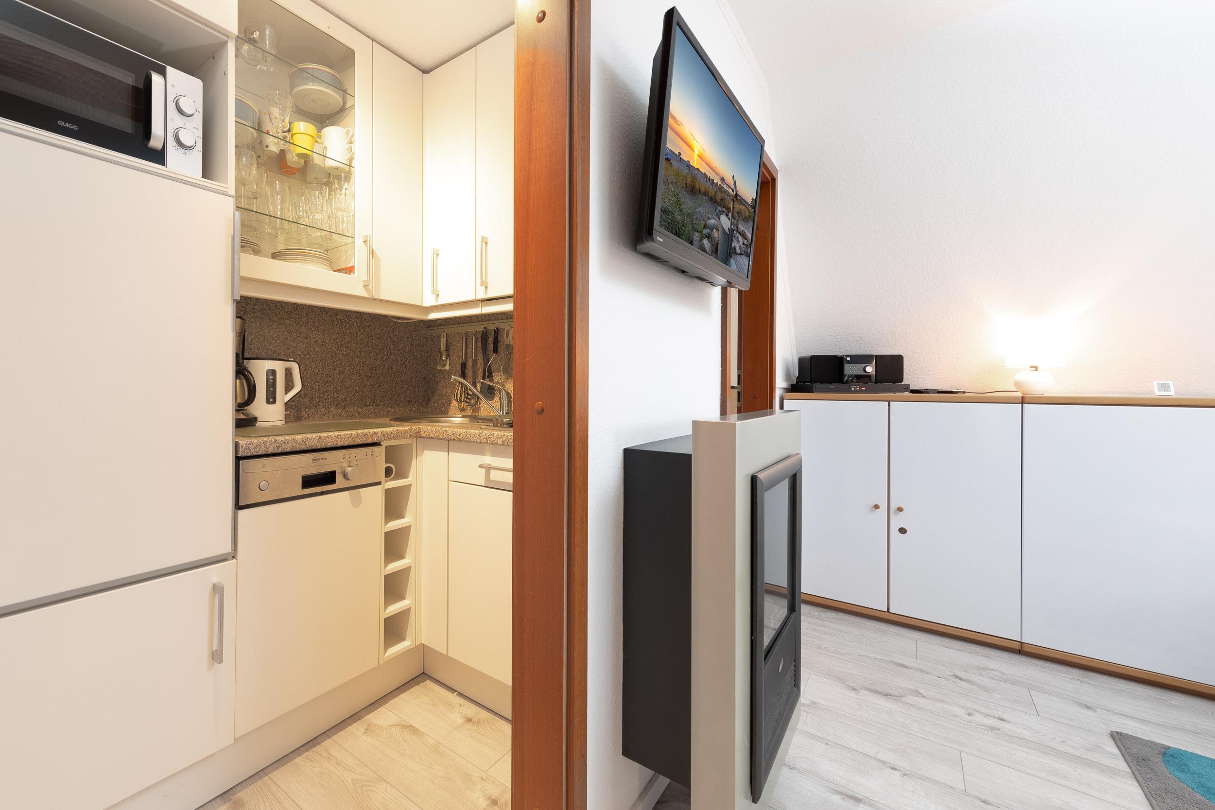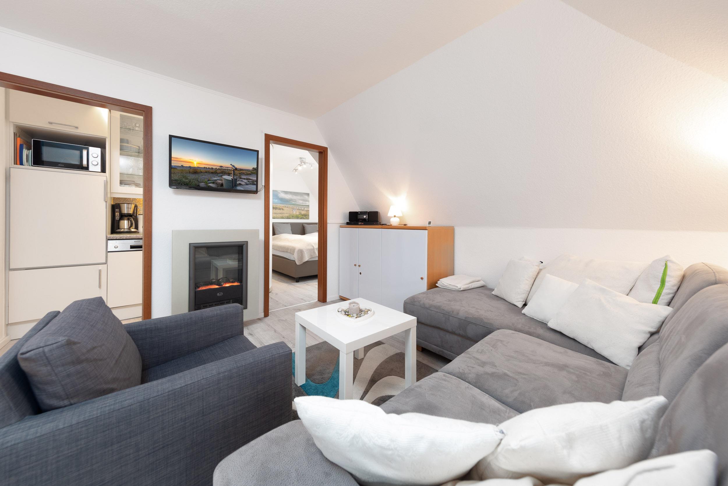 Den Mittelpunkt dieser Ferienunterkunft bildet das gemütliche und komfortabel eingerichtete Wohnzimmer mit großzügiger Couch, Flachbild-TV, Elektrokamin und angrenzendem Essbereich. Die offene Küche ist unter anderem mit 2-Platten Ceranfeld, Mikrowelle (ohne Backofenfunktion), Kühlschrank mit Gefrierfach und Geschirrspüler ausgestattet.