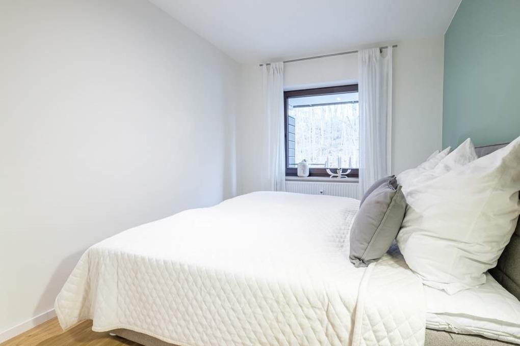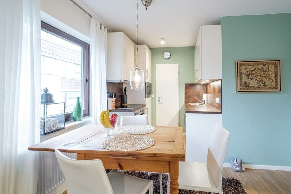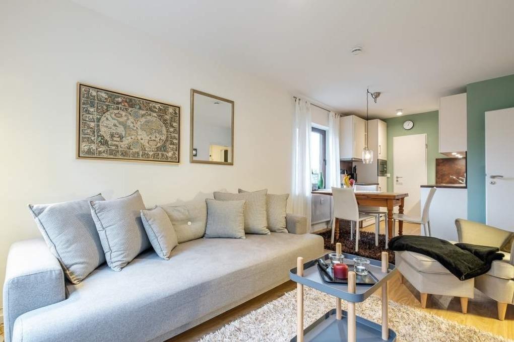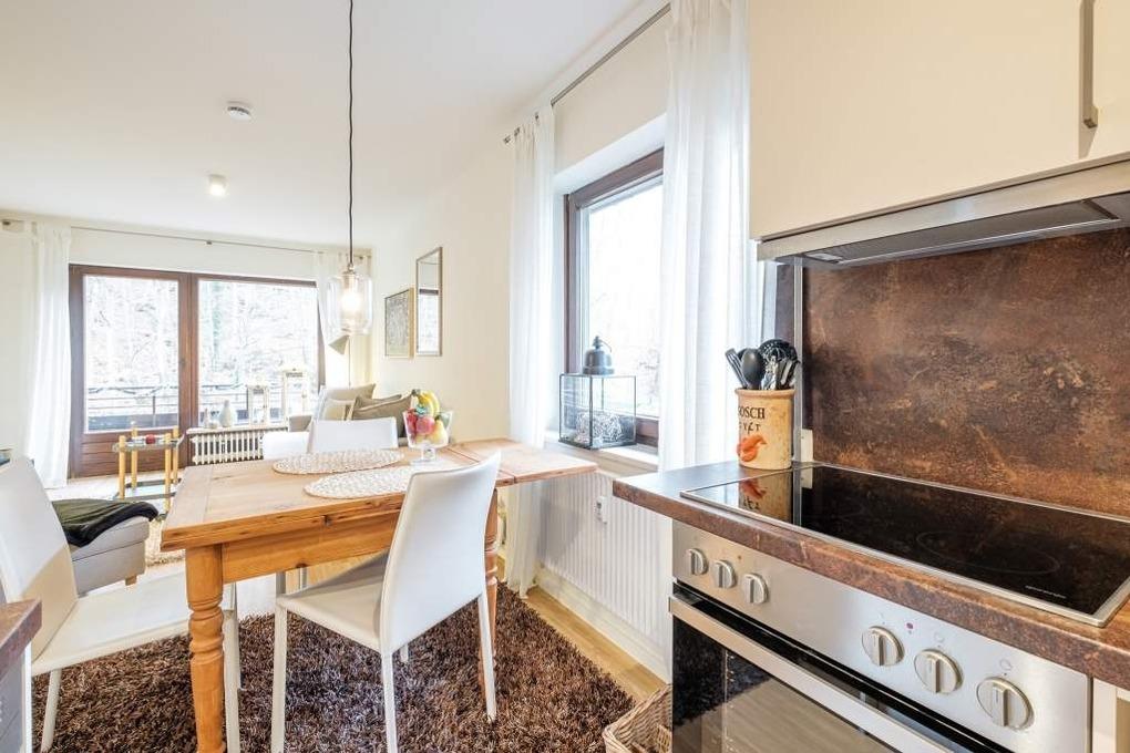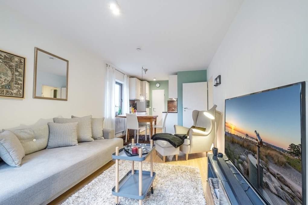 Das Urlaubsdomizil ist für bis zu vier Erwachsene und einen Hund ausgestattet. Der lichtdurchflutete Wohn- und Essbereich dieser Ferienwohnung verfügt über eine helle Couchgarnitur mit Schlaffunktion, einen Flachbild-TV, eine Hifi-Anlage mit Bluetooth und eine gemütliche Essecke mit offener Küche.