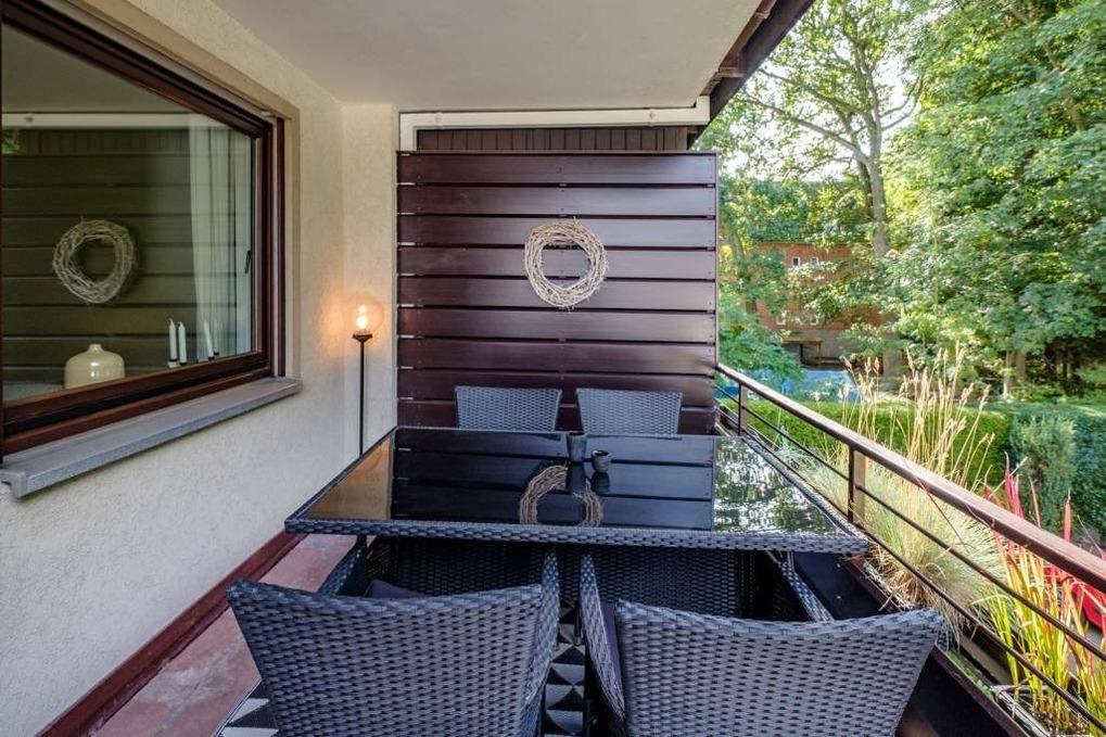 Auf dem möblierten Balkon, der in Süd-West-Richtung ausgerichtet ist, können Sie den ganzen Tag die Sonne genießen. Und wenn Sie einmal die Ruhe genießen möchten und sich nach etwas Schatten sehnen, rundet die Markise diese schöne Ferienwohnung in Timmendorfer Strand ab.