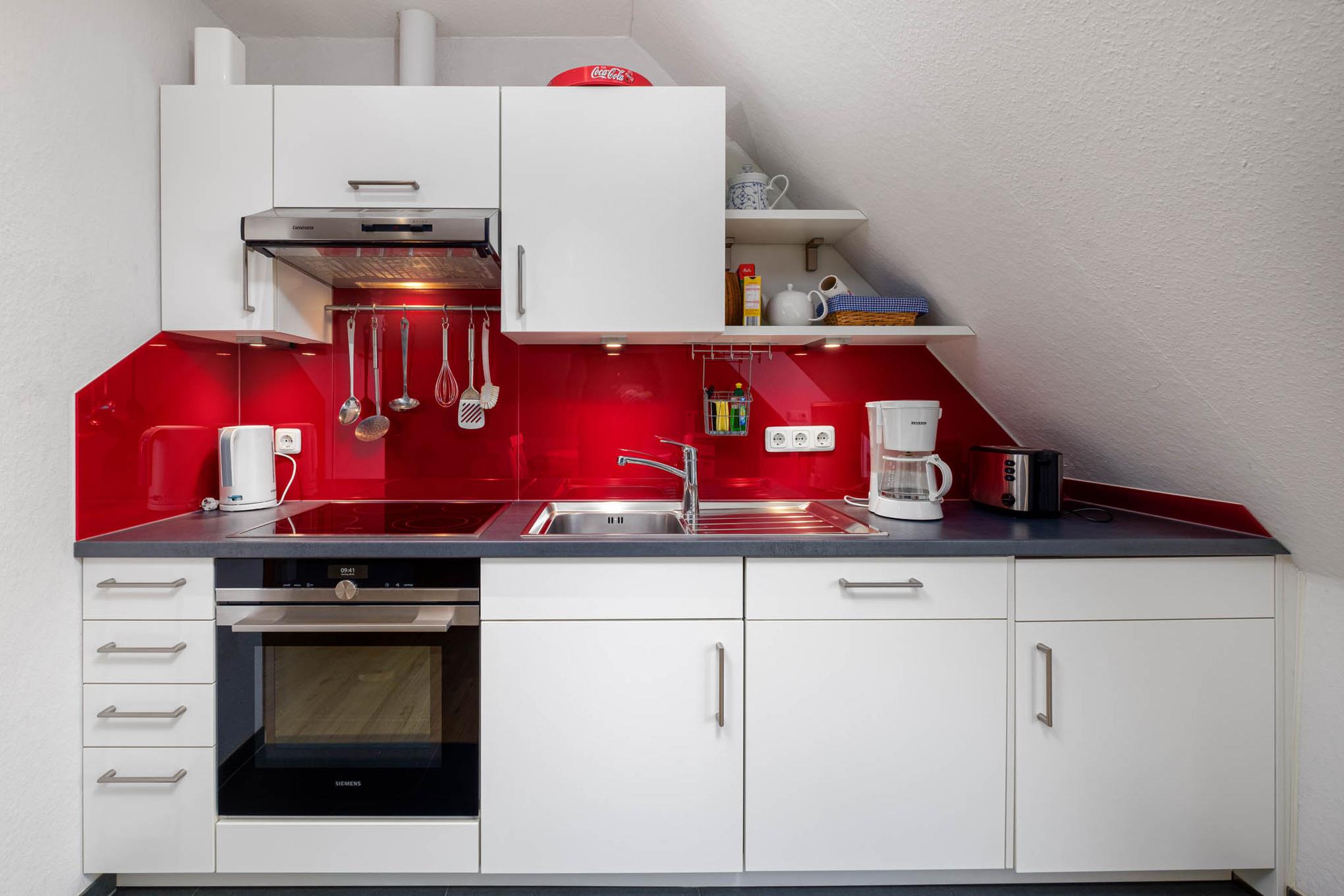 Das Appartement ist mit einer Küchenzeile mit Ceranfeld, Kühlschrank und Gefrierfach, Geschirrspüler, Kaffeemaschine, Wasserkocher und Toaster ausgestattet.