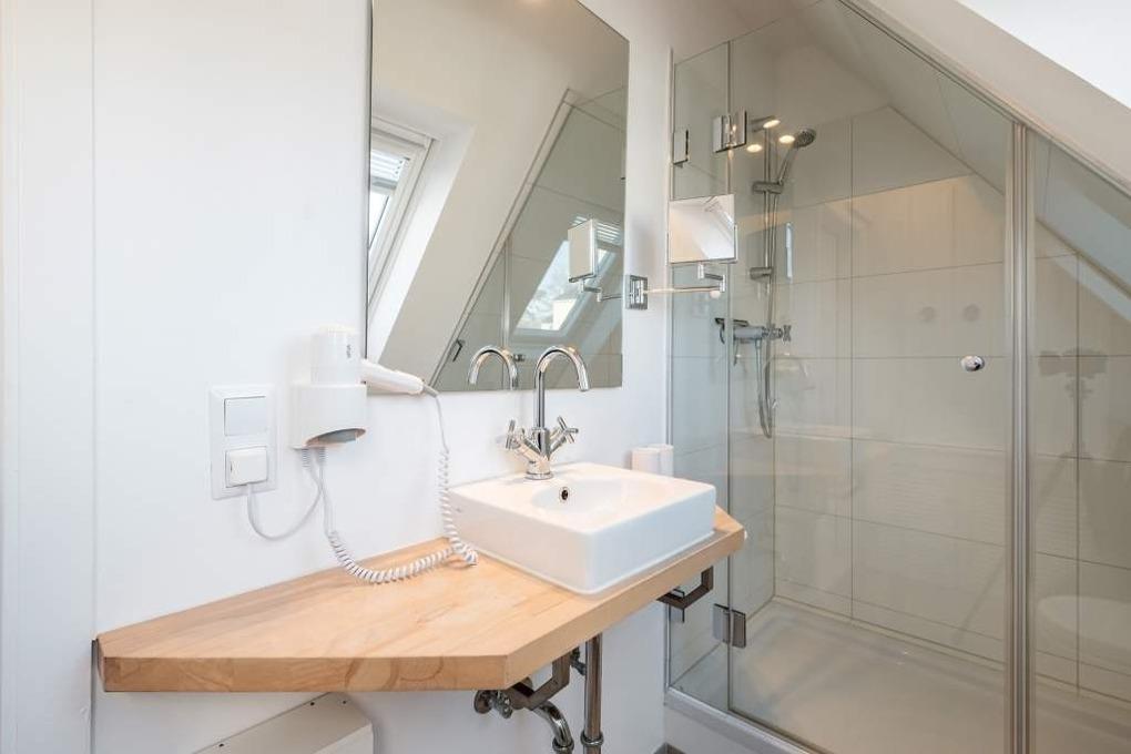 Das Badezimmer wirkt durch seine helle Gestaltung sehr freundlich und einladend. Hier stehen Ihnen neben einer Dusche mit Glasverkleidung ein Waschtisch mit Spiegel und ein Fön zur Verfügung.