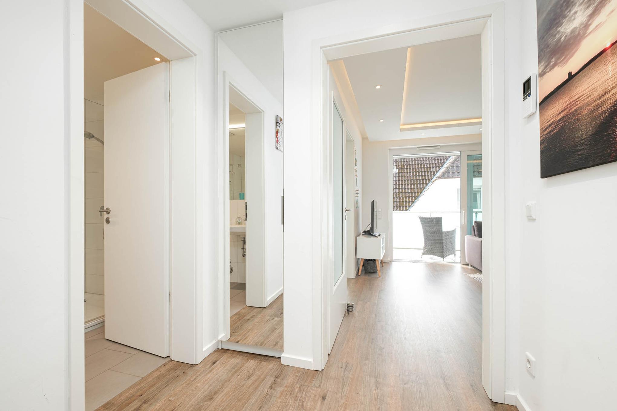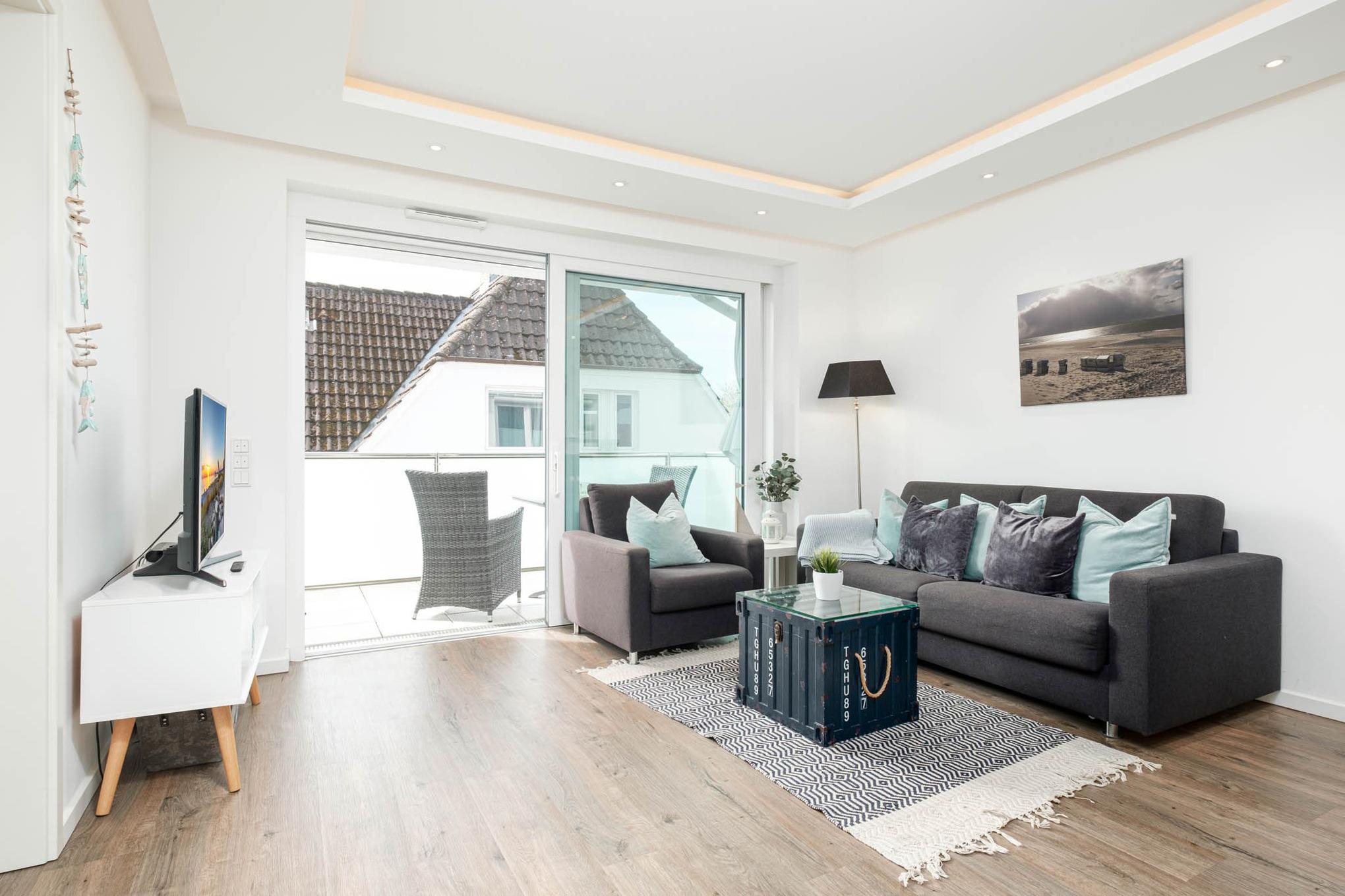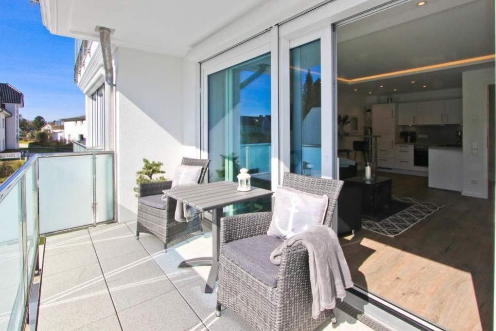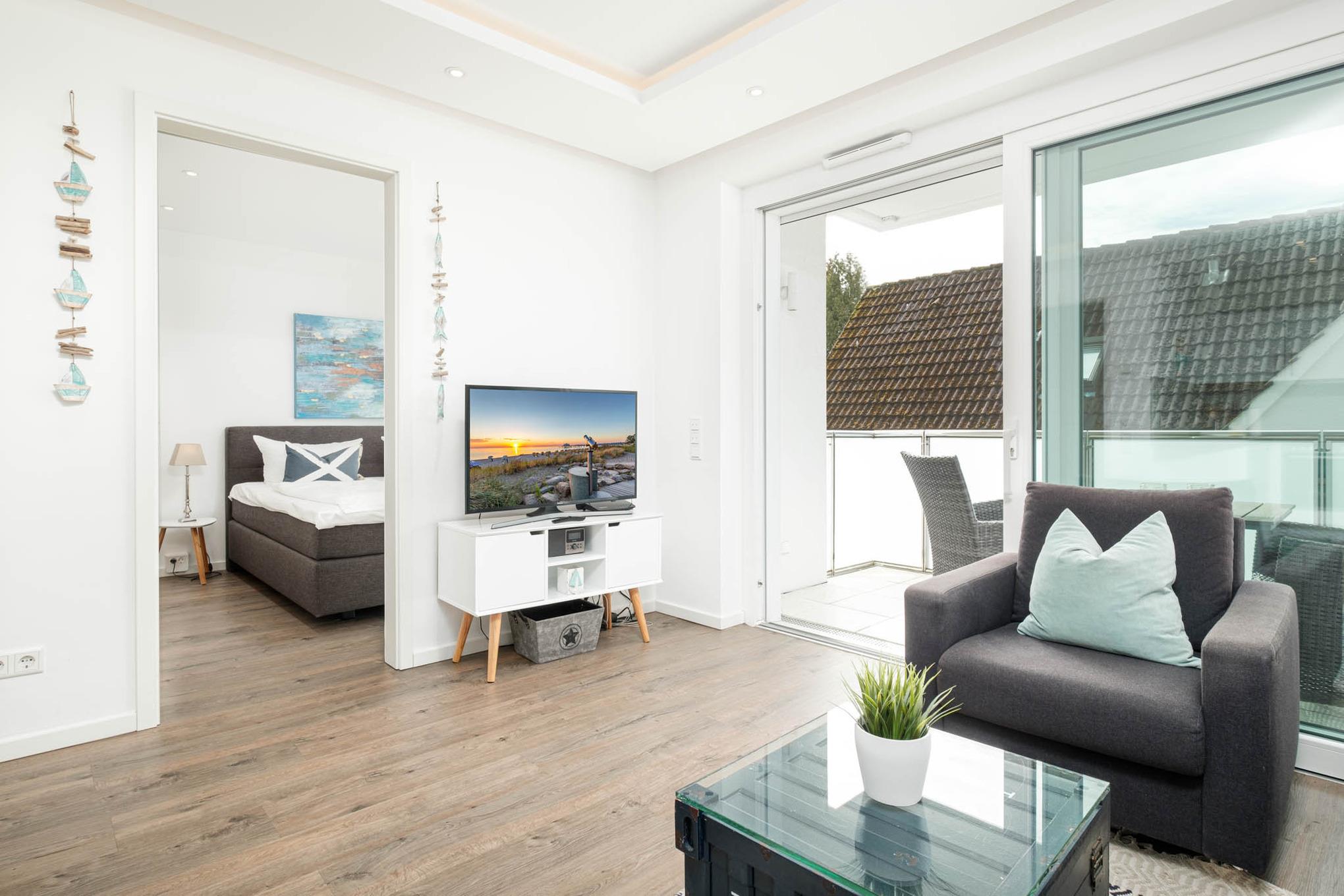 Modernes 2-Zimmer-Appartement in Timmendorfer Strand, 3-5 Gehminuten zum Strand und Ortskern, mit Balkon und WLAN.