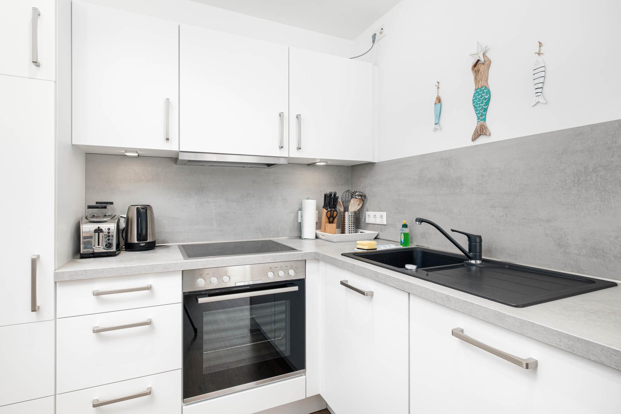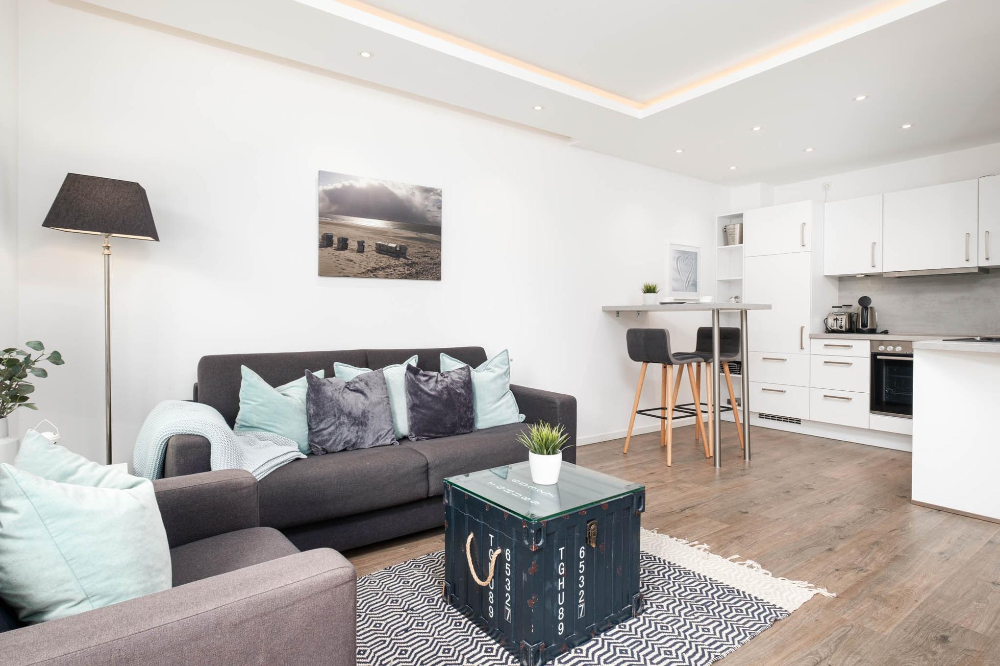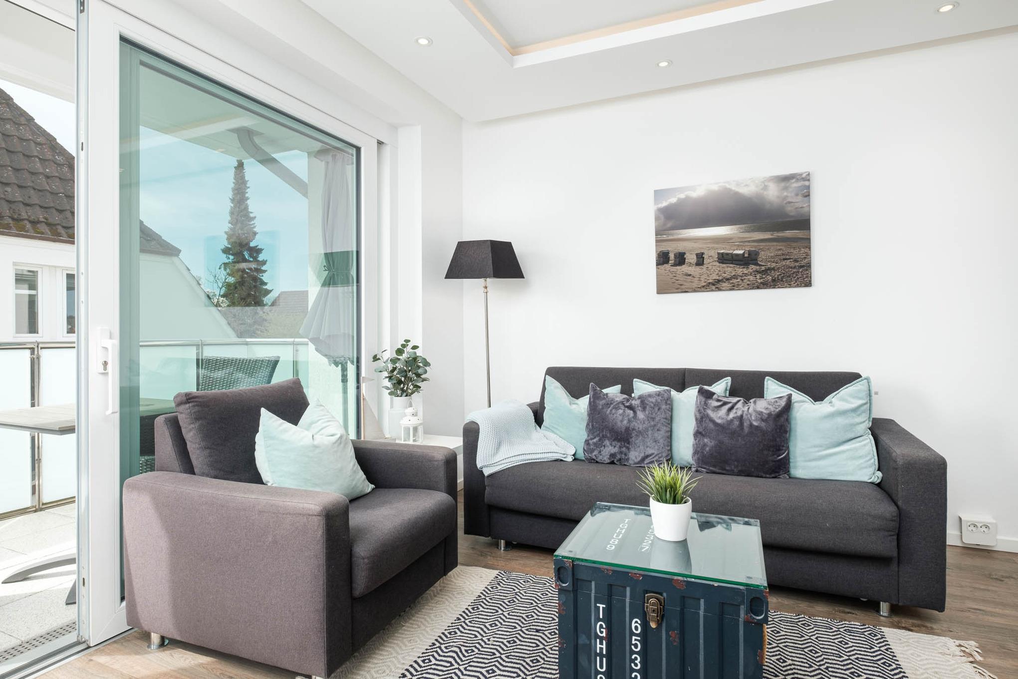 Modernes 2-Zimmer-Appartement in Timmendorfer Strand, 3-5 Gehminuten zum Strand und Ortskern, mit Balkon und WLAN.