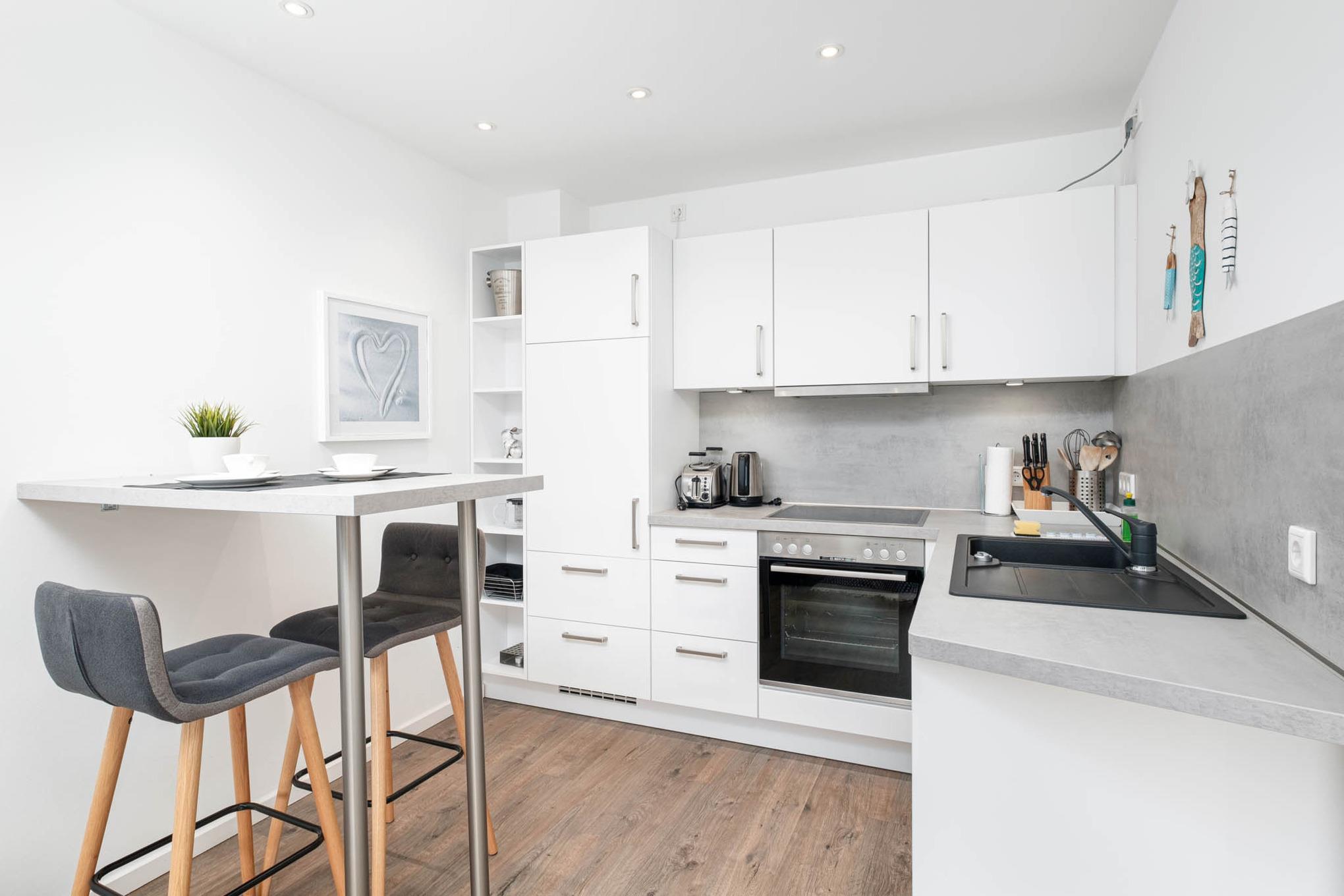 Im Wohnbereich laden eine moderne Couch, ein Flatscreen-TV und Essbereich zum Wohlfühlen ein. Die offene Küche ist in den Wohnraum integriert und verfügt über die neuesten Geräte u.a. Backofen, Ceranfeld und Geschirrspüler sowie alle weiteren notwendigen Küchenutensilien.