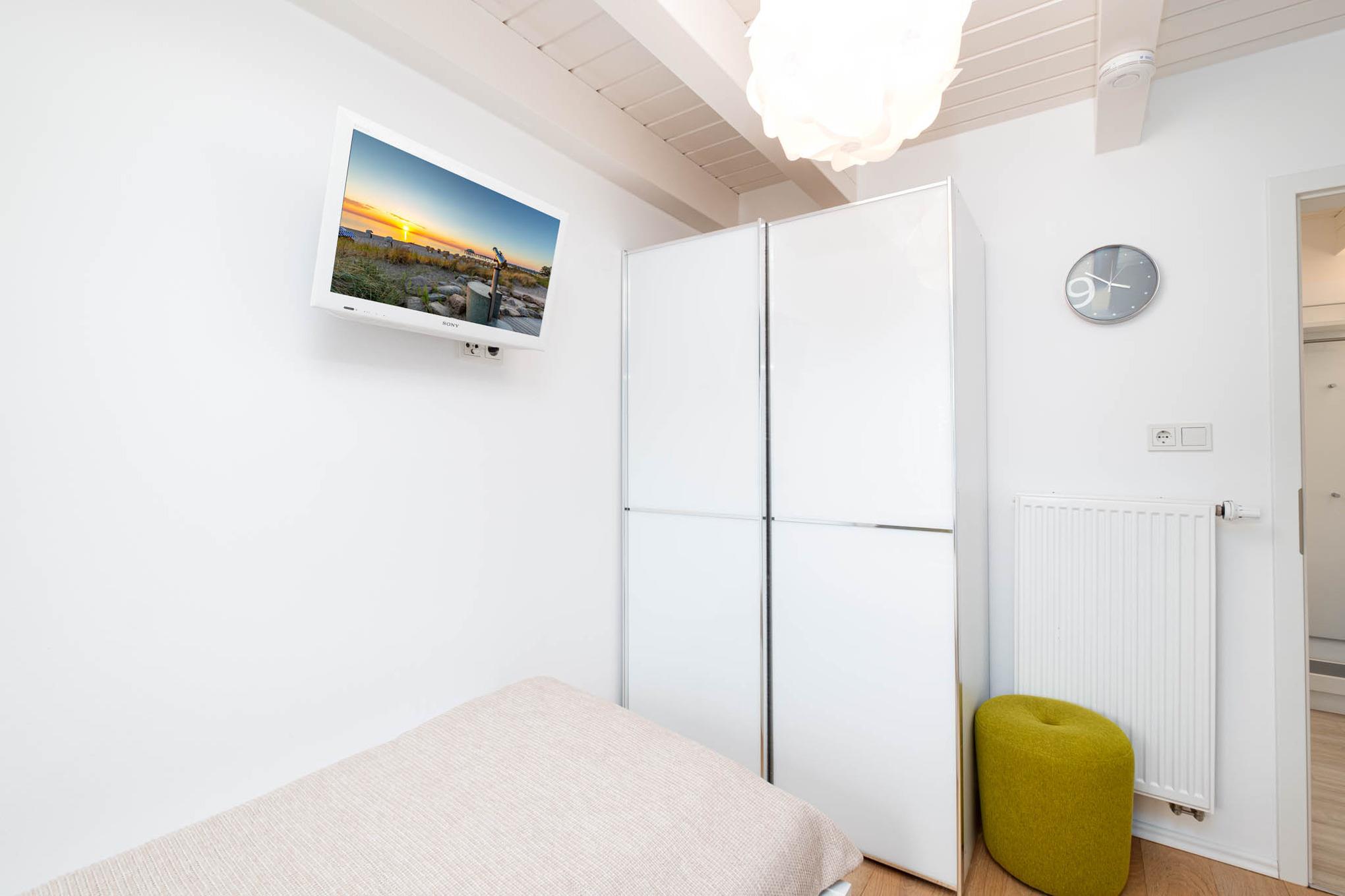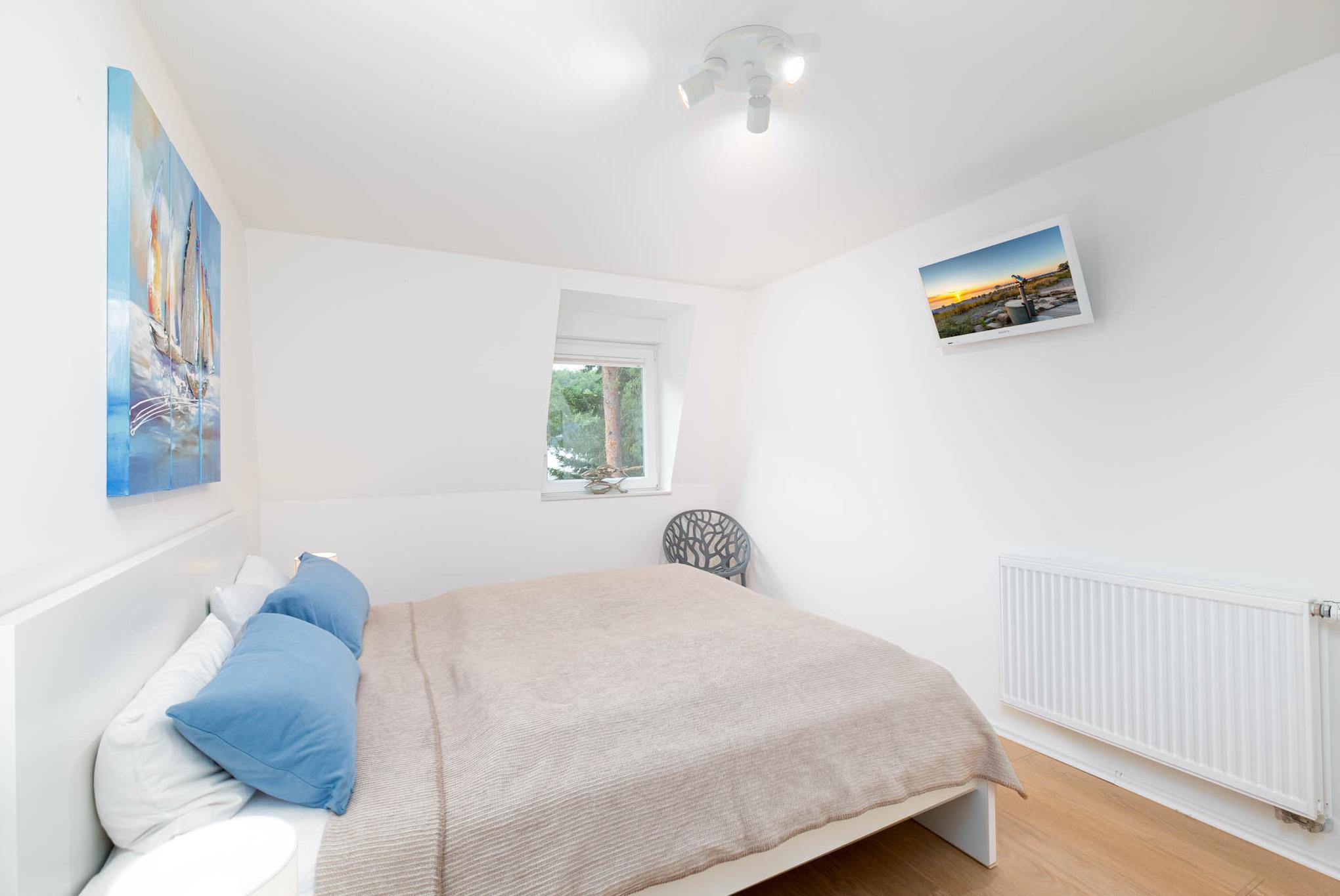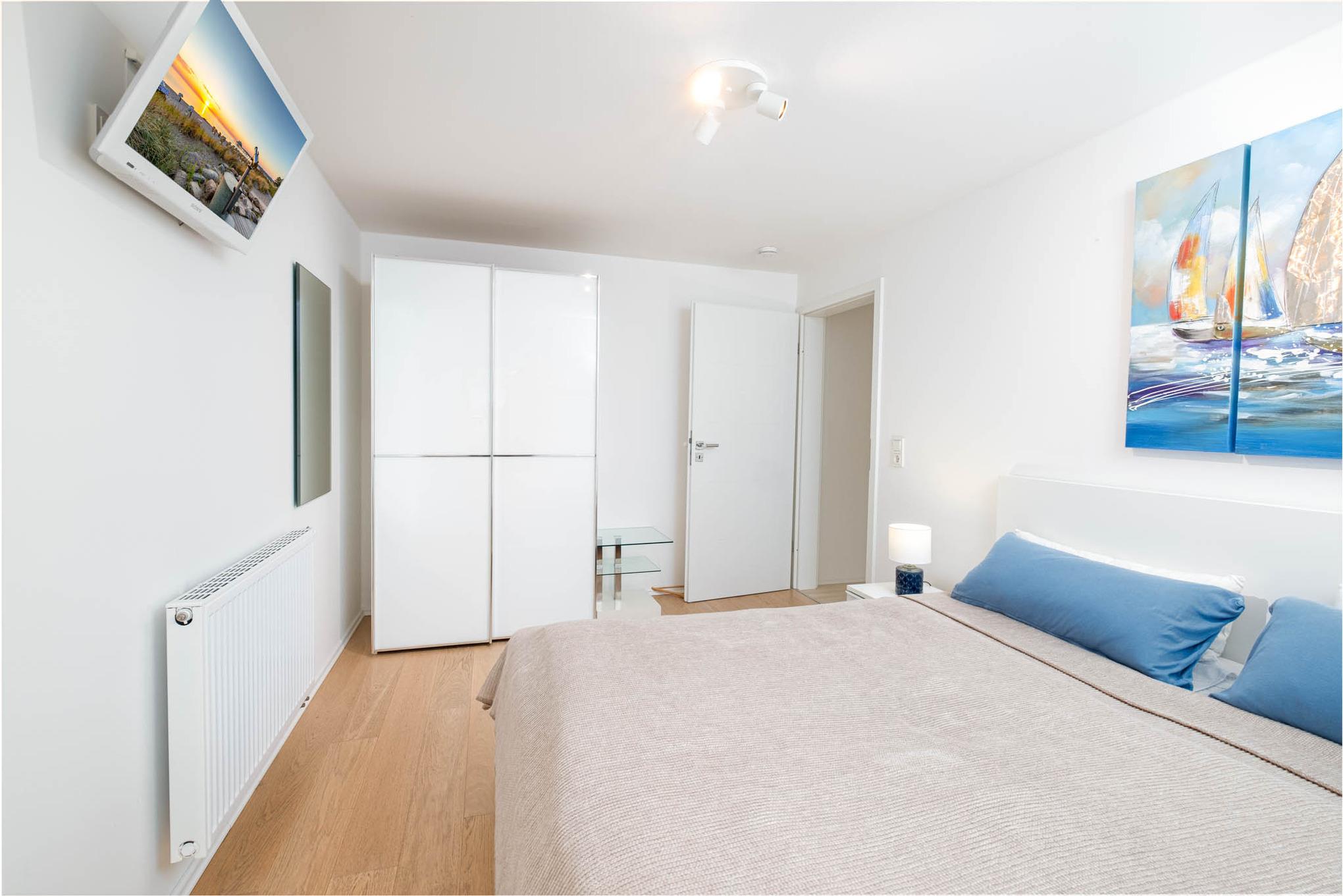 Über eine Treppe im Wohnbereich ist das dritte Schlafzimmer mit einem Doppelbett (180 x 200 cm), sowie ein weiteres Duschbad zu erreichen. Alle Schlafzimmer verfügen über ein weiteres TV-Gerät, sowie über Außenrolladen.