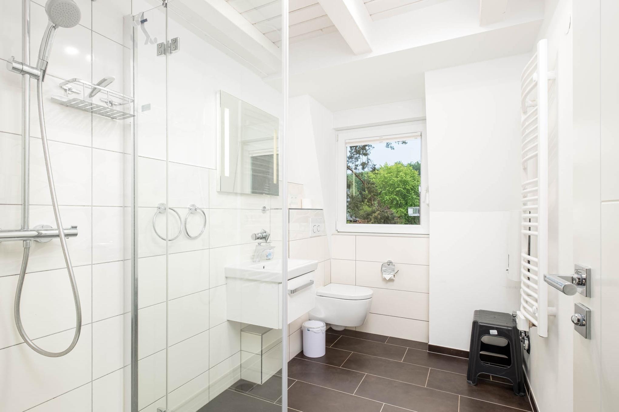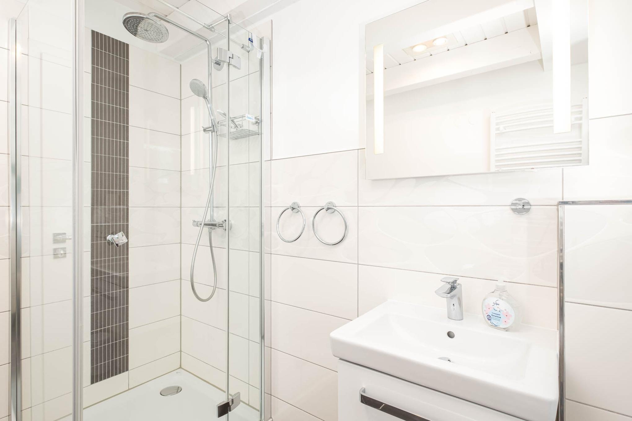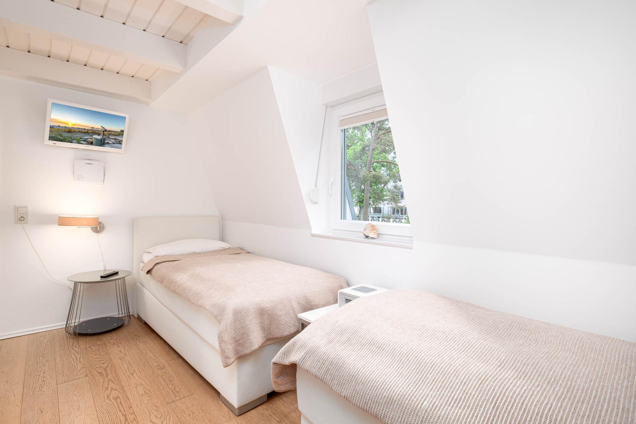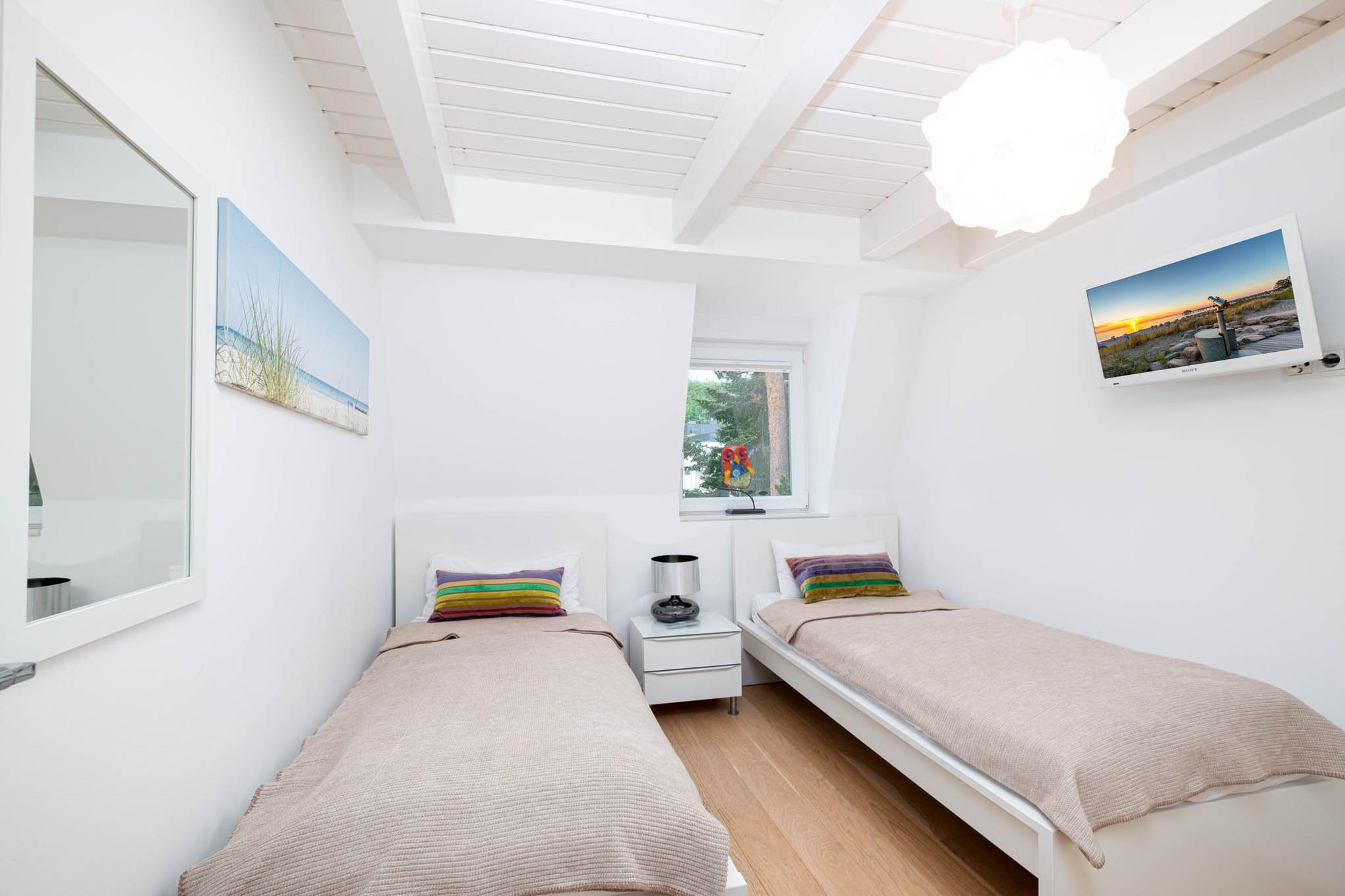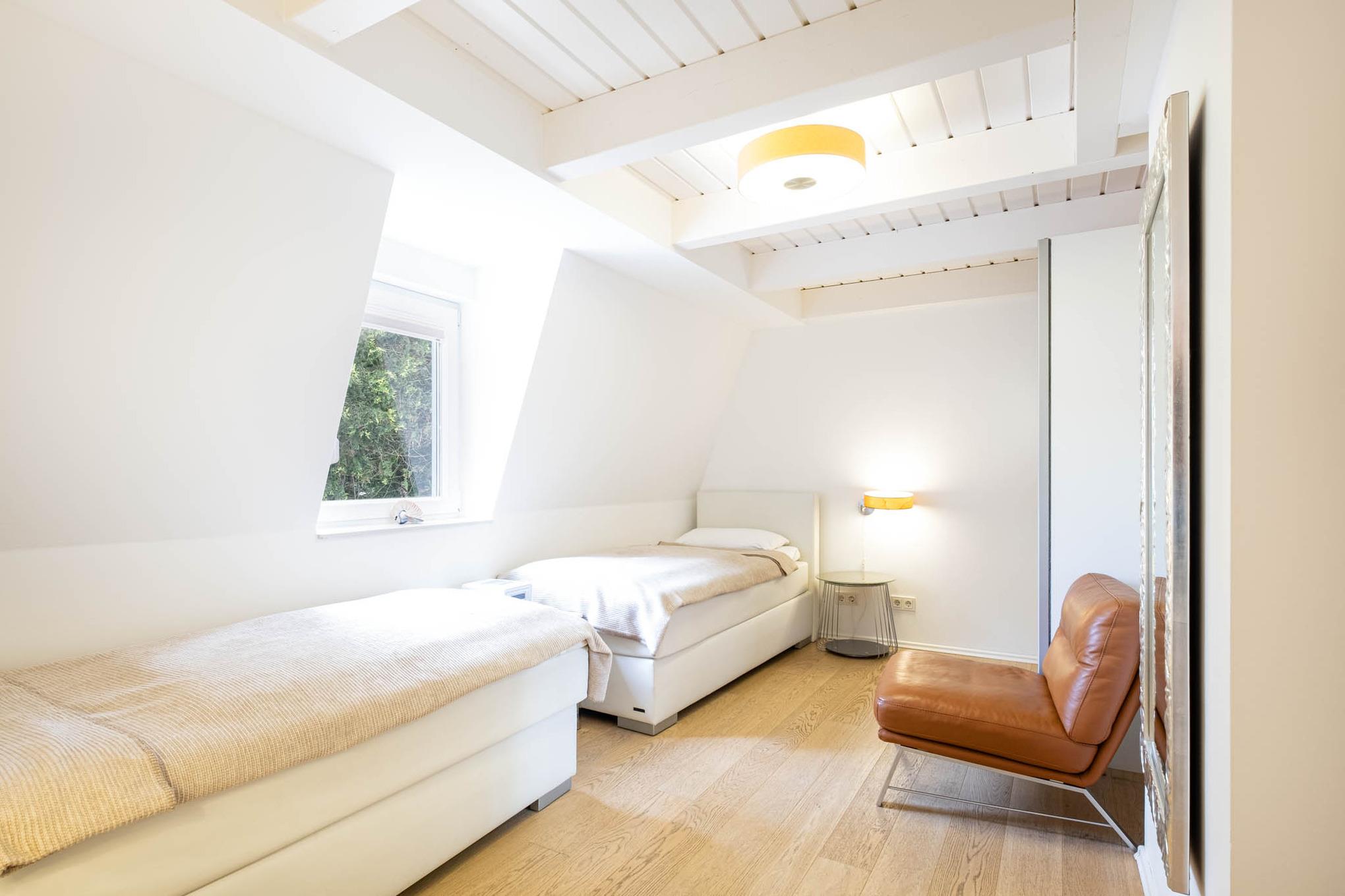 Es befinden sich zwei Schlafzimmer mit je zwei Einzelbetten ( je 90x200 cm), sowie ein Duschbad in dieser Wohnebene.