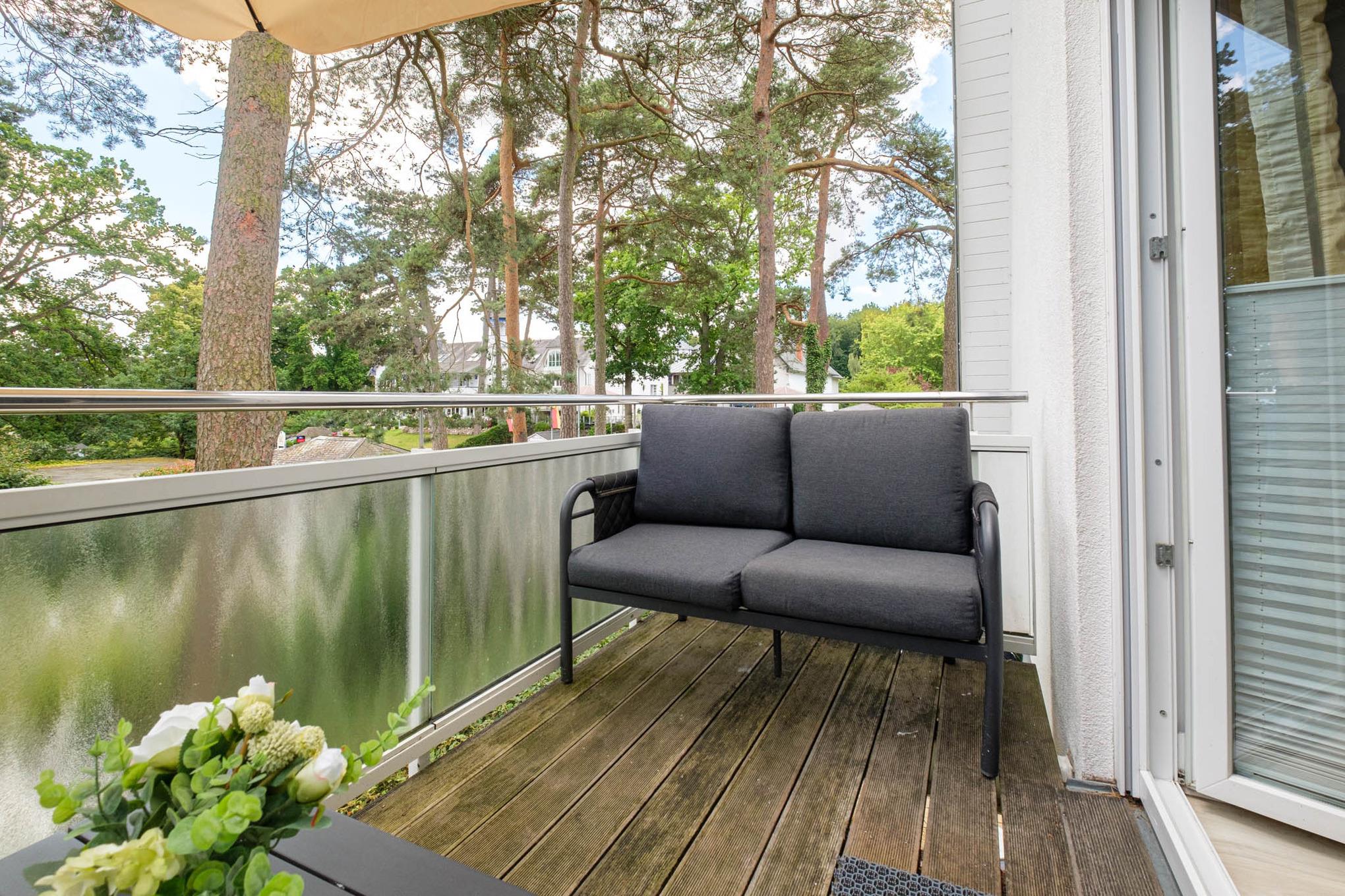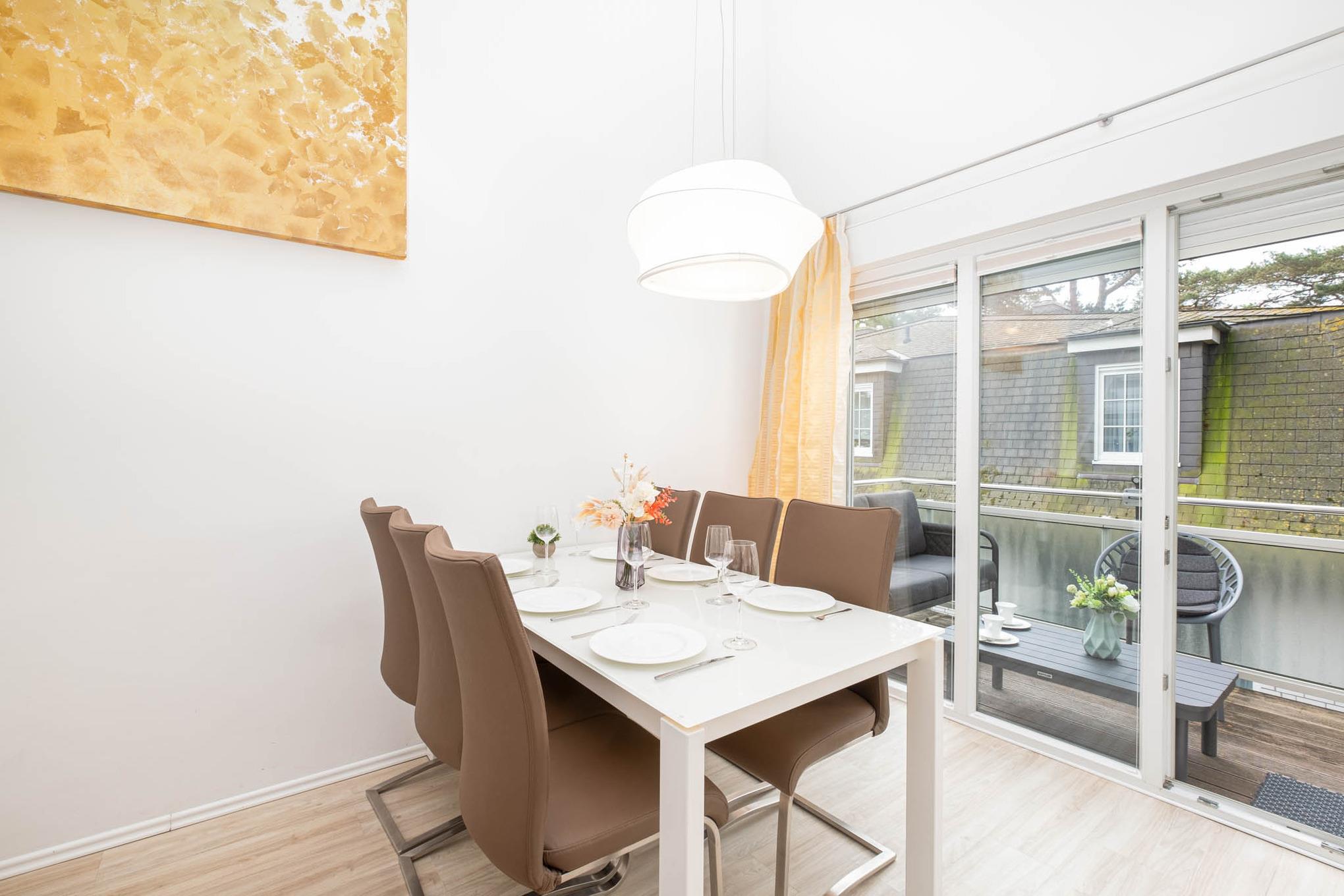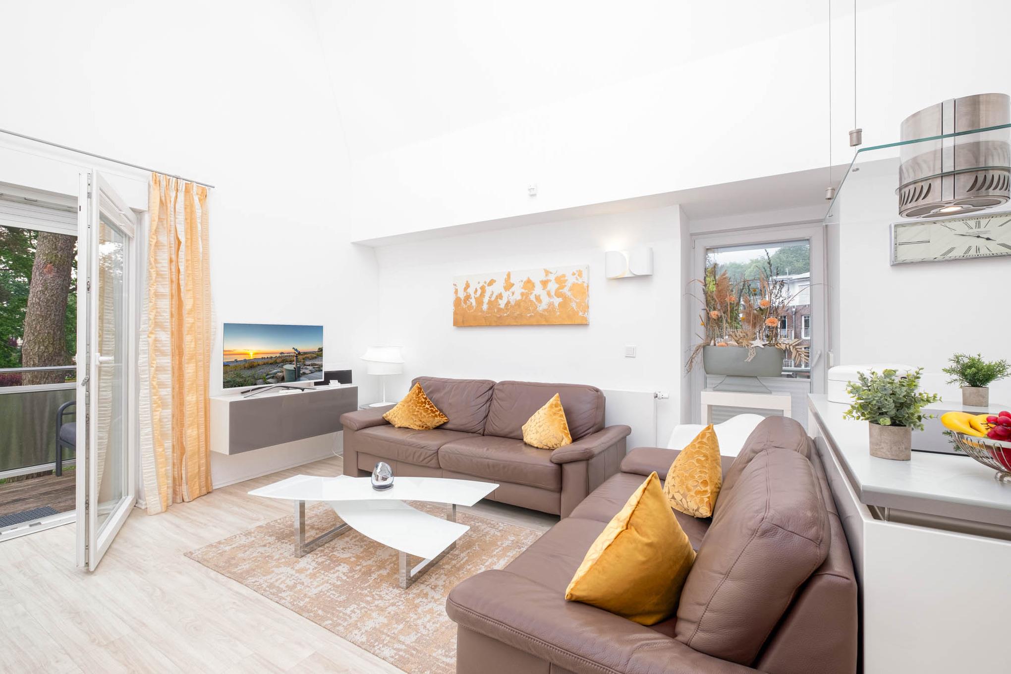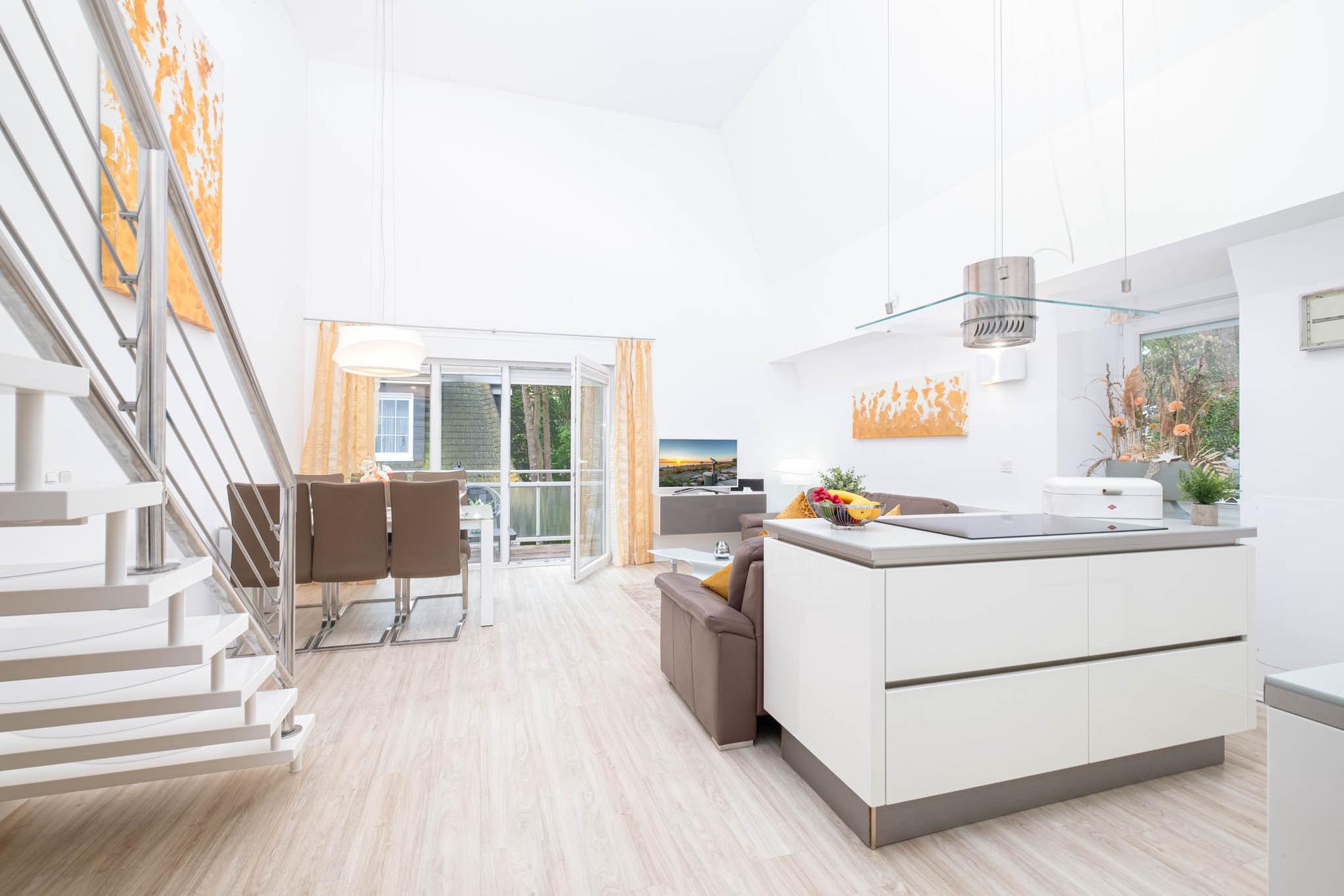 Sie betreten das großzügige 96 qm große Appartement in der ersten Etage. Dort empfängt Sie in der für maximal 6 Personen eingerichteten Wohnung ein offener Wohn- und Essbereich. Durch die hohen Decken genießen Sie Ihre Zeit in dem lichtdurchfluteten Wohnbereich. Von hier aus erreichen Sie ebenfalls den vorgelagerten Sonnenbalkon mit herrlichem Meerblick.
