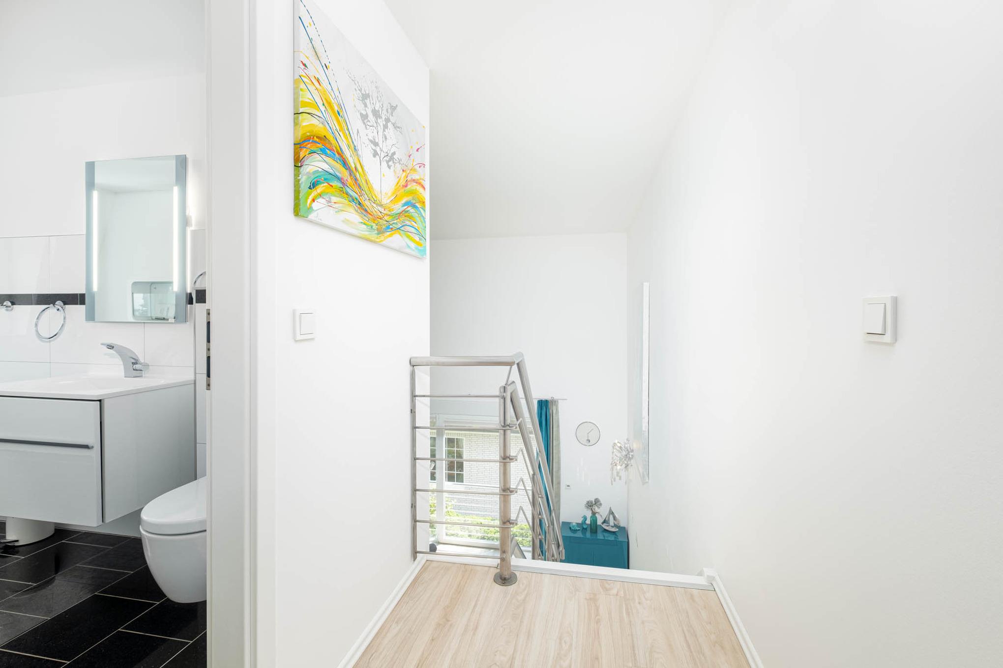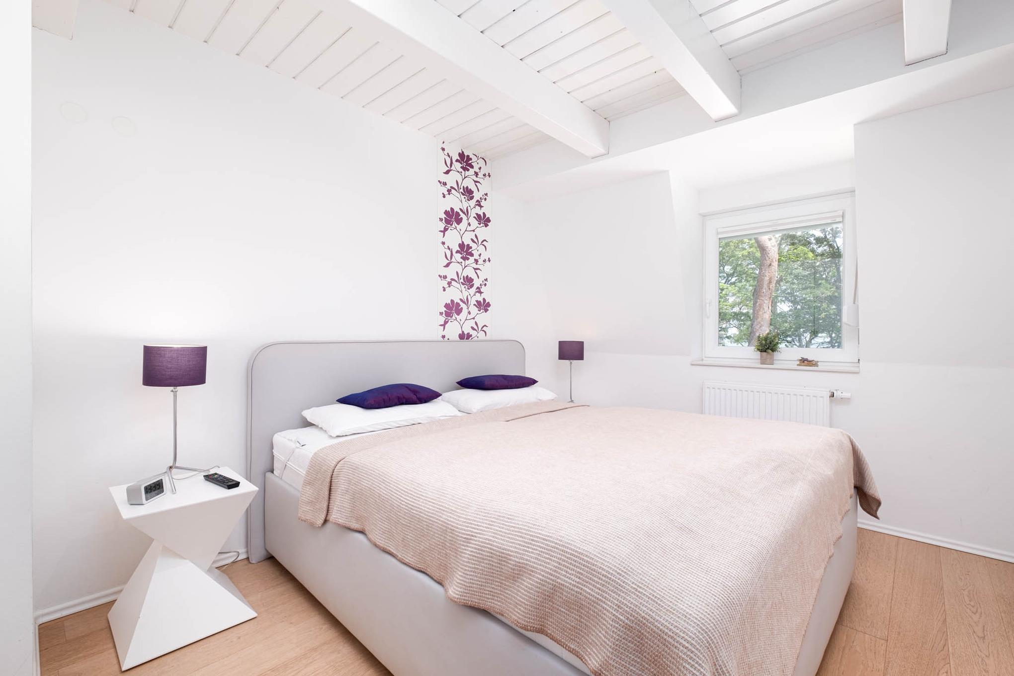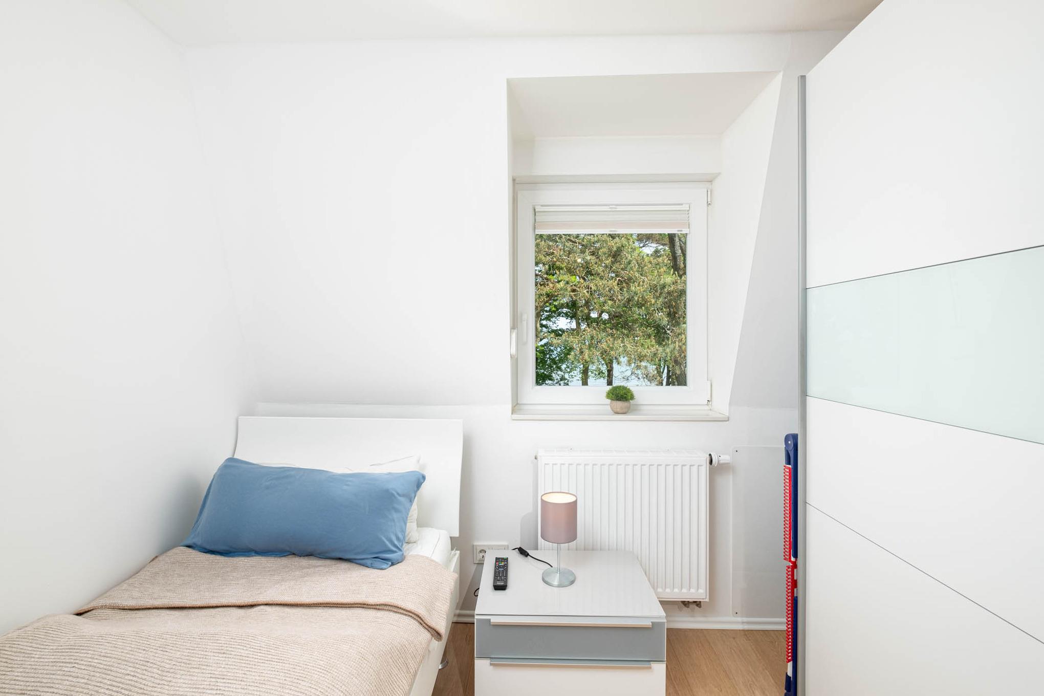 Über die offene Treppe im Wohnbereich erreichen Sie die obere Etage ausgestattet mit einen weiteren Schlafzimmer mit zwei getrennten Einzelbetten (je 90 x 200 cm). Ebenfalls begrüßt Sie auf dieser Ebene ein Badezimmer mit Ostseeblick. Hier können Sie Ihren Urlaubstag in der Badewanne ausklingen lassen.