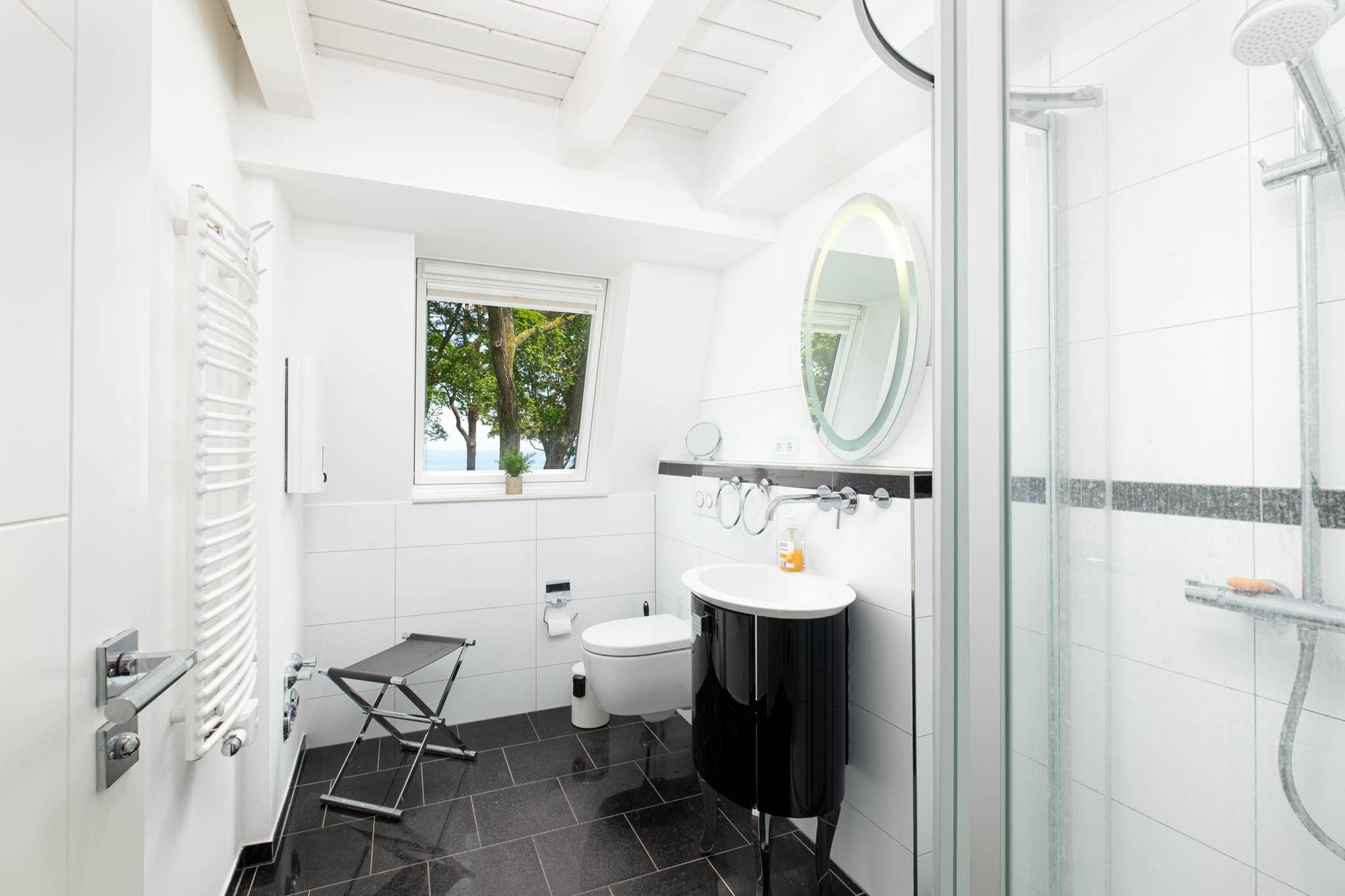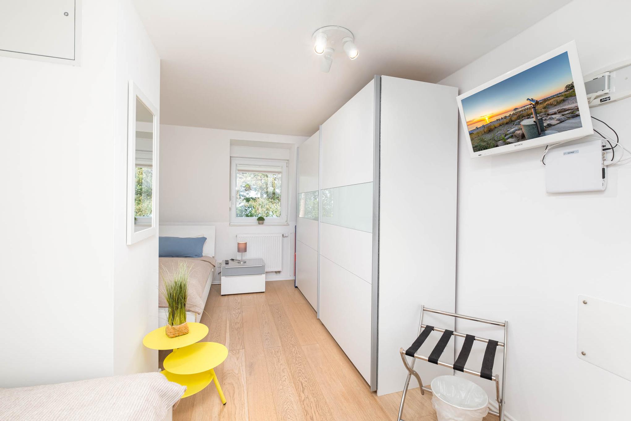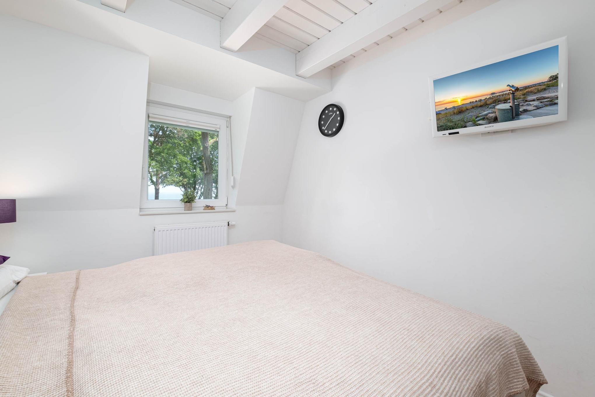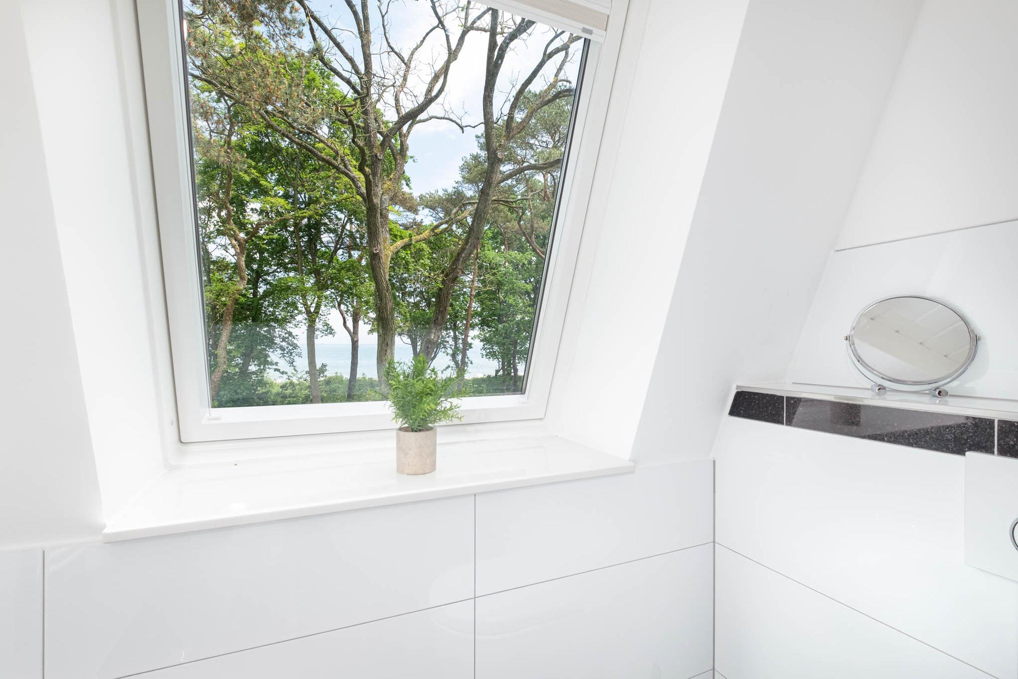 Über die offene Treppe im Wohnbereich erreichen Sie die obere Etage ausgestattet mit einen weiteren Schlafzimmer mit zwei getrennten Einzelbetten (je 90 x 200 cm). Ebenfalls begrüßt Sie auf dieser Ebene ein Badezimmer mit Ostseeblick. Hier können Sie Ihren Urlaubstag in der Badewanne ausklingen lassen.