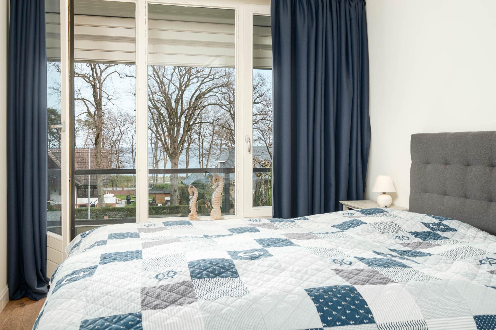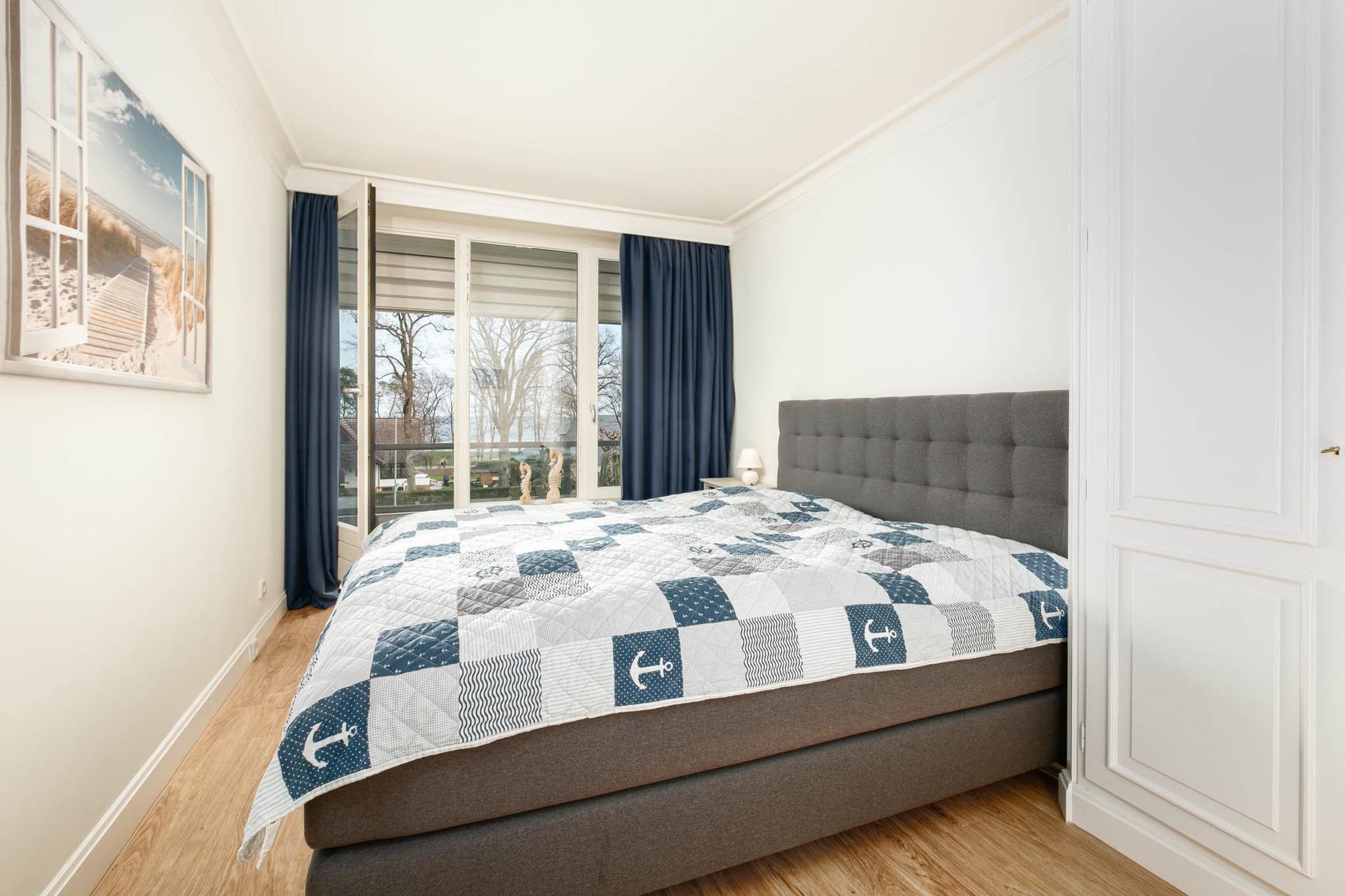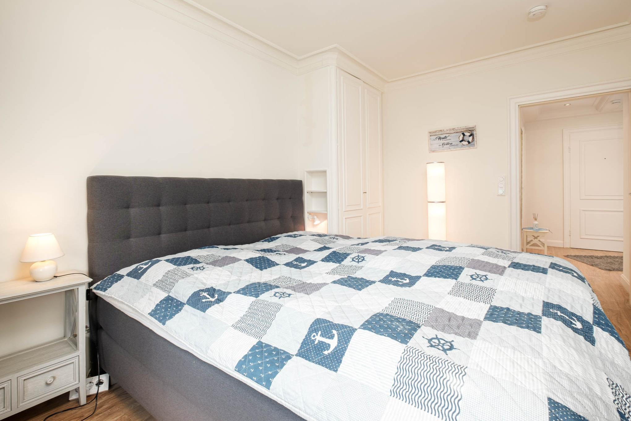 Das Schlafzimmer dieser Ferienwohnung ist mit einem großzügigen Boxspringbett (2,00 x 2,20m, durchgängige Matratze und Topper) und einem Kleiderschrank eingerichtet. Der Erholungsschlaf ist dank Verdunkelungsvorhängen hier garantiert!
