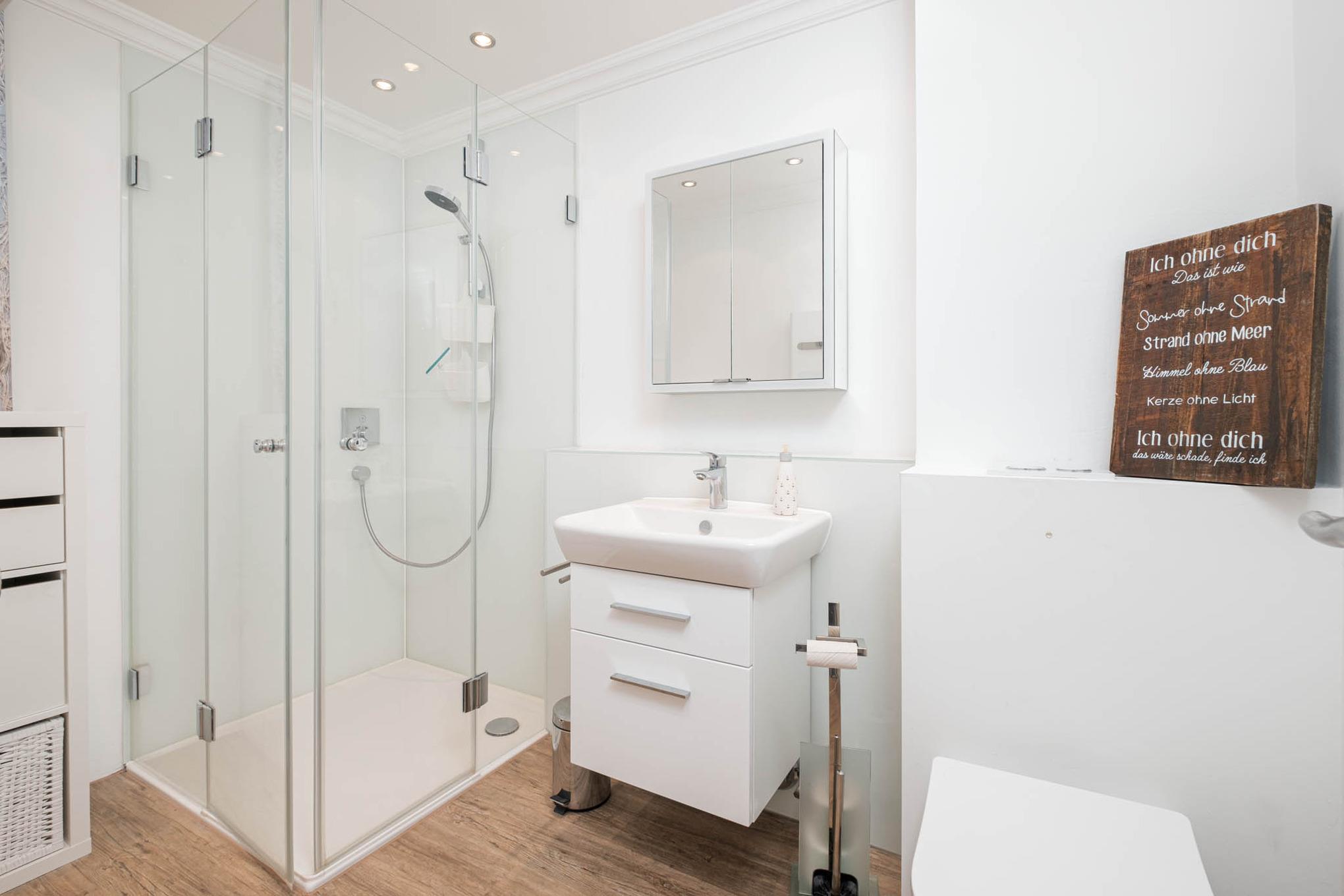 Im modernen Badezimmer erwarten Sie eine Dusche, ein Waschtisch sowie ein WC. Alltagsstress und Strandsand spülen Sie sich hier von den Schultern.