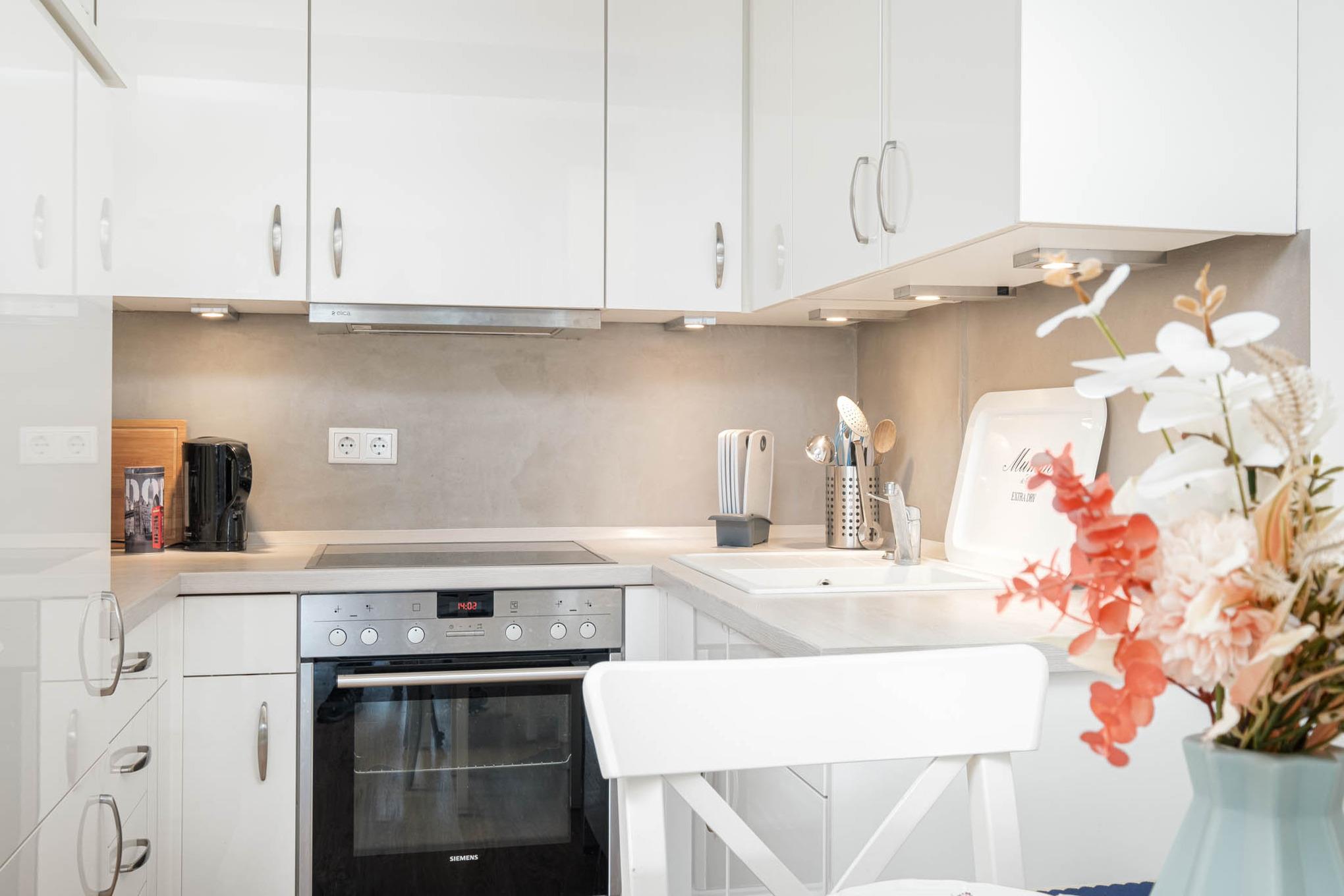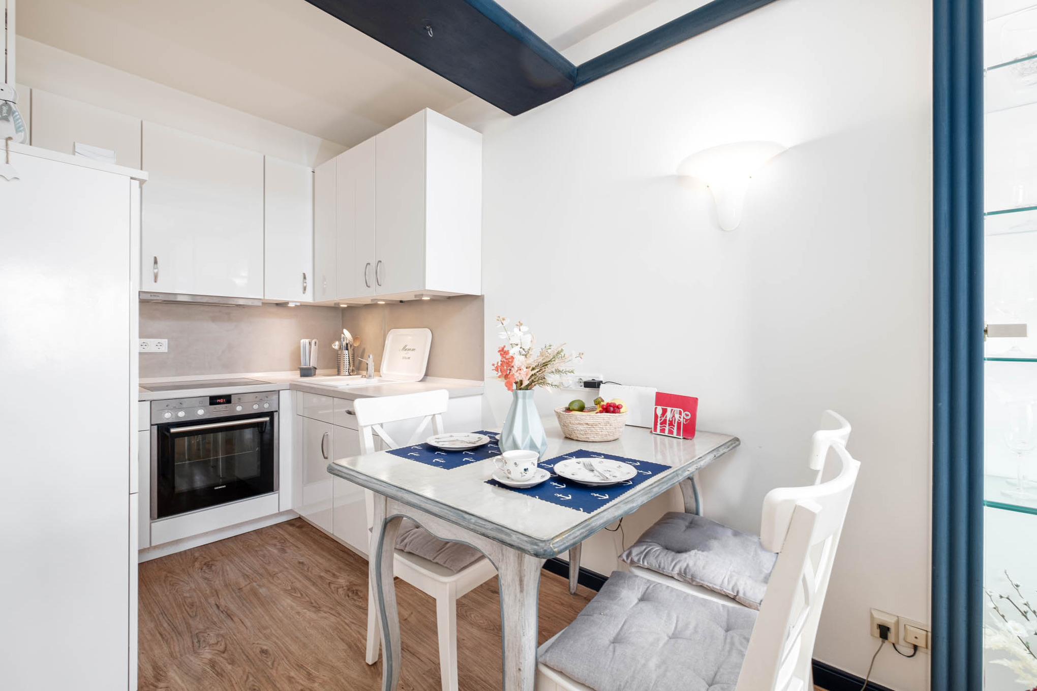 Darüber hinaus wird Ihnen ein direkter Übergang in die sich anschließende, offene Küchenzeile geboten. Sie dürfen sich unter anderem auf einen Backofen, ein Cerankochfeld, einen Kühlschrank mit Gefrierfach sowie eine Kaffeemaschine freuen. Ob für den Tagesstart beim Frühstück zu zweit oder auf einen Wein in den Abendstunden - hierzu lädt die anschließende gemütliche Essecke ein.