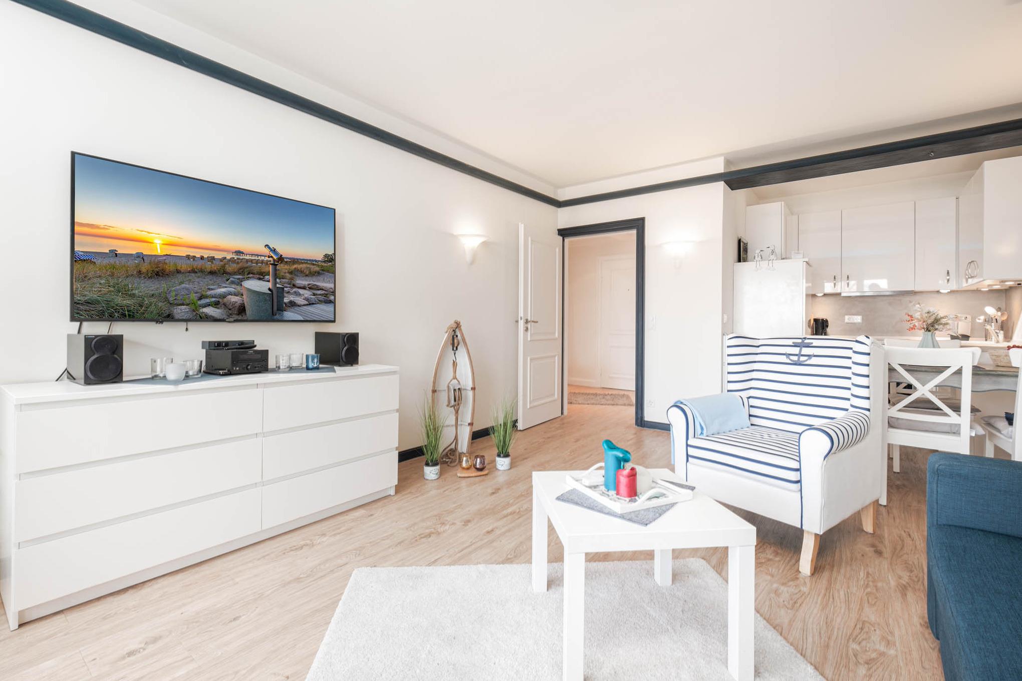 Ein freundliches Moin aus der schicken Timmendorfer Strand Ferienwohnung Nr. 306 in der Appartementanlage "Strandresidenz". Das geschmackvolle Ostseedomizil befindet auf der dritten Etage des Hauses und verfügt über ein helles Wohnzimmer mit einer komfortablen Couchgarnitur, einem Flatscreen-TV und große Fensterfront zum anschließenden Balkon. Eine Markise sowie ein Heizstrahler machen das Wohlgefühl perfekt!