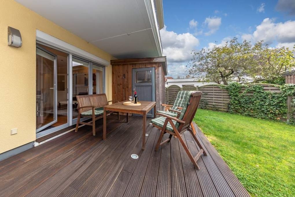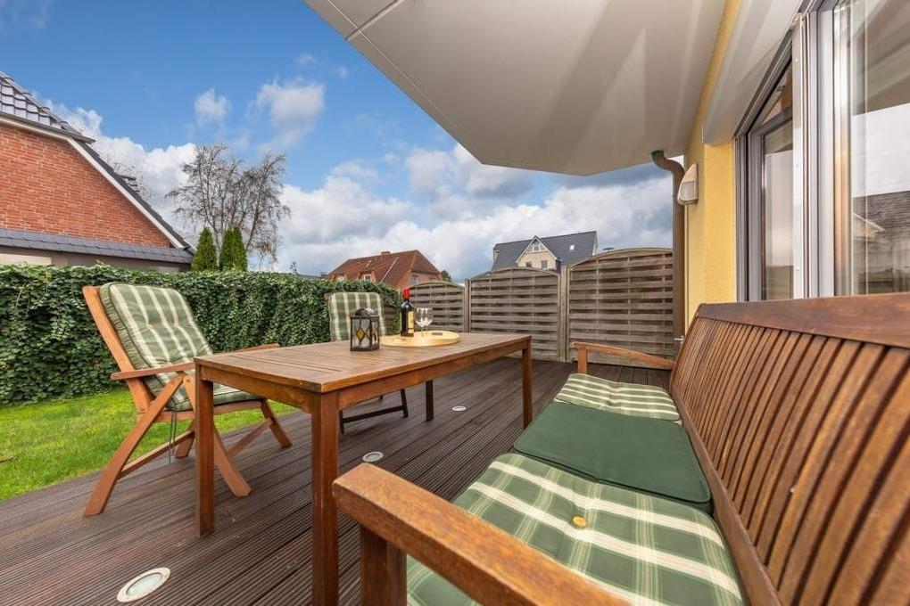 Die große möblierte Eckterrasse (Süd- und Südwestausrichtung) mit angrenzender, eingezäunter Rasenfläche rundet das perfekte Urlaubsdomizil für die ganze Familie ab.
