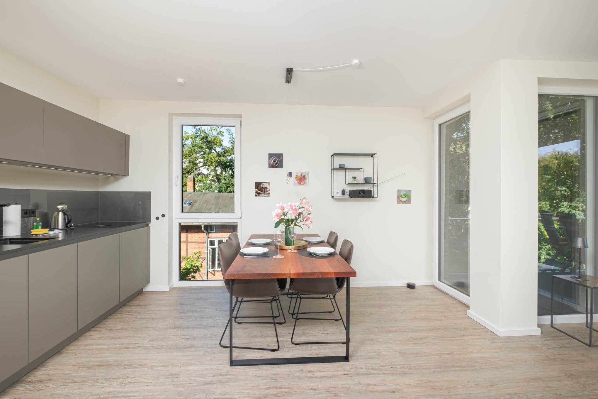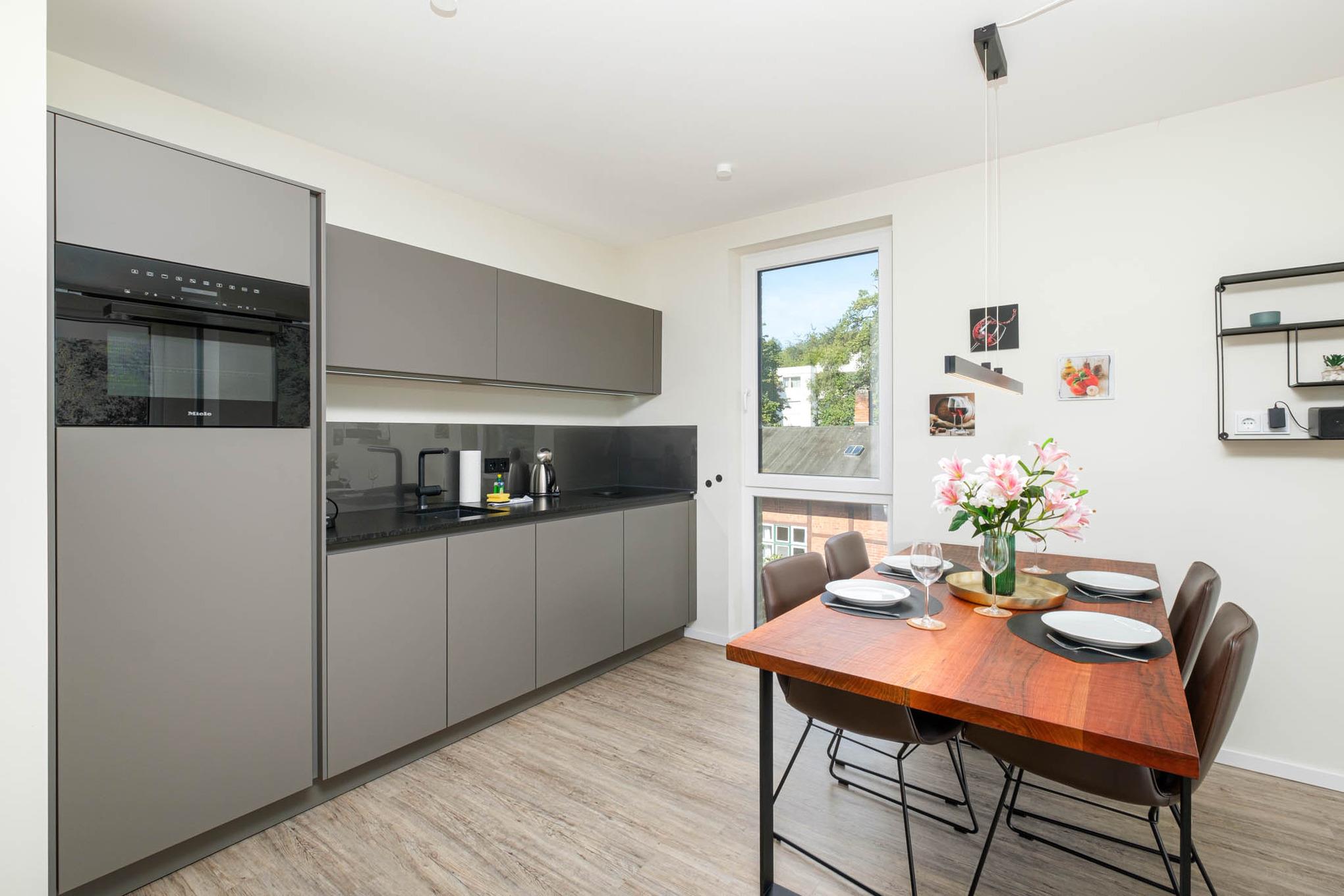 Die Küche ist modern und rund um mit allem, was das kulinarische Herz höher schlagen lässt, ausgestattet - ein Kühlschrank mit Gefrierfach, ein Backofen mit Mikrowellenfunktion, ein Induktionskochfeld, ein Geschirrspüler, eine Kaffeemaschine sowie eine ergänzende Nespresso-Kapselmaschine, ein Toaster und ein Wasserkocher stehen für Sie bereit.