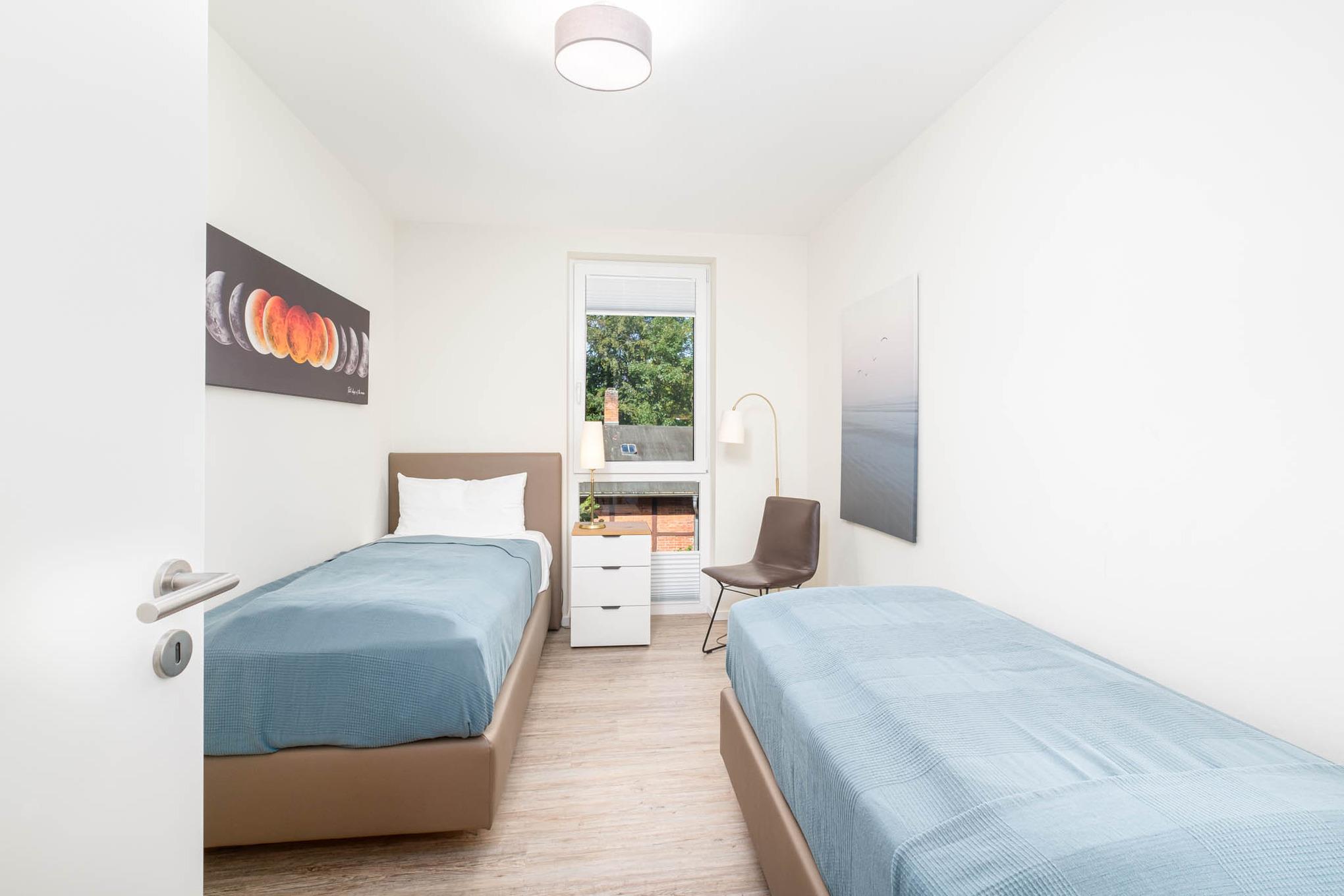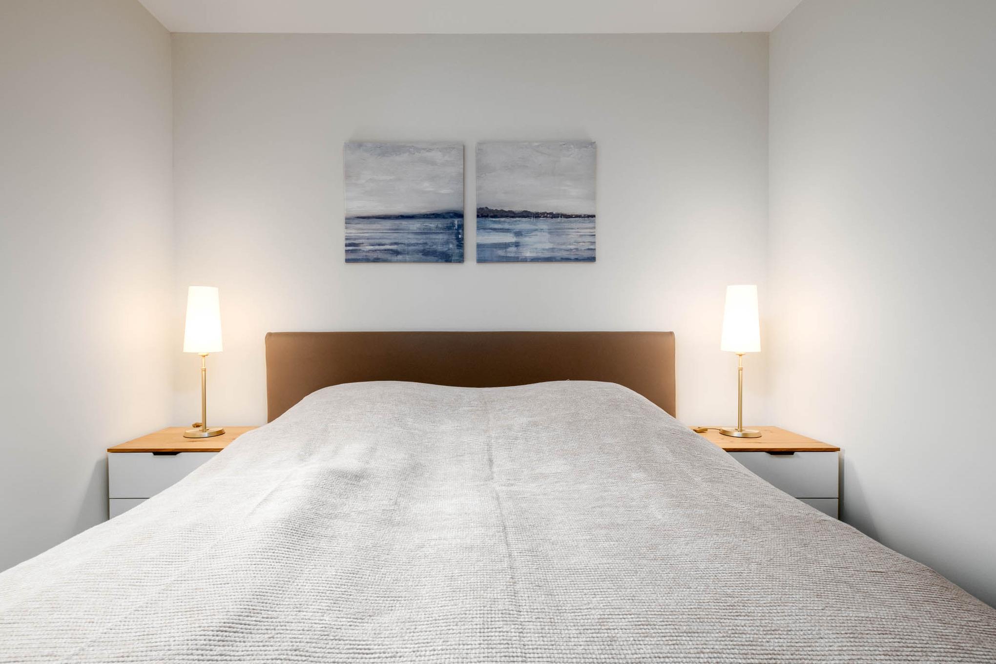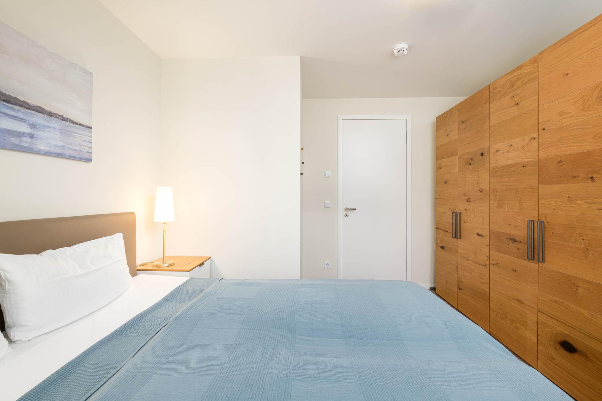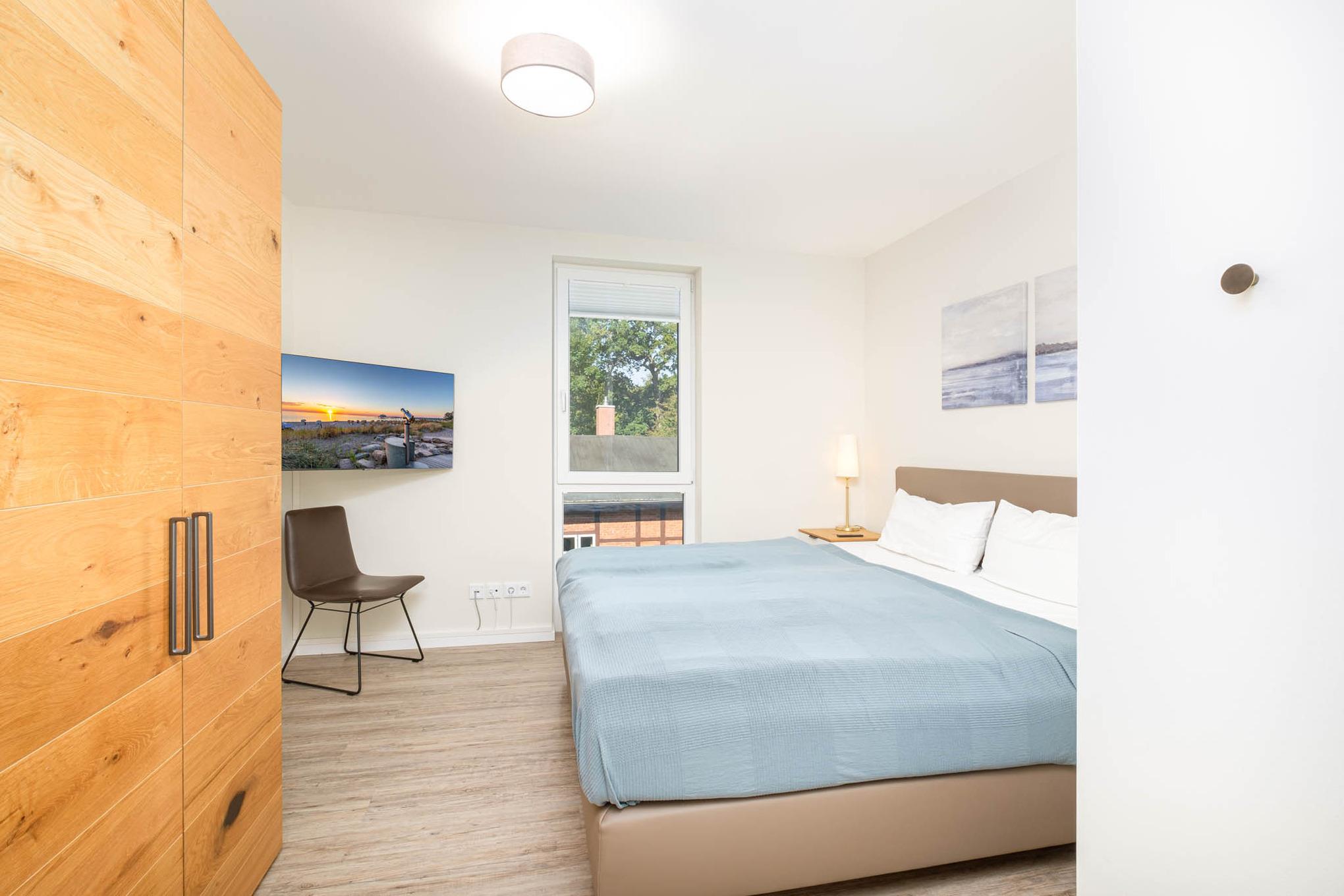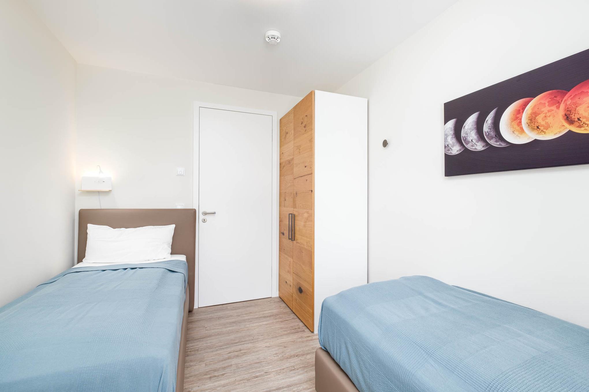 Das Schlafzimmer I bietet Ihnen mit einem hochwertigen Boxspringbett (180x200cm) sowie einem zusätzlichen 2. TV und einem geräumigen Kleiderschrank eine Ruheoase für erholsame Stunden. Im Schlafzimmer II erwarten Sie zwei komfortable Einzelbetten (je 90x200cm) sowie ebenfalls Stauraum für Ihr Reisegepäck.