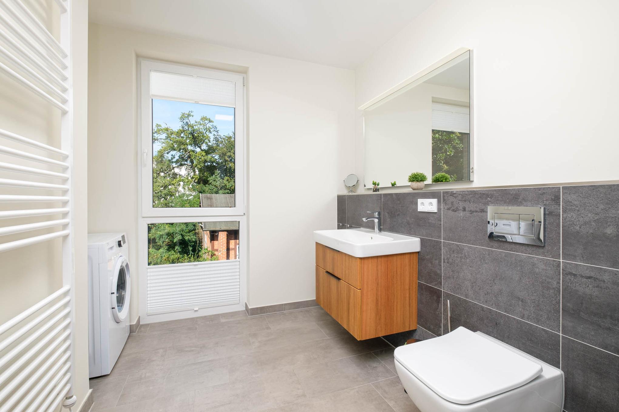 Die Timmendorfer Strand Ferienwohnung bietet Ihnen ein Badezimmer mit WC, Dusche, Waschmaschine und Handtuchwärmer. Ergänzend verfügt das Objekt über ein Gäste-WC.
