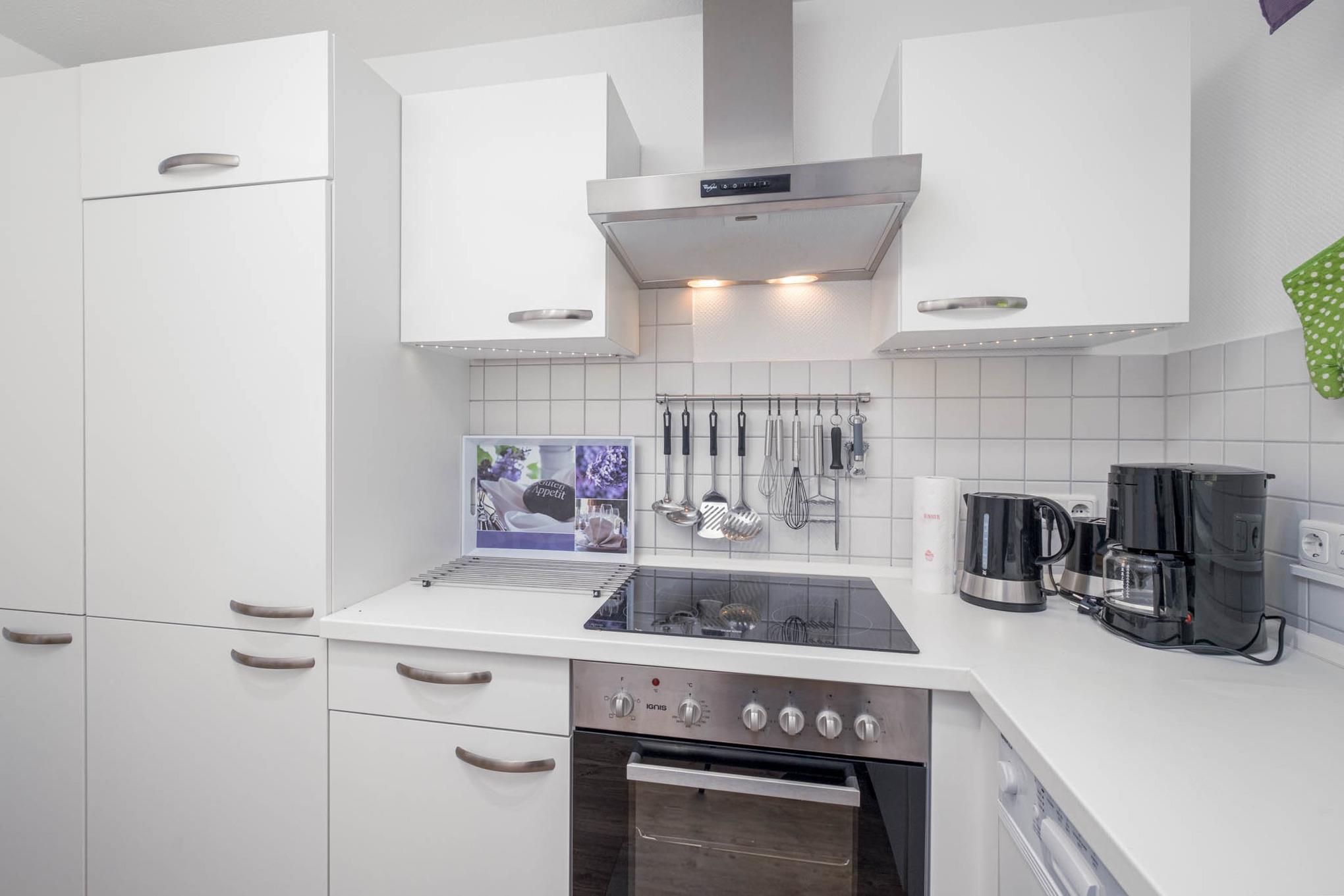 Die separate Küche ist mit Ceranfeld, Backofen und Geschirrspüler ausgestattet. Darüber hinaus finden Sie eine Filter Kaffeemaschine vor.