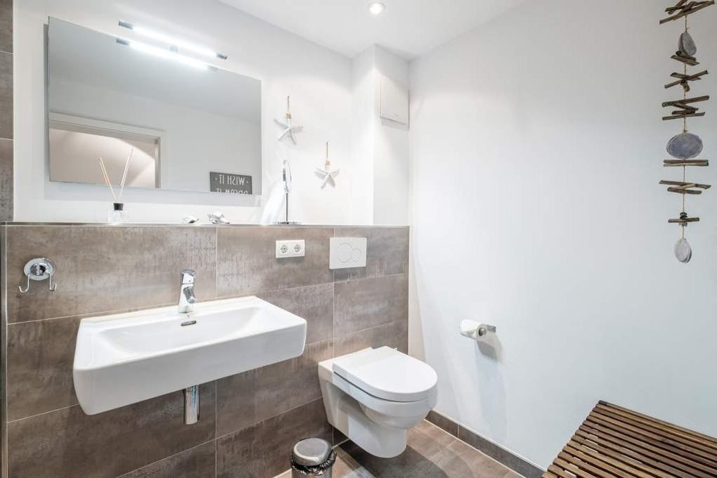 Es ist ein Badezimmer in dieser Ferienwohnung mit bodengleicher Raindance-Dusche und ein zusätzliches Gäste-WC vorhanden.
