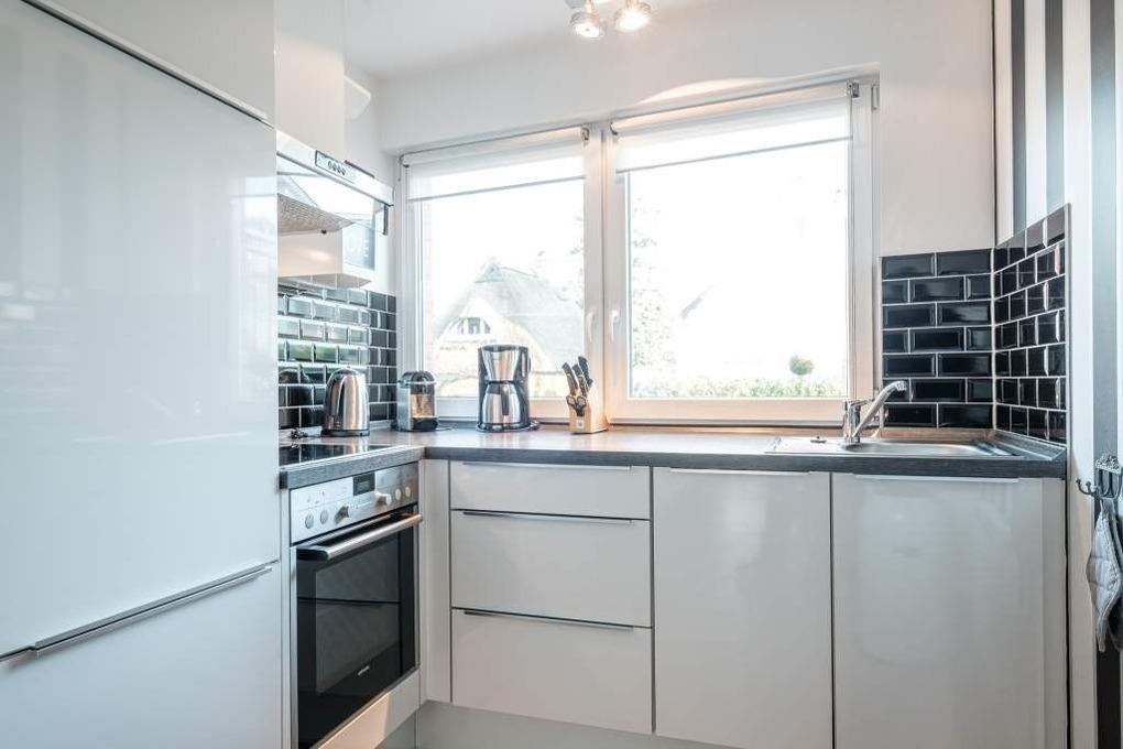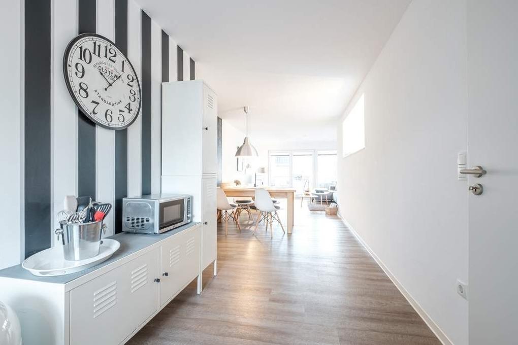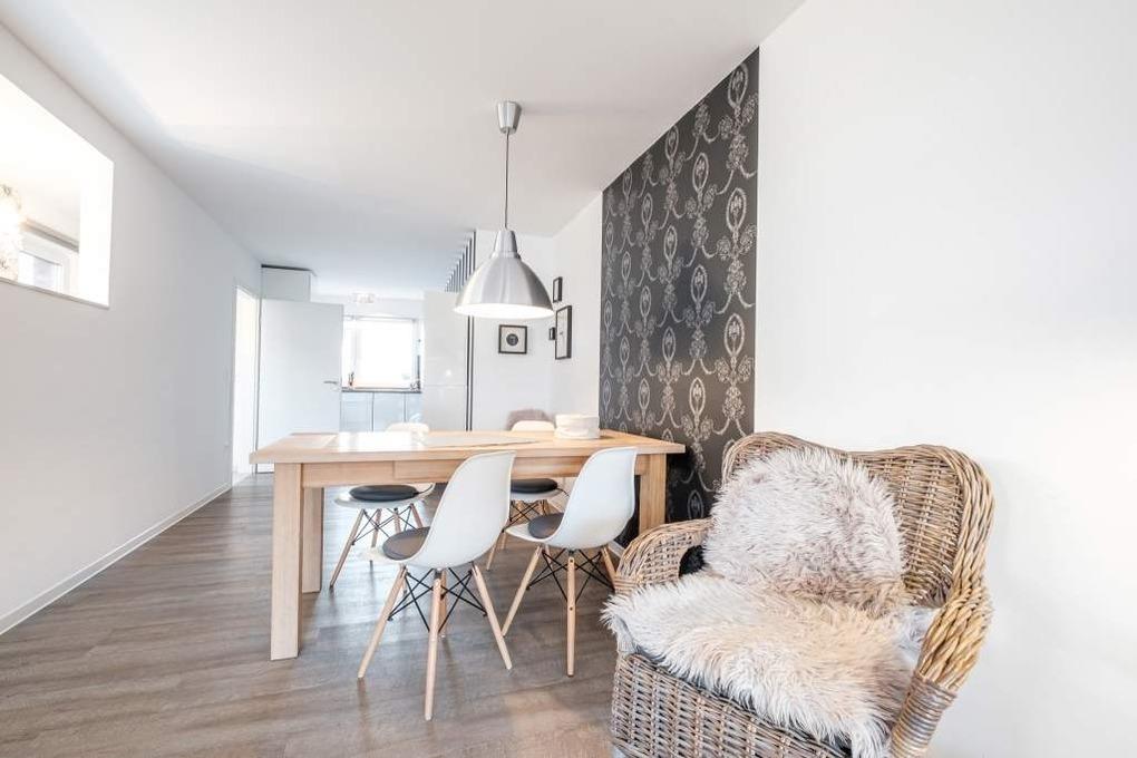 Die Ferienwohnung geht über zwei Ebenen (die Treppe befindet sich im Flur) und verfügt über einen hellen großen Wohn- und Essraum mit offener Küche. Der Wohnraum ist mit einer gemütlichen Couchgarnitur, einem Smart-TV, Apple-TV mit Air Play, Blu-Ray-Player und einer Stereoanlage ausgestattet. Der Essbereich grenzt direkt an die offene, hochwertig ausgestattete Küche mit Cerankochfeld, Geschirrspüler und Backofen. Darüber hinaus finden Sie eine Filter Kaffeemaschine und eine Nespresso Maschine vor.