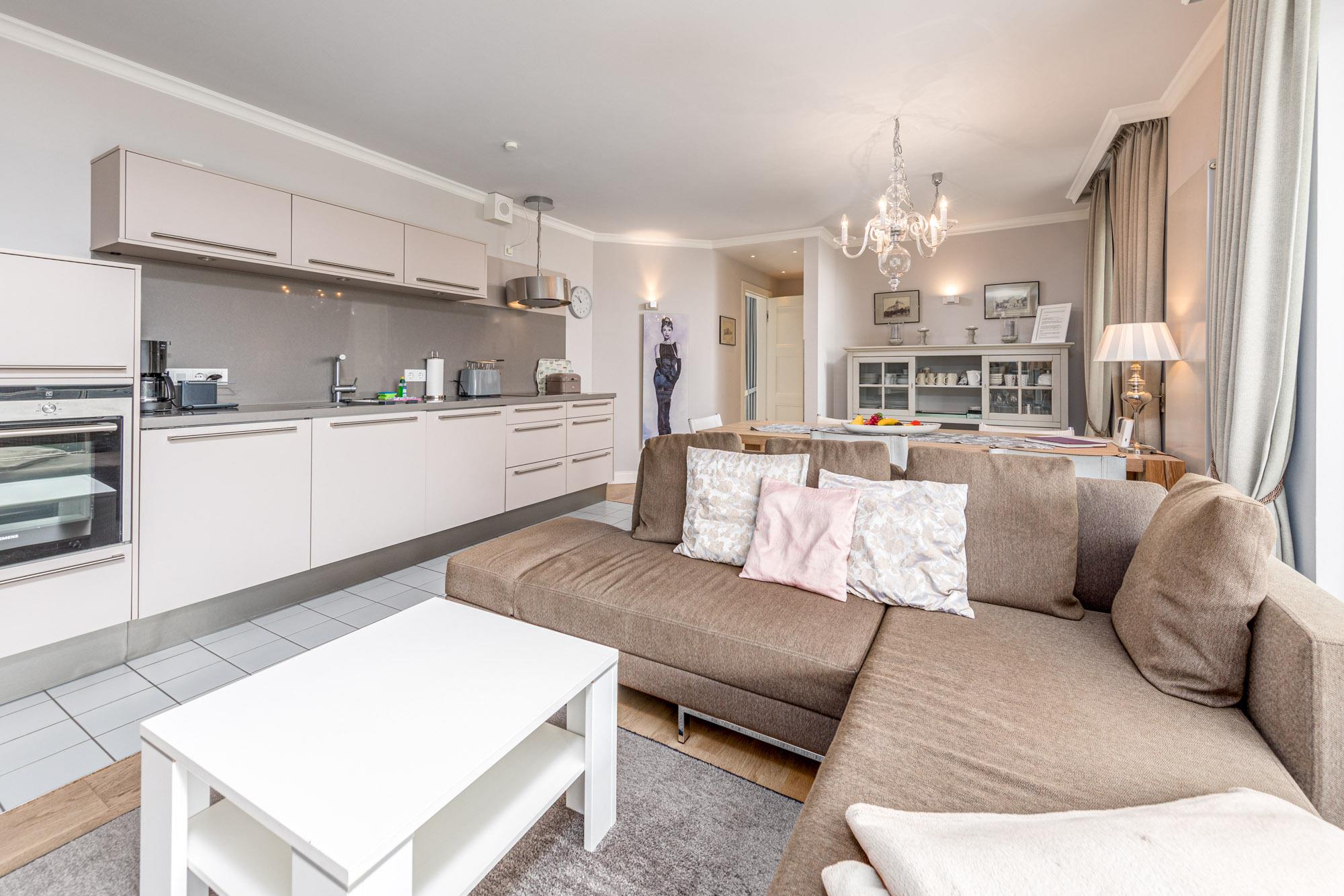 Im 3-Zimmer-Appartement Ambiente erwartet Sie ein hochwertig ausgestattetes Appartement für maximal 4 Personen in der 1. Etage mit 2 Balkonen. Das große Wohnzimmer verfügt über einen Couchbereich, Flatscreen-TV und den geschmackvollen Essbereich. Die in den Wohnraum integrierte offene Einbauküche verfügt über Backofen, Ceranfeld, Geschirrspüler und Mikrowelle.