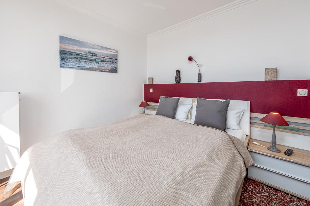 Das separate Schlafzimmer der Ferienwohnung ist mit einem Doppelbett (160x200cm) und einem zweiten Flatscreen-TV eingerichtet und hat elektrische Außenjalousien. Den zweiten Balkon mit Süd-West-Ausrichtung betreten Sie aus dem Schlafzimmer heraus. Hier relaxen Sie in ruhiger Atmosphäre, genießen den schönen Blick ins gepflegte Atrium und lassen sich von den Sonnenstrahlen von mittags bis zum Sonnenuntergang verwöhnen. Das Badezimmer verfügt über eine Badewanne und eine Dusche. Ein zusätzliches Gäste-WC ist vorhanden.