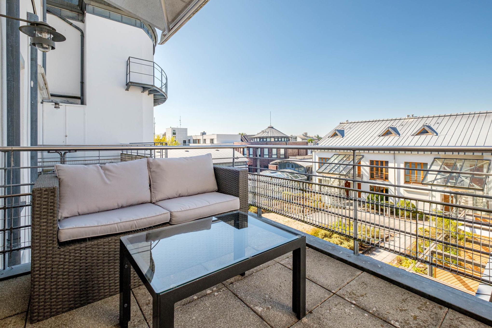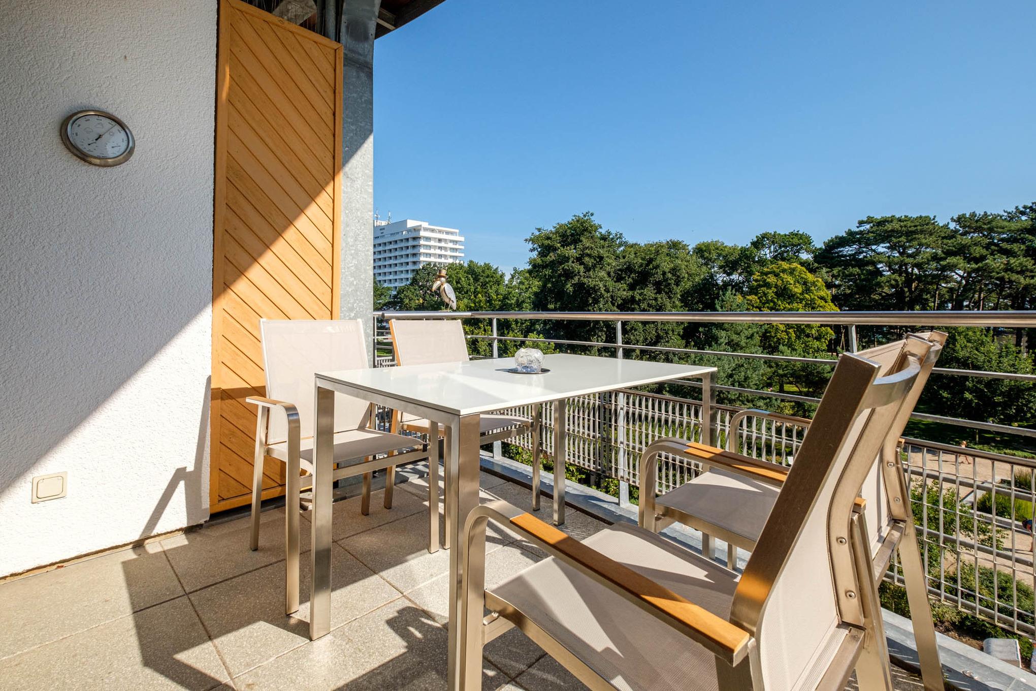 Die Ferienwohnung Timmendorfer Strand verfügt über zwei Balkone, ein Balkon geht vom Wohnzimmer ab, dieser ist nach Osten ausgerichtet und verfügt teilweise über Meerblick (Jahreszeitenabhängig). Der zweite Balkon befindet sich am Schlafzimmer und ist in Richtung Atrium zur Sonnenseite (West) ausgelegt. Hier können Sie in aller Ruhe die Sonne genießen und den Tag entspannt ausklingen lassen.