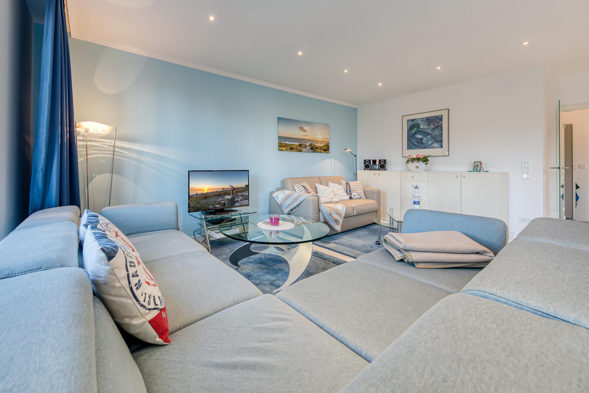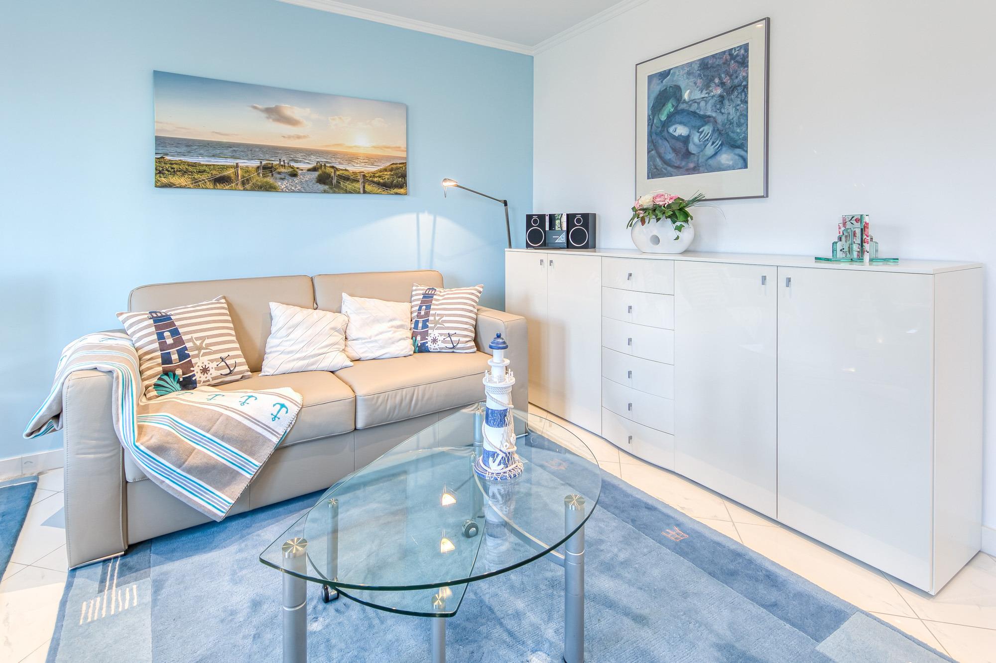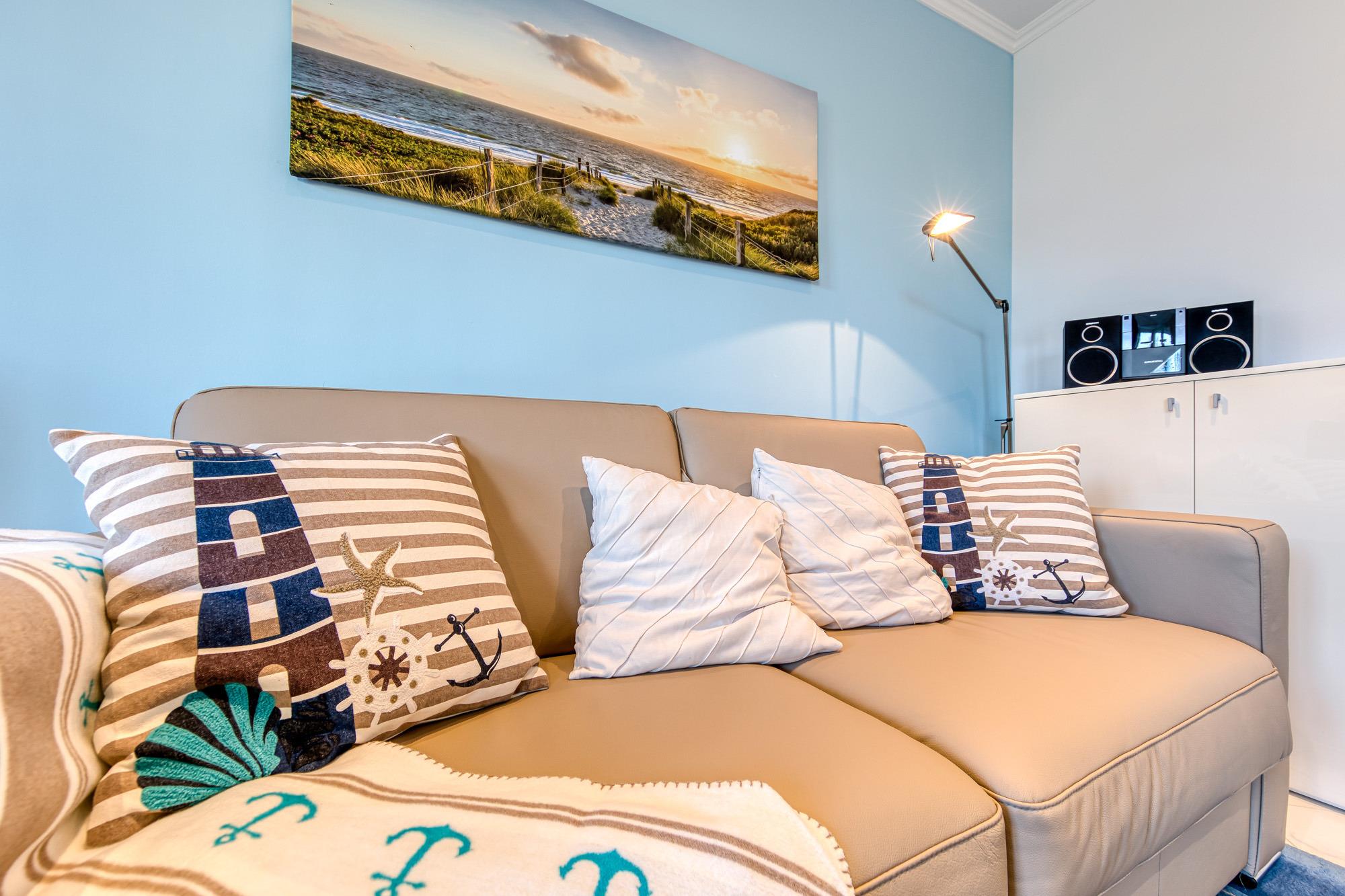 In der Timmendorfer Strand Ferienwohnung erwartet Sie ein großzügig geschnittenes 2-Zimmer-Appartement in der 3. Etage für bis zu 4 Personen. Das große Wohnzimmer verfügt über eine Leder-Couchgarnitur, eine Doppelbett-Schlafcouch, Flatscreen-TV, Stereoanlage, gemütliche Essecke, sowie eine separate Einbauküche, die mit Induktionskochfeld und Geschirrspüler eingerichtet ist. Zustätzlich steht Ihnen eine Senseo Kaffeemaschine zur Verfügung.