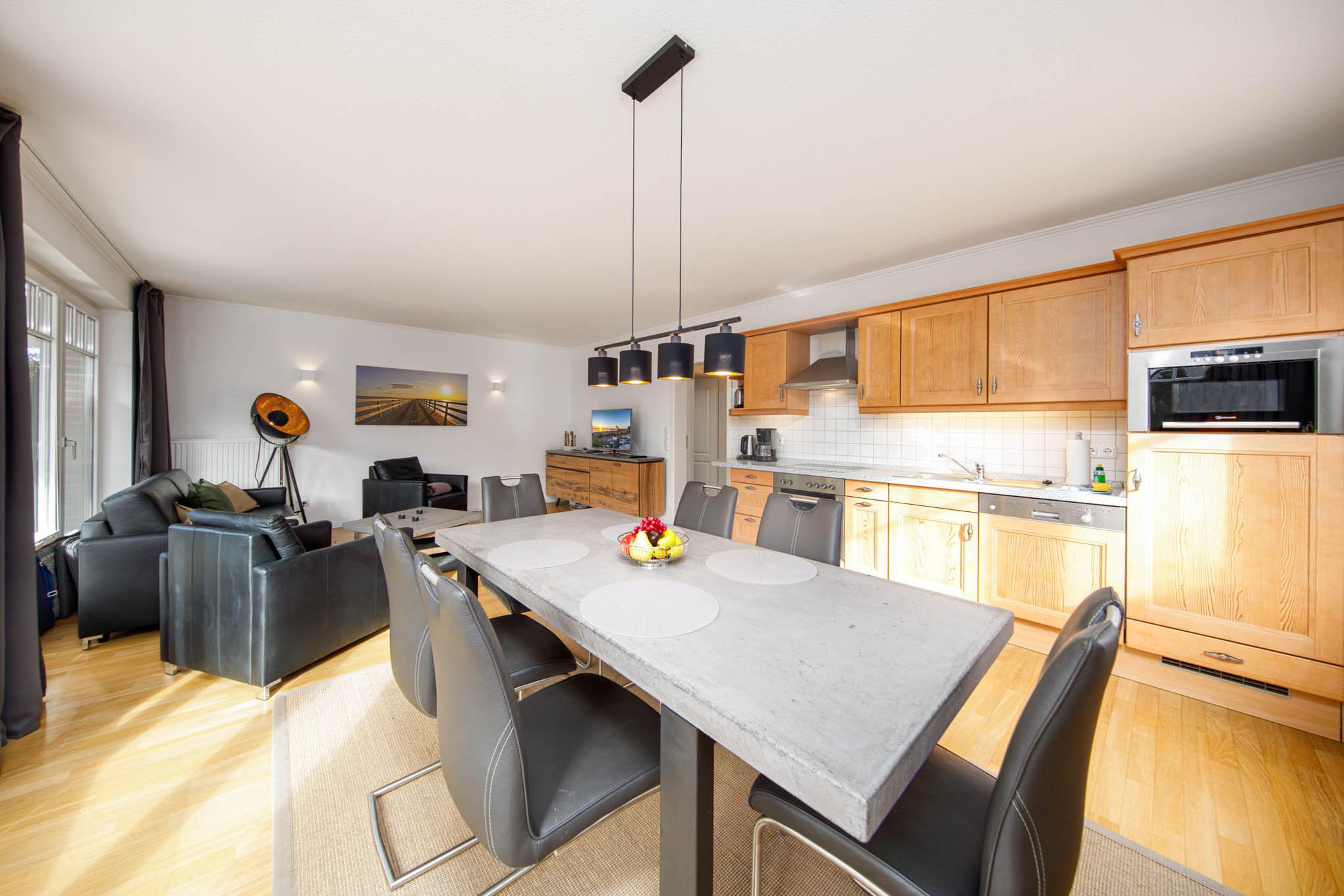 Die Ferienwohnung Timmendorfer Strand erstreckt sich über eine Wohnfläche von 60qm und ist für 4 Personen geeignet. Sie verfügt über einen kombinierten Wohn-Schlafbereich mit einer Doppelschlafcouch in Leder, Flat ScreenTV und Bose SoundTouch Anlage sowie gemütlichen Essecke. Die offene, angrenzende Pinienholz-Einbauküche verfügt über Ceranfeld, Backofen, Mikrowelle und Geschirrspüler.