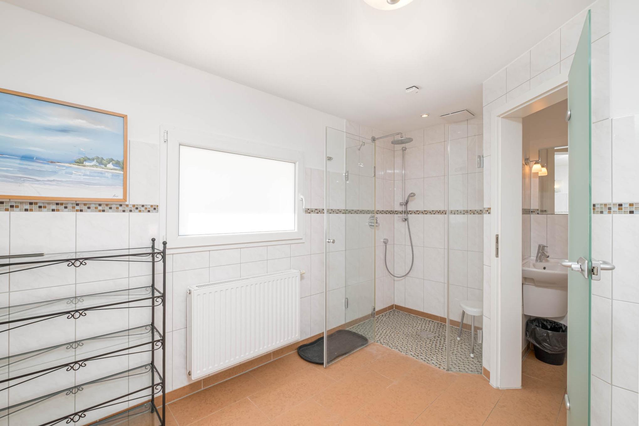 Das große Badezimmer verfügt über eine bodengleiche Dusche sowie ein separates WC.