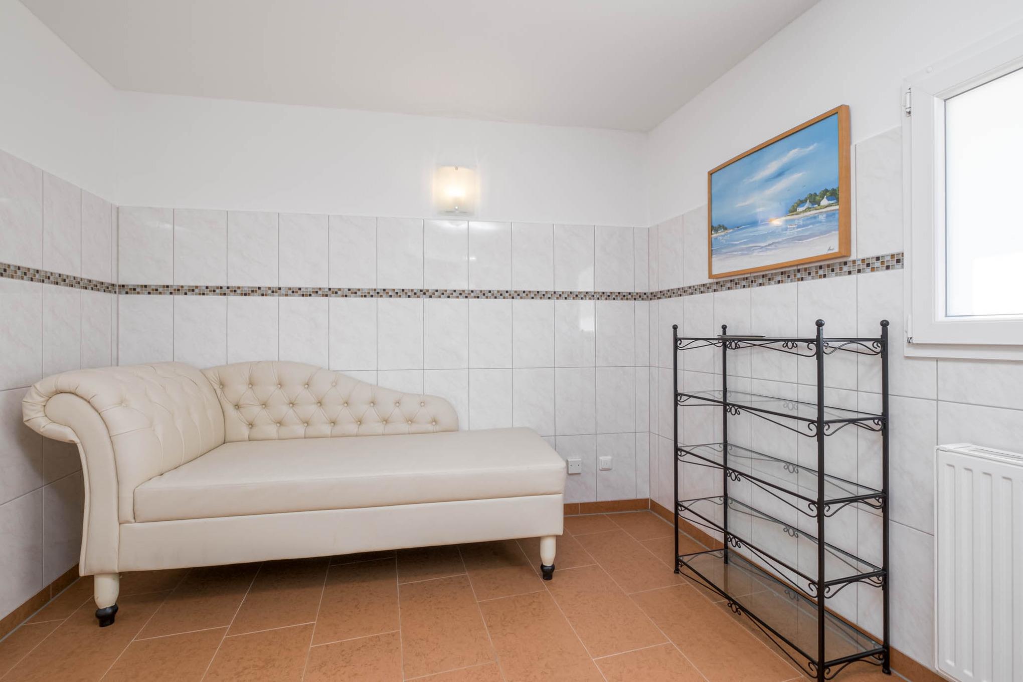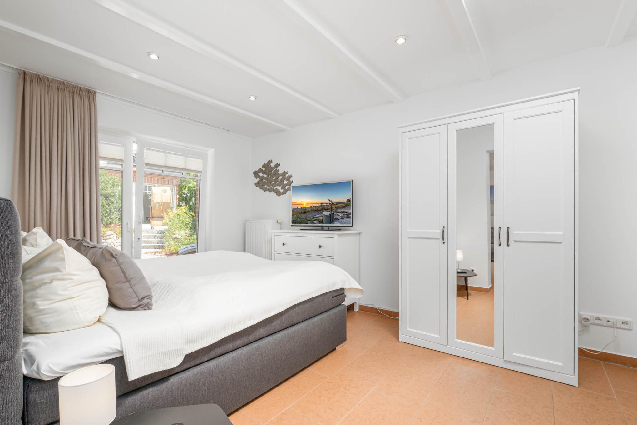 Der Schlafbereich ist mit einem hochwertigen Boxspringbett (180x200cm) sowie einem zusätzlichem TV ausgestattet. Zwischen Schlaf- und Wohnbereich befindet sich keine Tür.