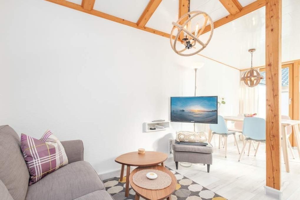 Das Wohnzimmer ist mit einem Couchbereich, Flatscreen-TV, einem großzügigen Essbereich und komplett eingerichteter Küche ausgestattet. Die Küche verfügt über die modernsten Geräte, wie z.B. Cerankochfeld, Backofen und Geschirrspüler.