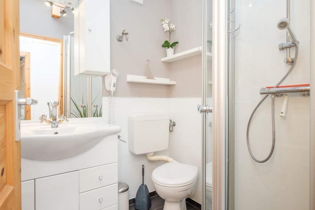 Im Badezimmer erwartet Sie eine bodengleiche Dusche.