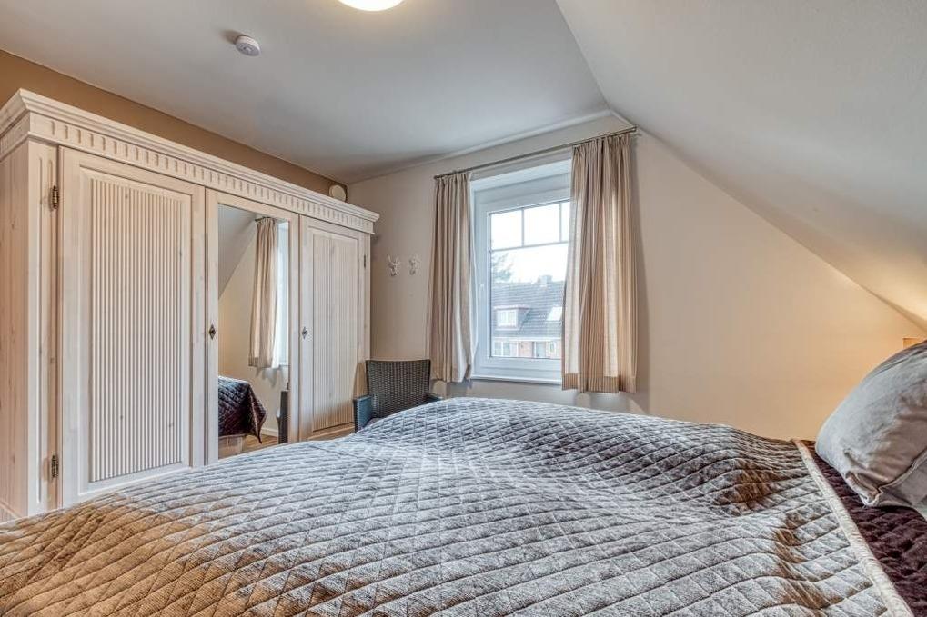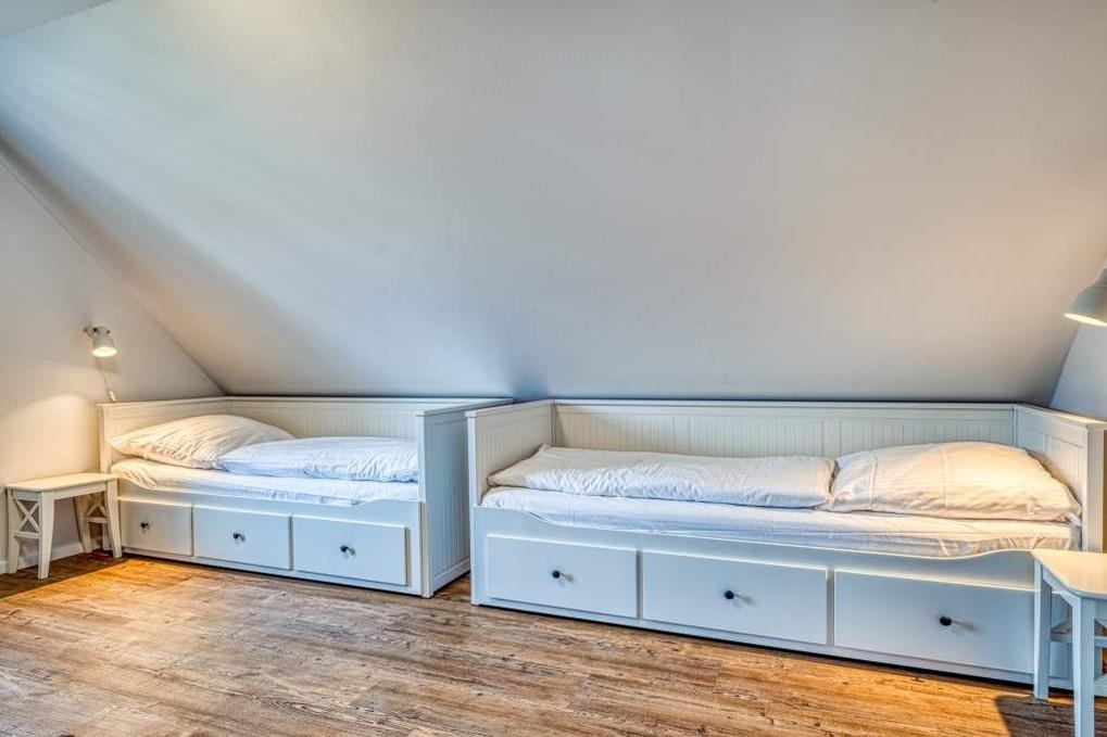 Im ersten Obergeschoss, das Sie über die toll gestaltete Diele erreichen, befinden sich die drei separaten Schlafzimmer. Zwei davon sind jeweils mit einem Doppelbett ausgestattet, eines mit zwei komfortablen Einzelbetten. In dem einen Schlafzimmer mit Doppelbett sowie in dem mit den Einzelbetten steht Ihnen darüber hinaus ein weiterer Flachbild-TV zur Verfügung.