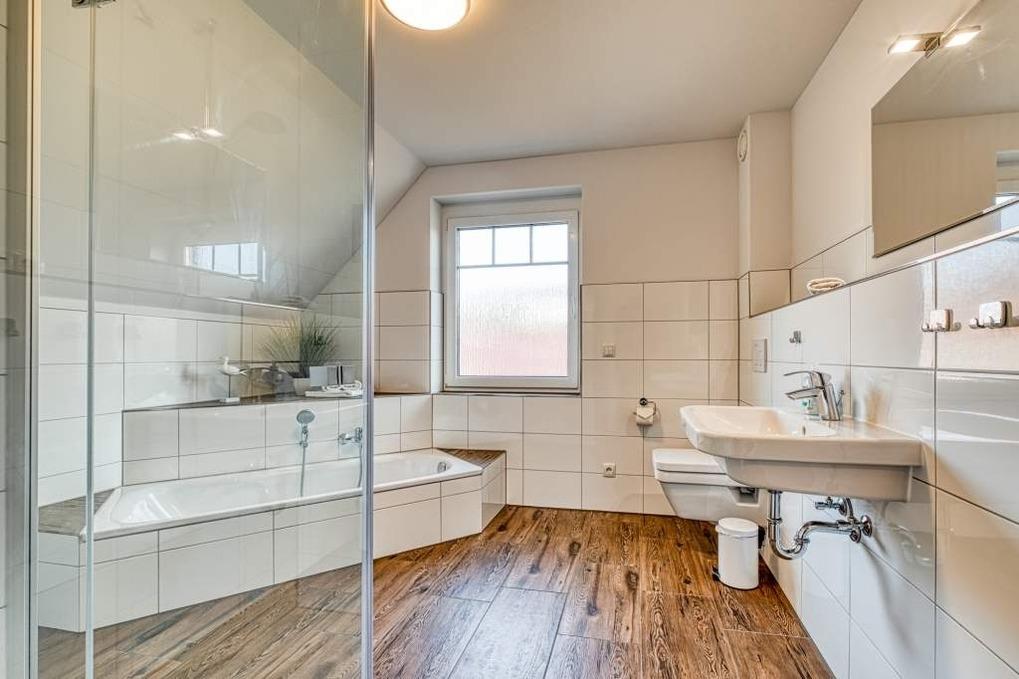 Auch das große Badezimmer mit ebenerdiger Dusche, Badewanne und Waschmaschine befindet sich auf der ersten Etage des Ferienhauses 'Der kleine Friese'.