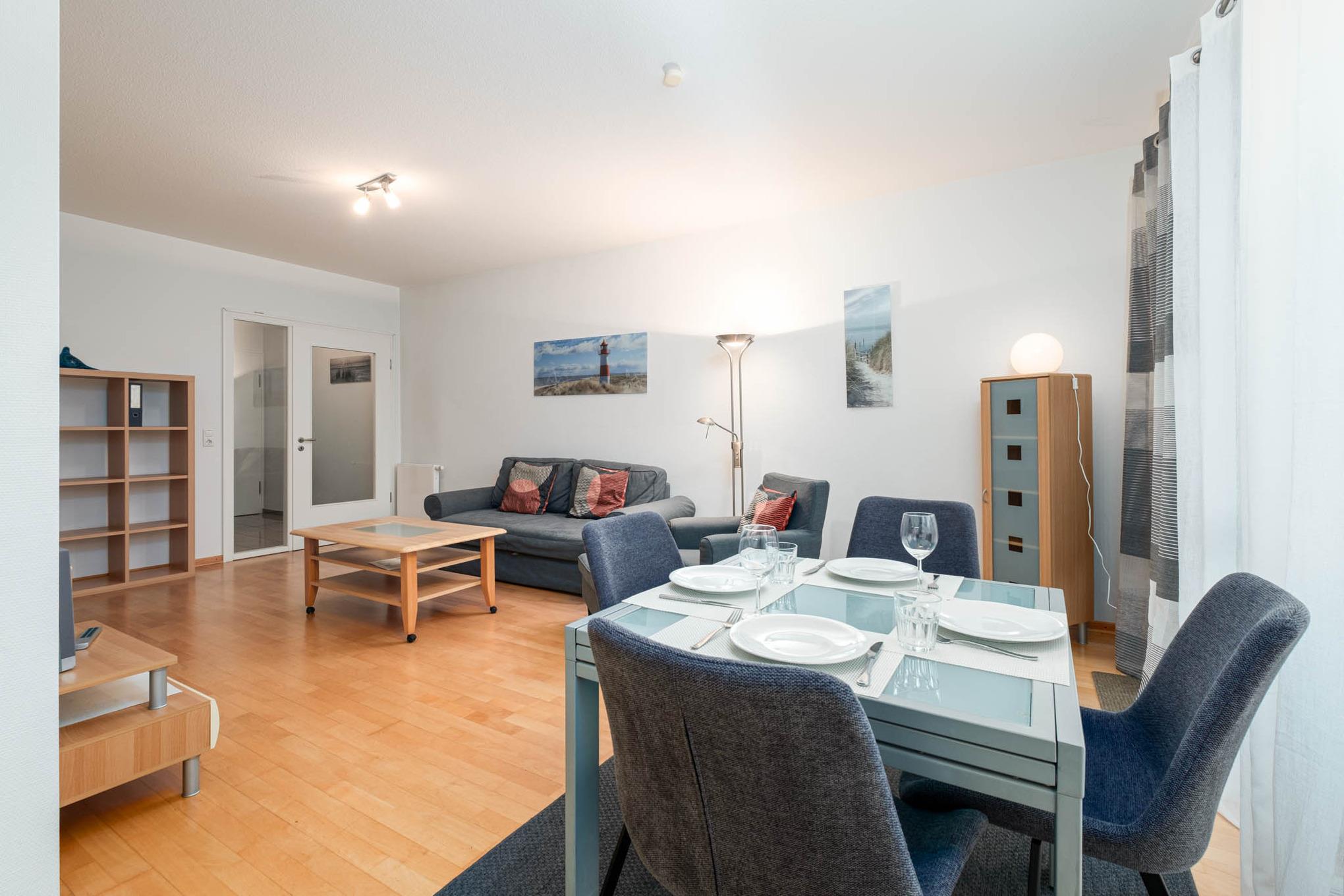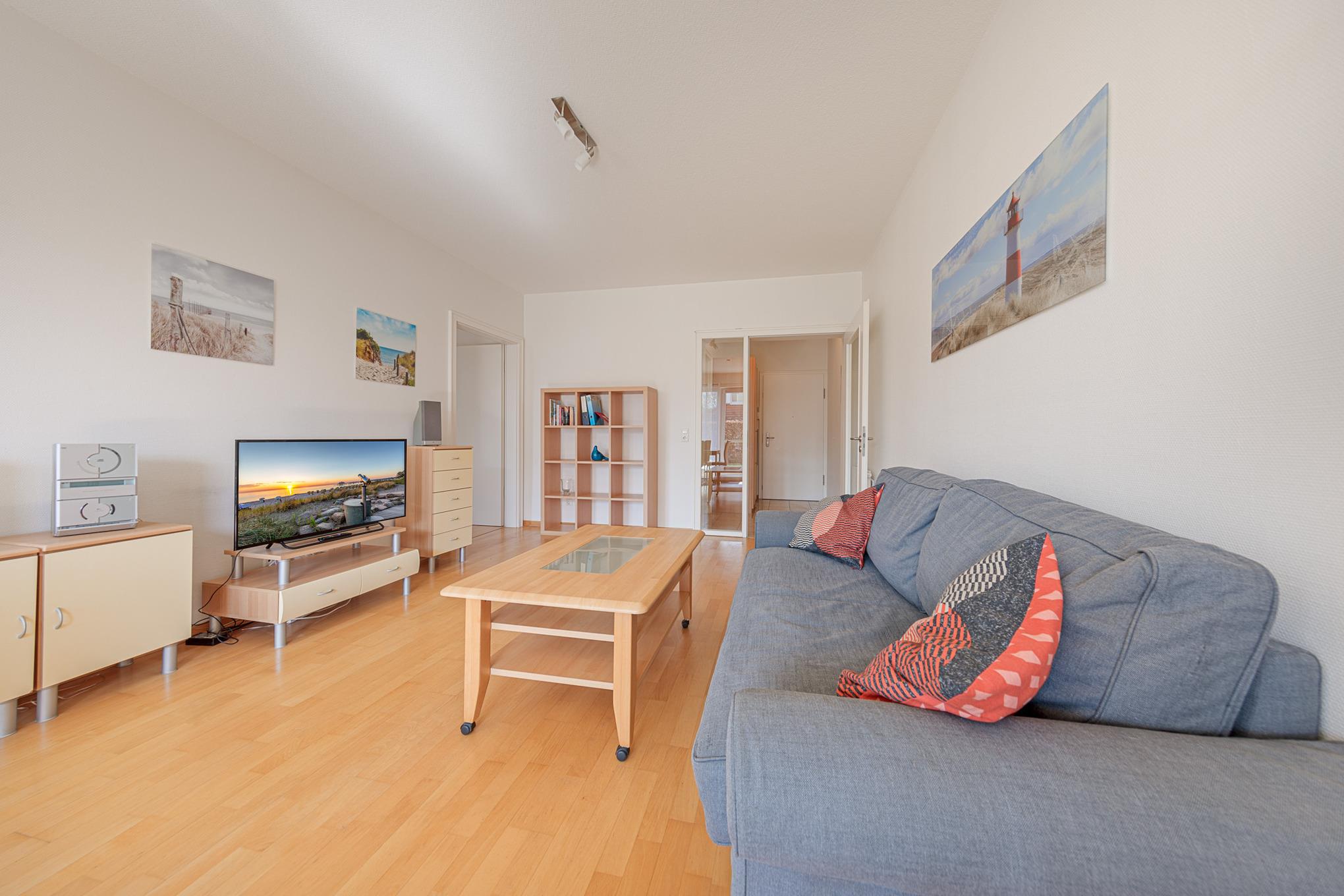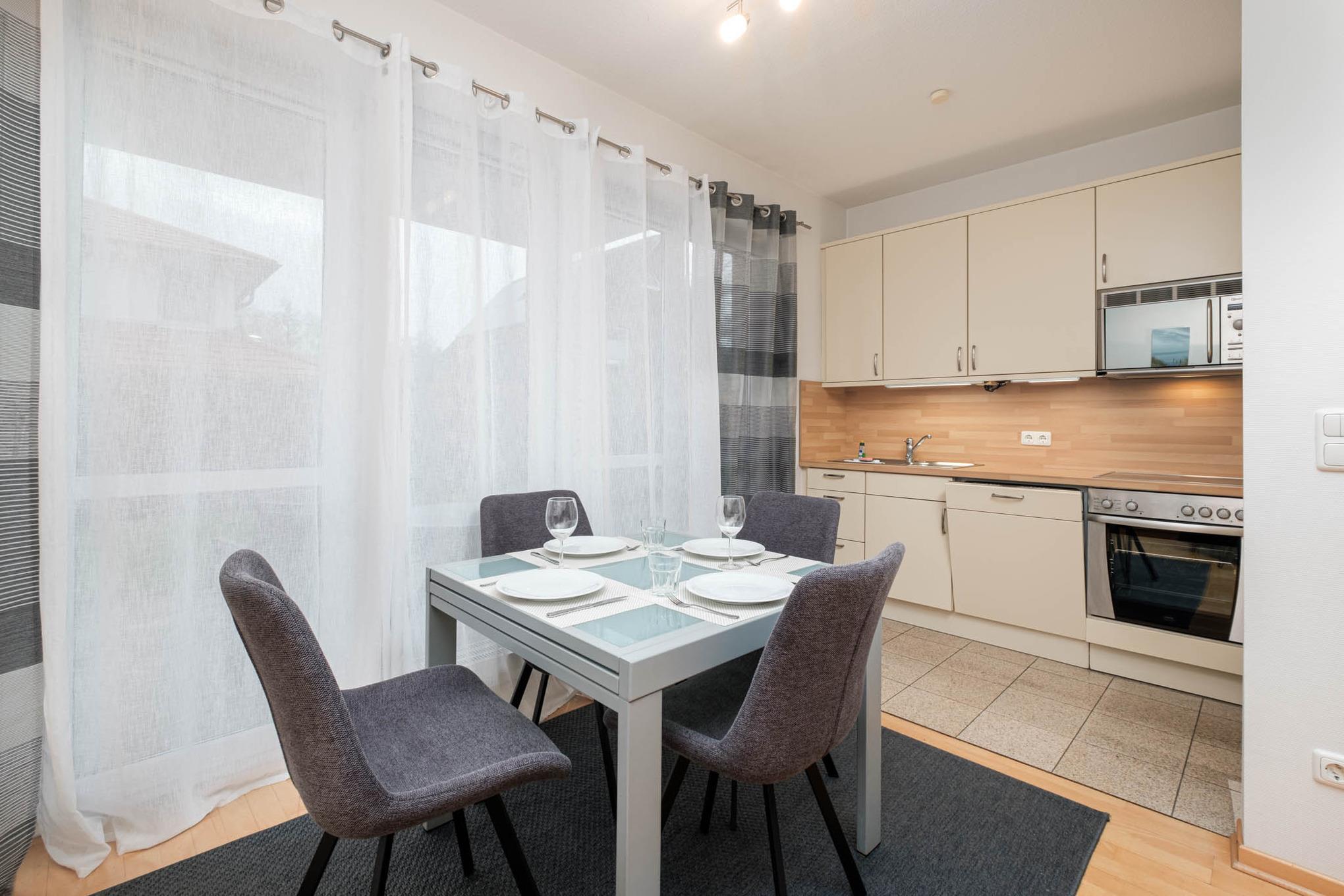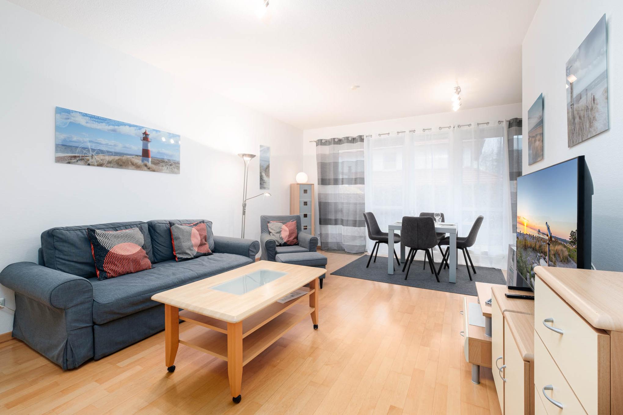 In der Ferienwohnung Nr. 3 erwartet Sie ein modernes Appartement für maximal 4 Personen + Hund in ruhiger Lage. Das Wohn-/Schlafzimmer der Timmendorfer Strand Ferienwohnung verfügt über eine moderne, bequeme Ausziehcouch (160x200), Flatscreen-TV, Stereo-Anlage, eine helle Essecke sowie einen komplett eingerichteten Küchenbereich mit Cerankochfeld, Backofen, Mikrowelle und Geschirrspüler.