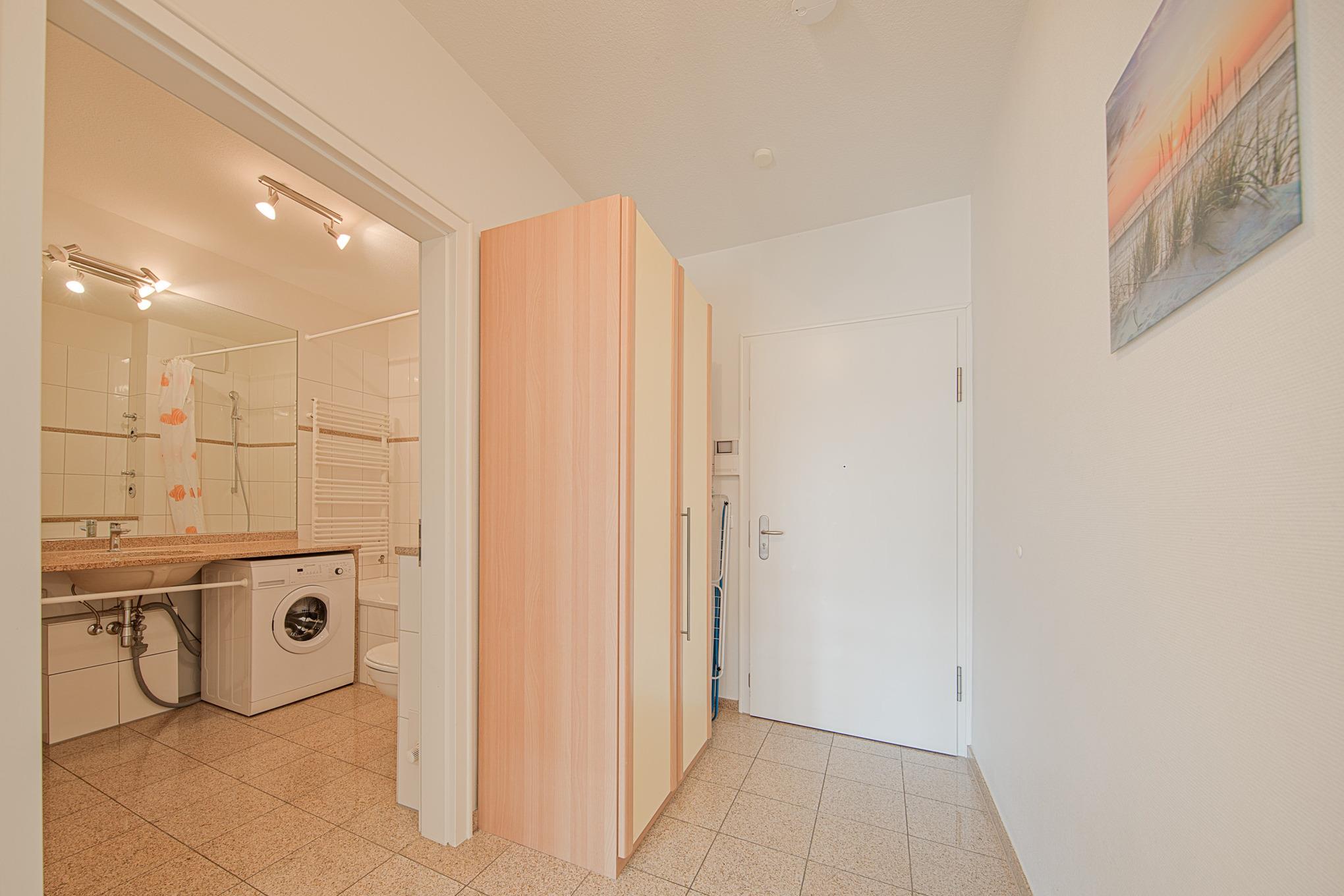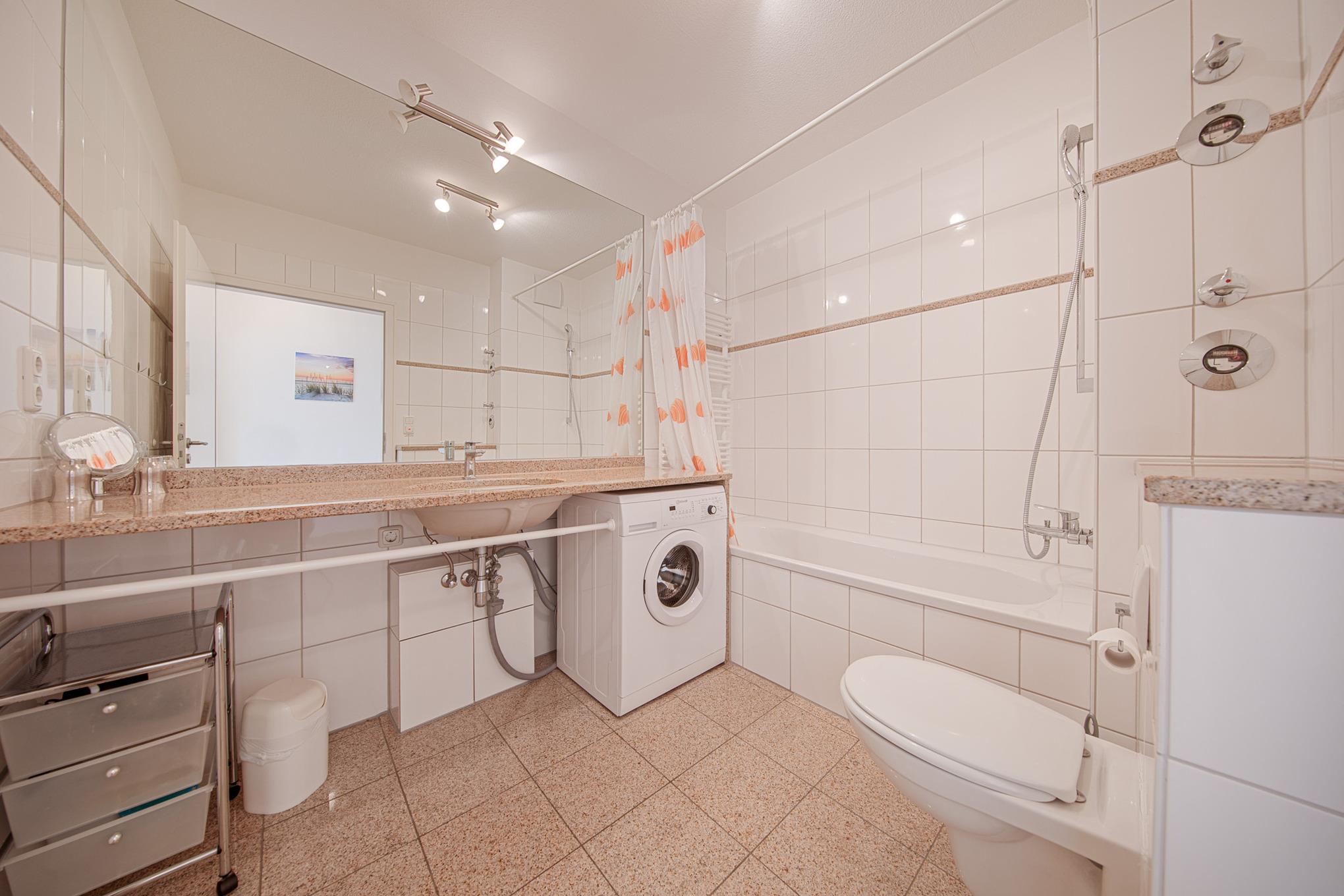 Das separate Schlafzimmer ist mit einem Doppelbett (160x200 cm) und einem Kleiderschrank eingerichtet. Das Badezimmer ist mit einer Badewanne mit Duschvorrichtung, einem großen Waschtisch, WC und einer Waschmaschine ausgestattet. Die Waschmaschine darf von den Gästen kostenlos genutzt werden. Die möblierte Terrasse rundet diese ca. 50qm große Ferienwohnung Timmendorfer Strand ab.