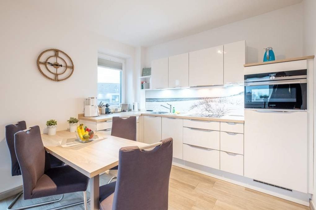 Das gemütliche Wohnzimmer der Timmendorfer Strand Ferienwohnung verfügt über eine hochwertige Couchgarnitur, einen Flatscreen-TV, einen Blue-Ray-Player und eine Sound-Musikanlage, über die Sie auch Ihre eigene Musik von Ihrem Mobiltelefon abspielen können. In einer mit einer Schaukelliege eingerichteten Leseecke können Sie es sich nicht nur an Regentagen gemütlich machen. Die Essecke verbindet den Wohnbereich mit der offenen Einbauküche. Diese ist mit Ceranfeld, Backofen-/Mikrowellenkombination und Geschirrspüler ausgestattet. Sowohl eine Filter- als auch Nespresso-Espressomaschine, ein Milchaufschäumer und ein Eierkocher runden das Angebot ab.